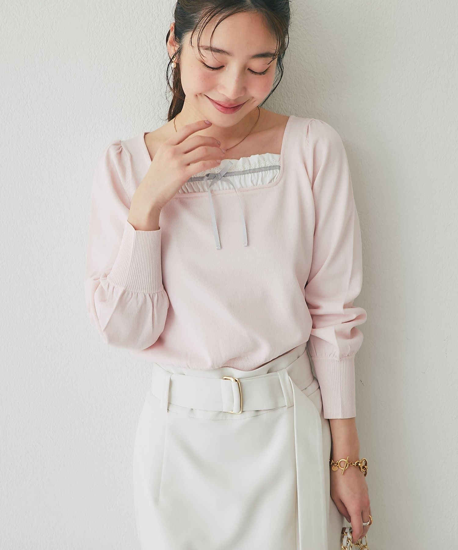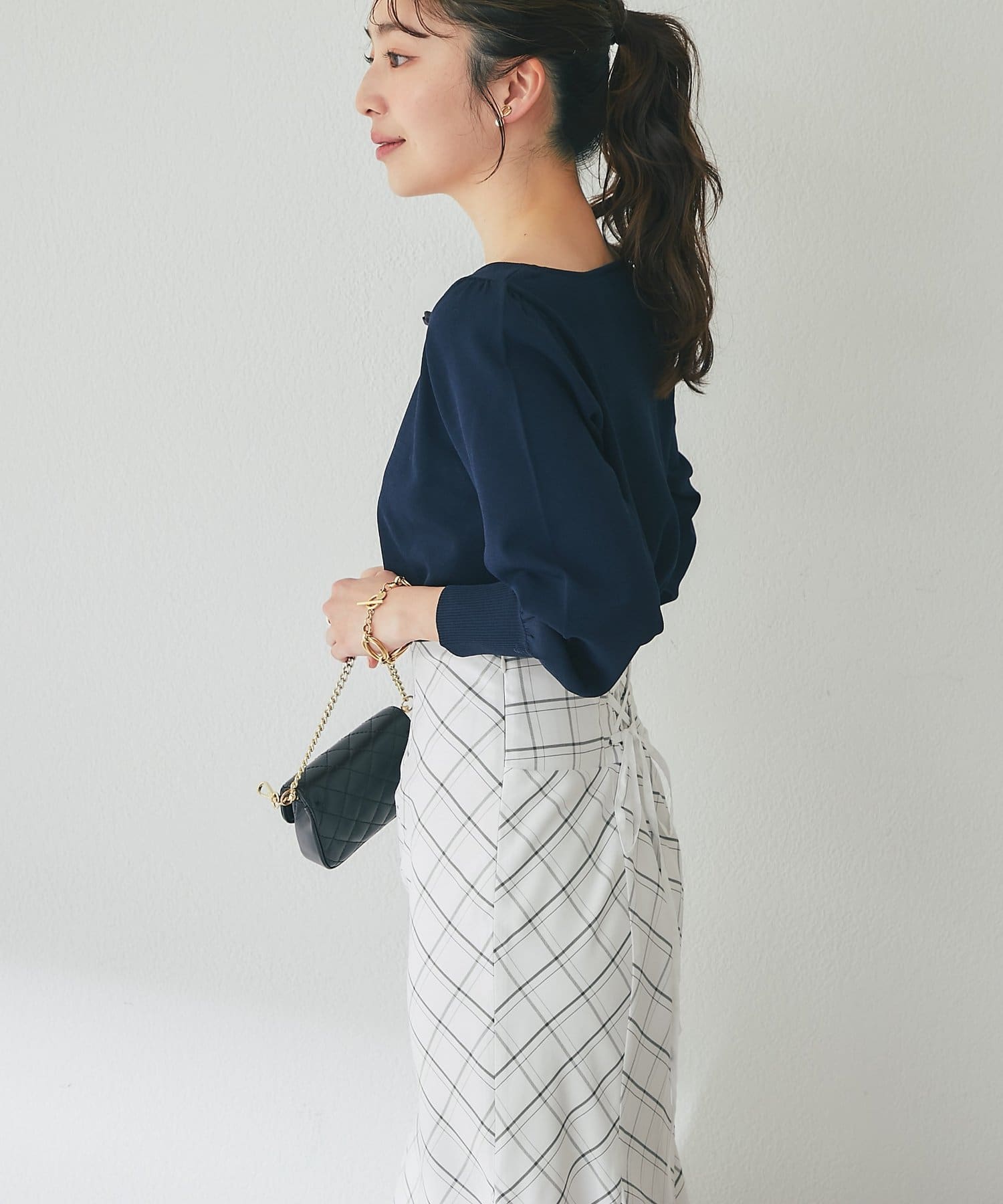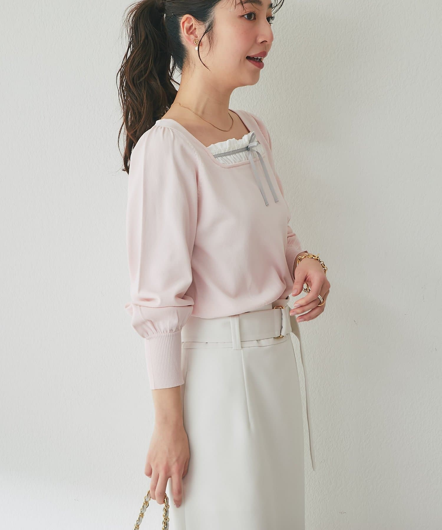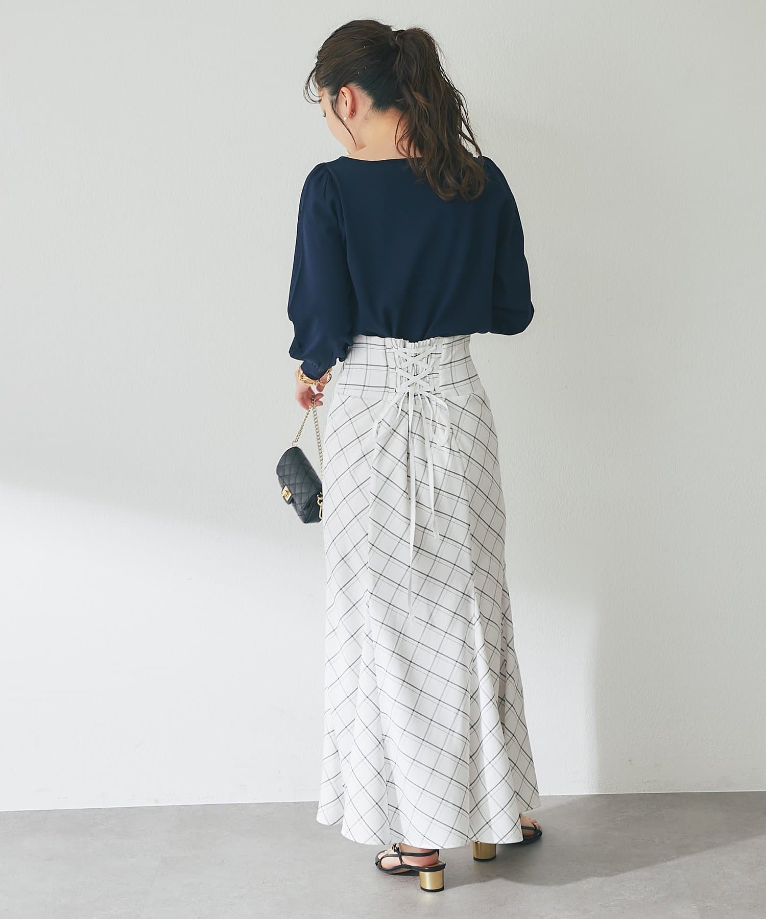 フレアスカートやマーメイドスカートと合わせると、フェミニンな印象をより楽しめます。