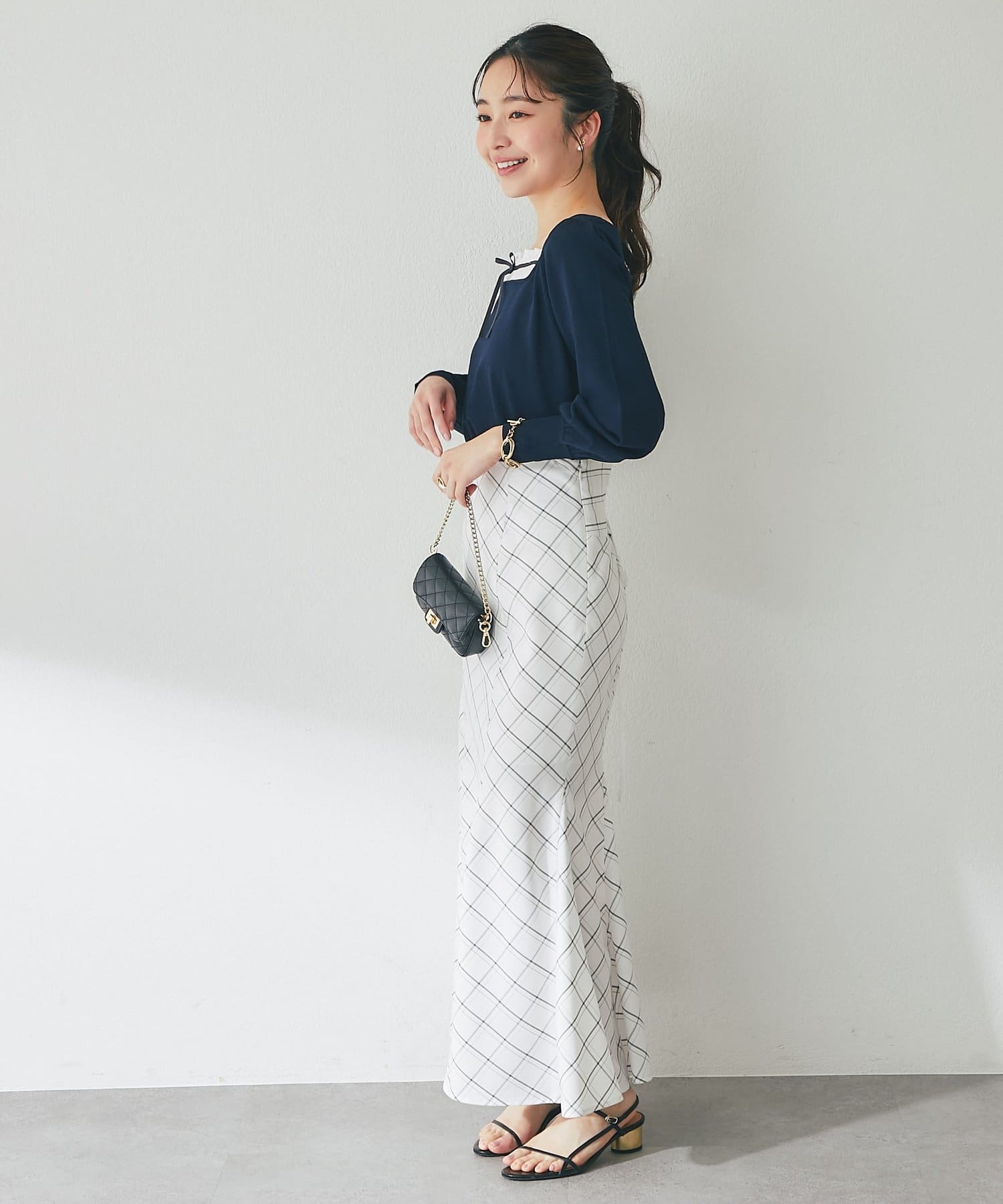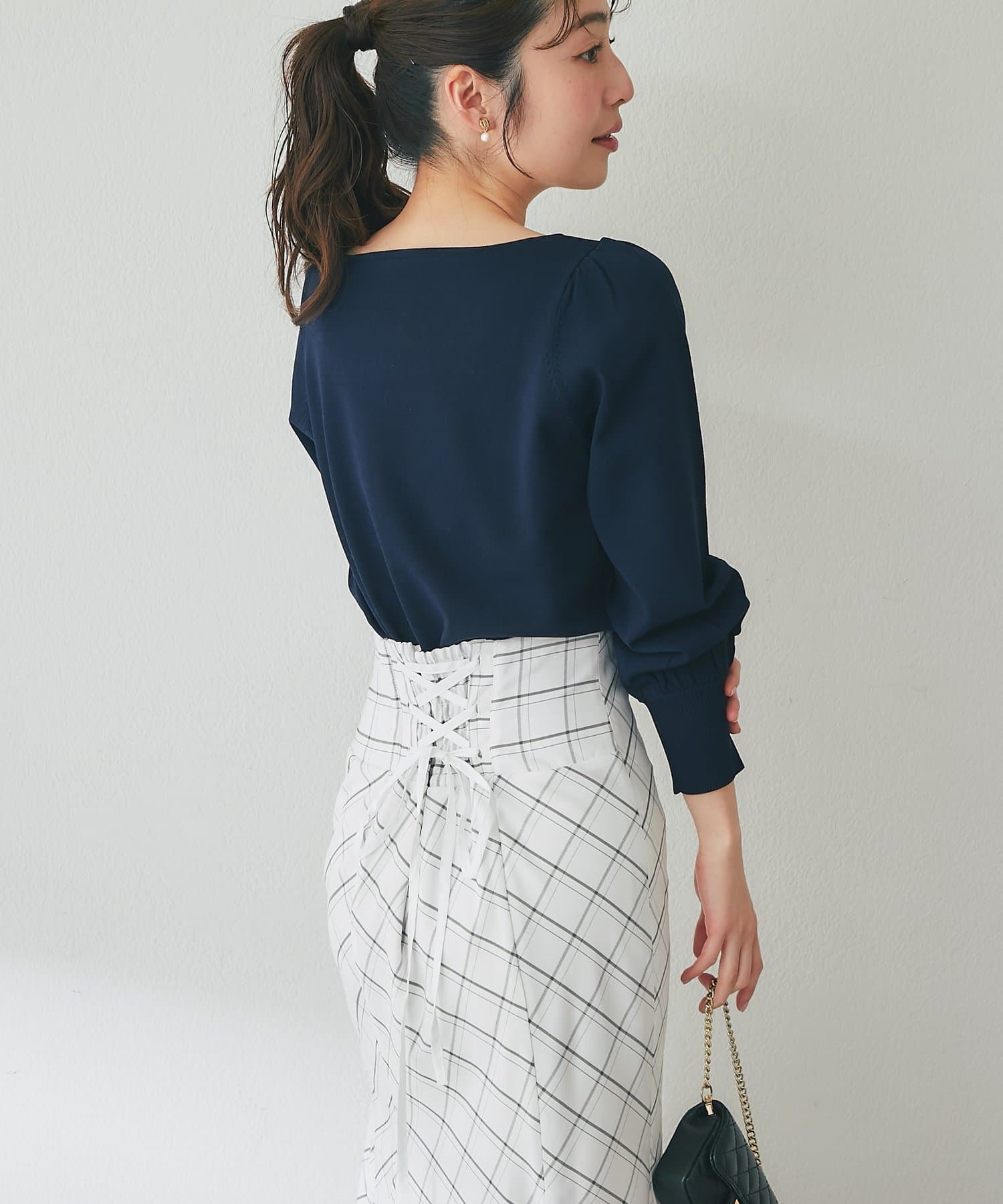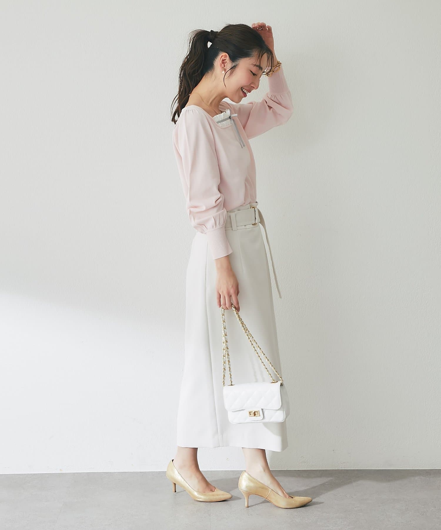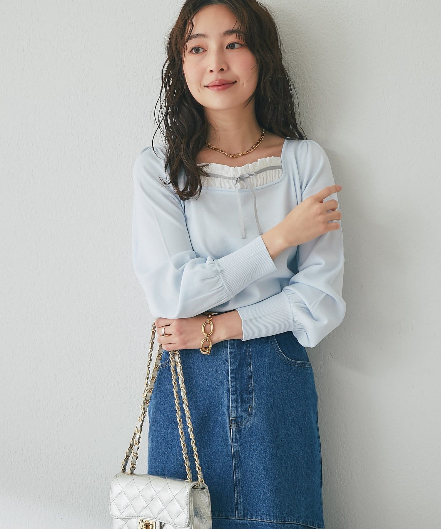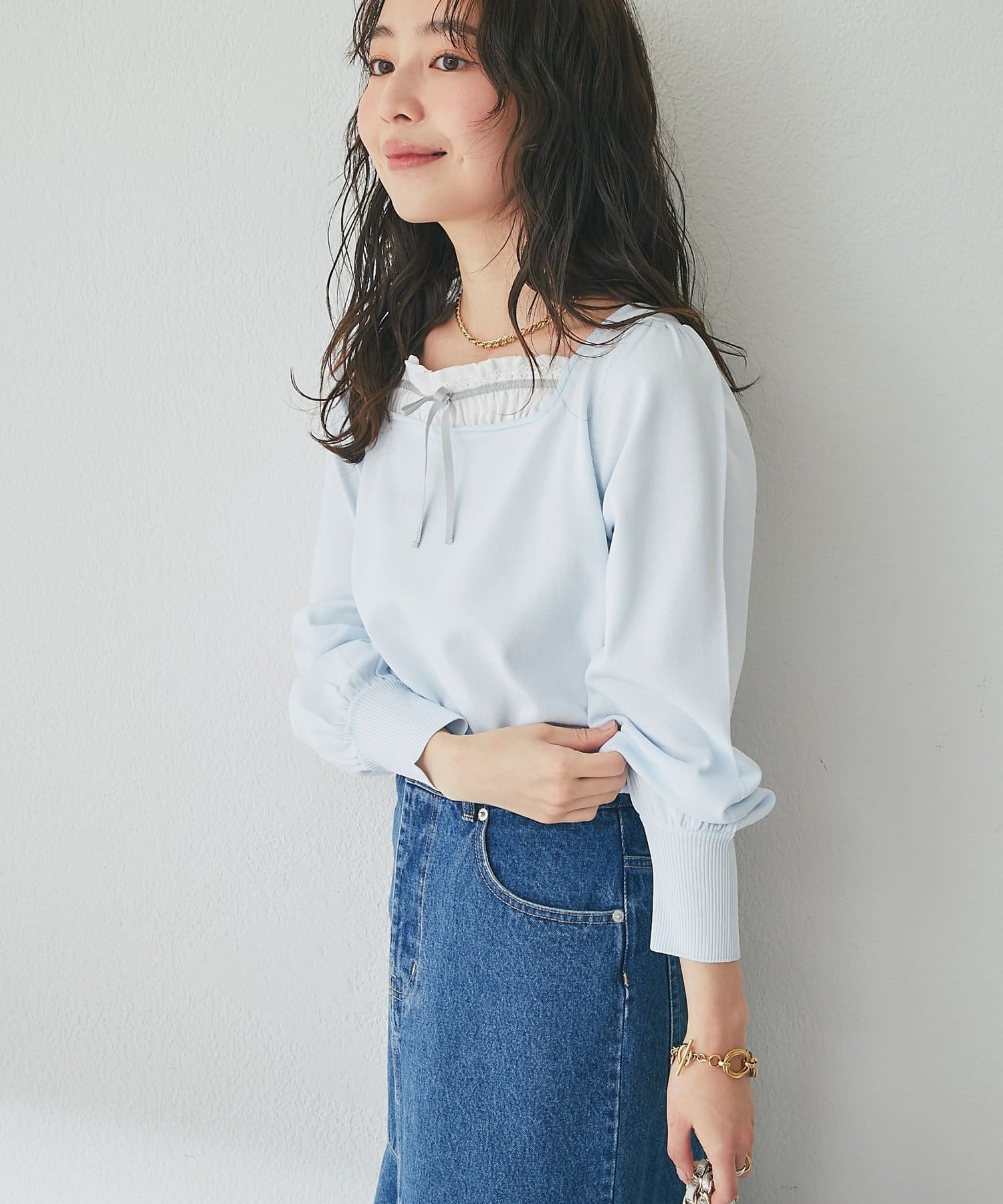 フレアスカートやマーメイドスカートと合わせると、フェミニンな印象をより楽しめます。