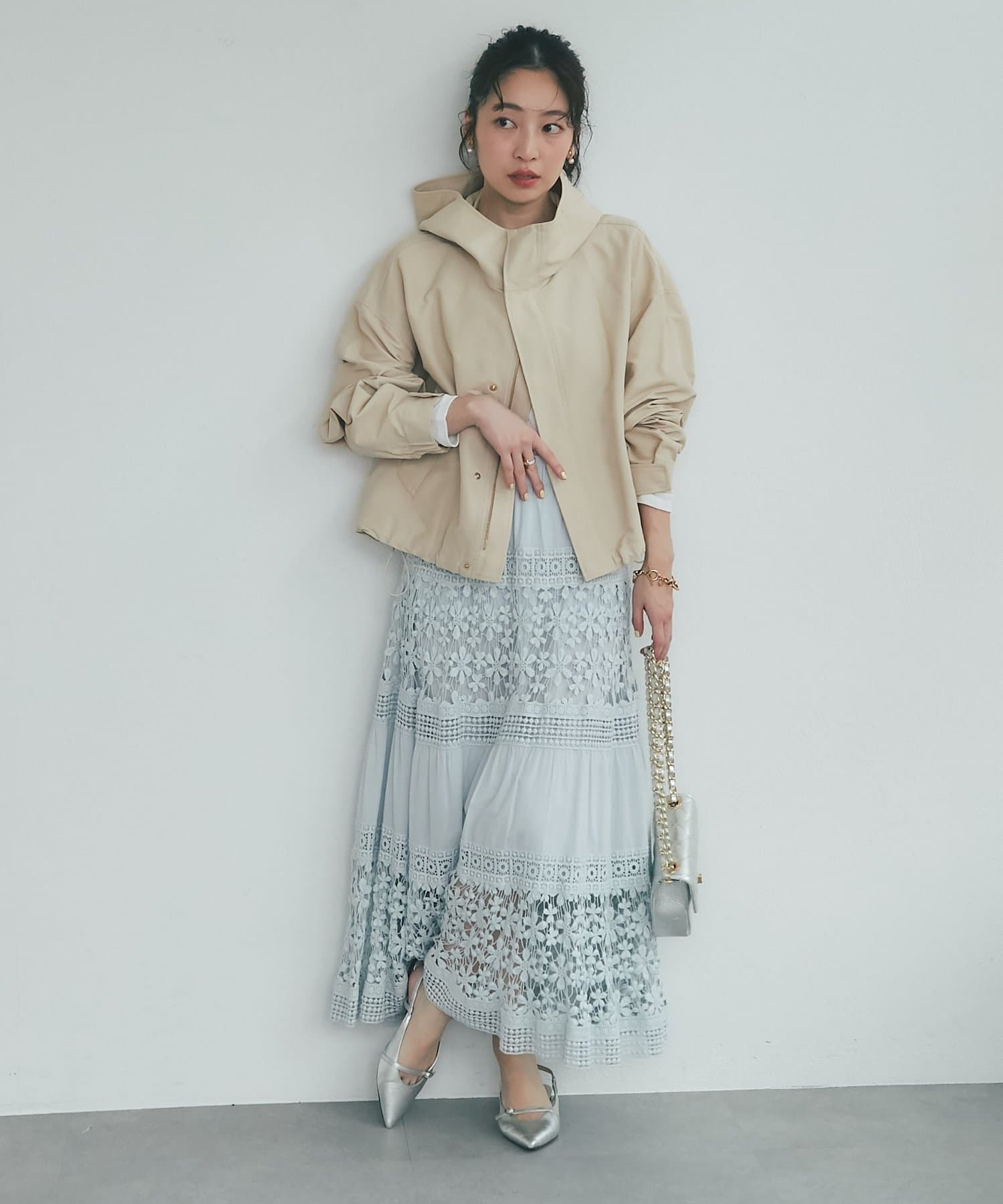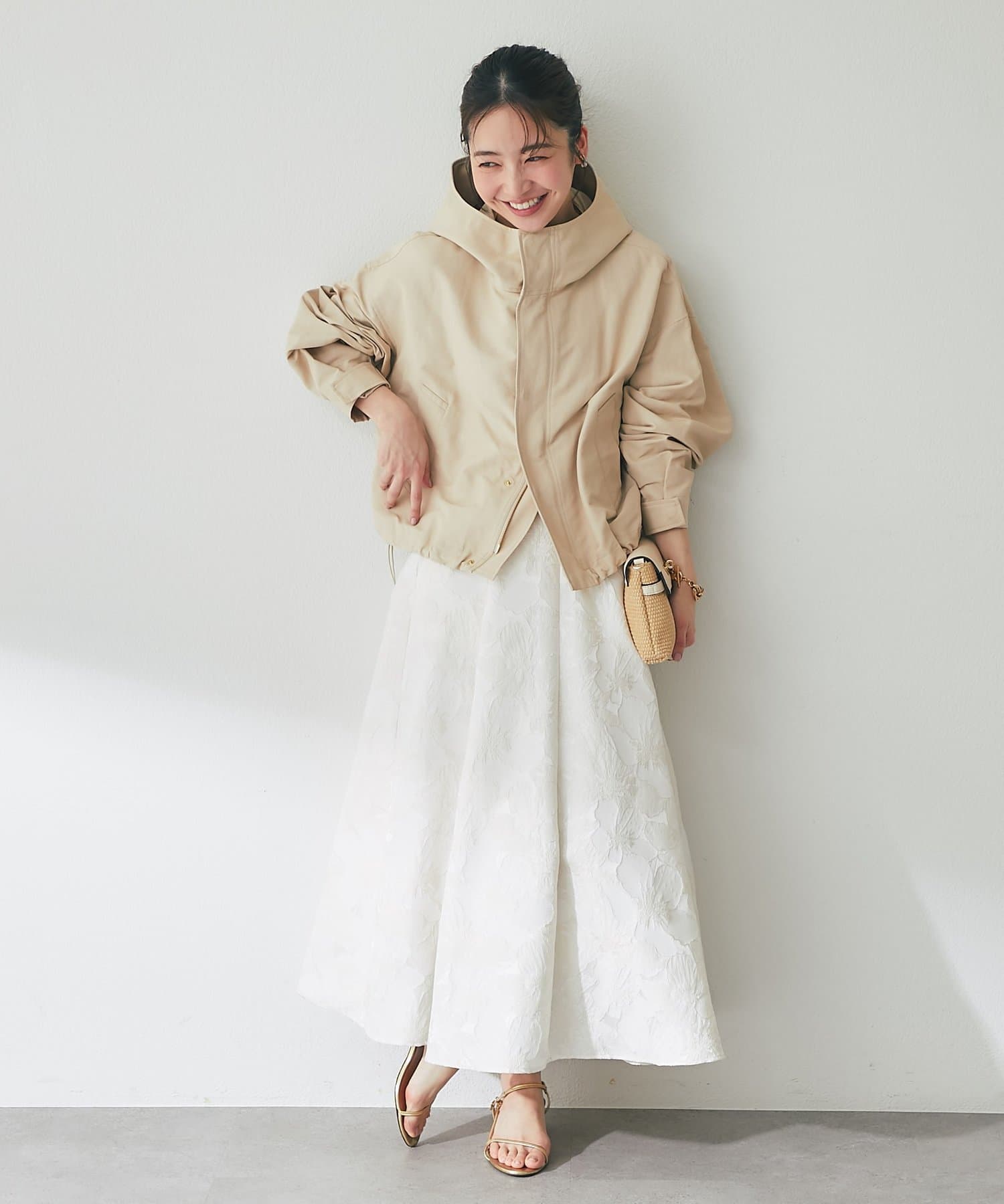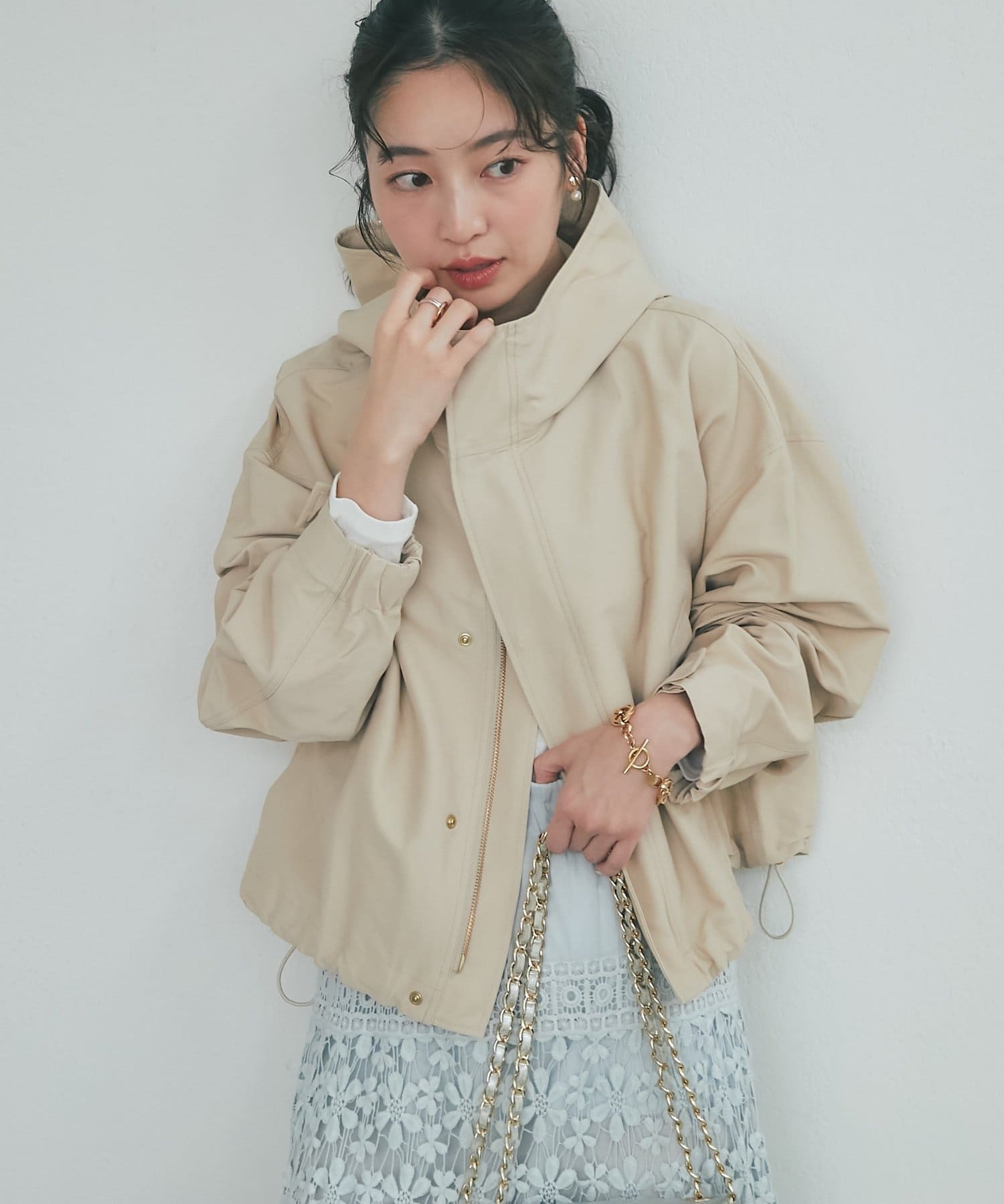 ワイドな身幅で抜け感がありつつ、高めの襟とフードで小顔効果も期待できます。