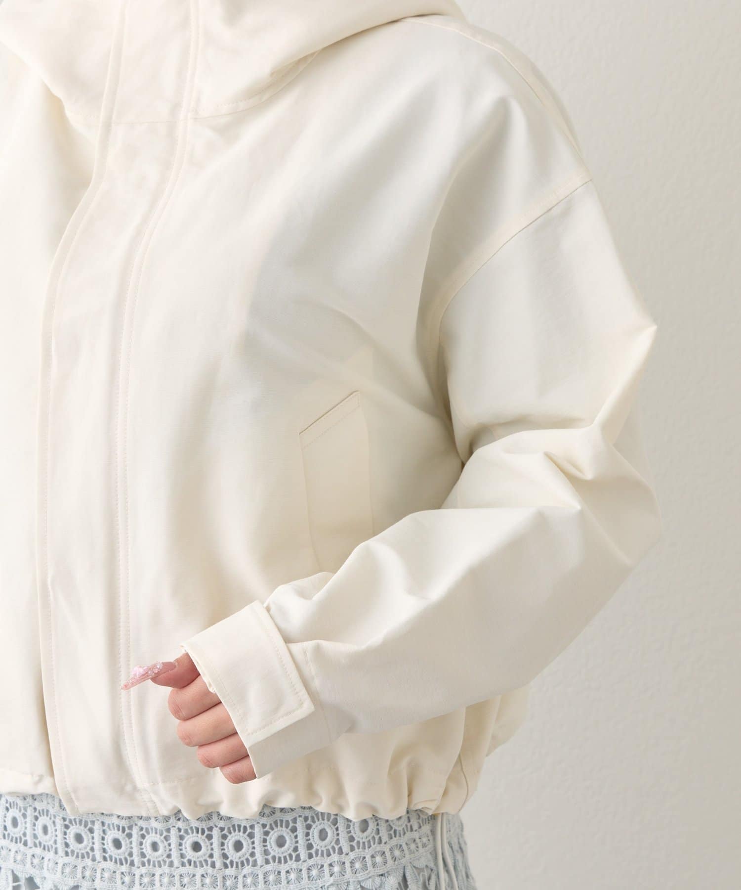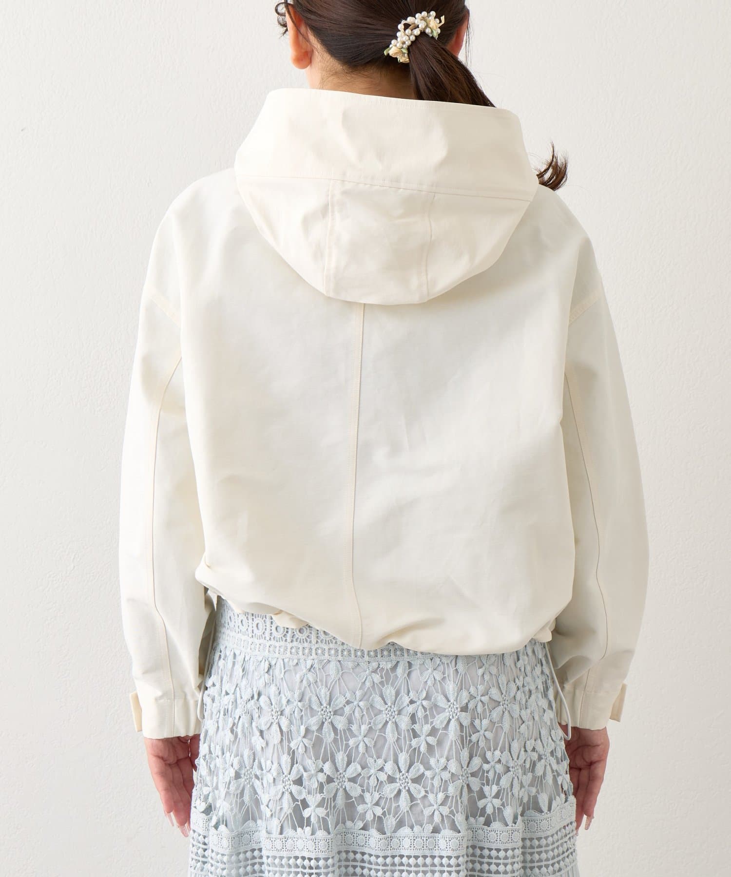 裾はドロストでバルーンシルエットに調整でき、袖口はドットボタンでフィット感を調節可能。