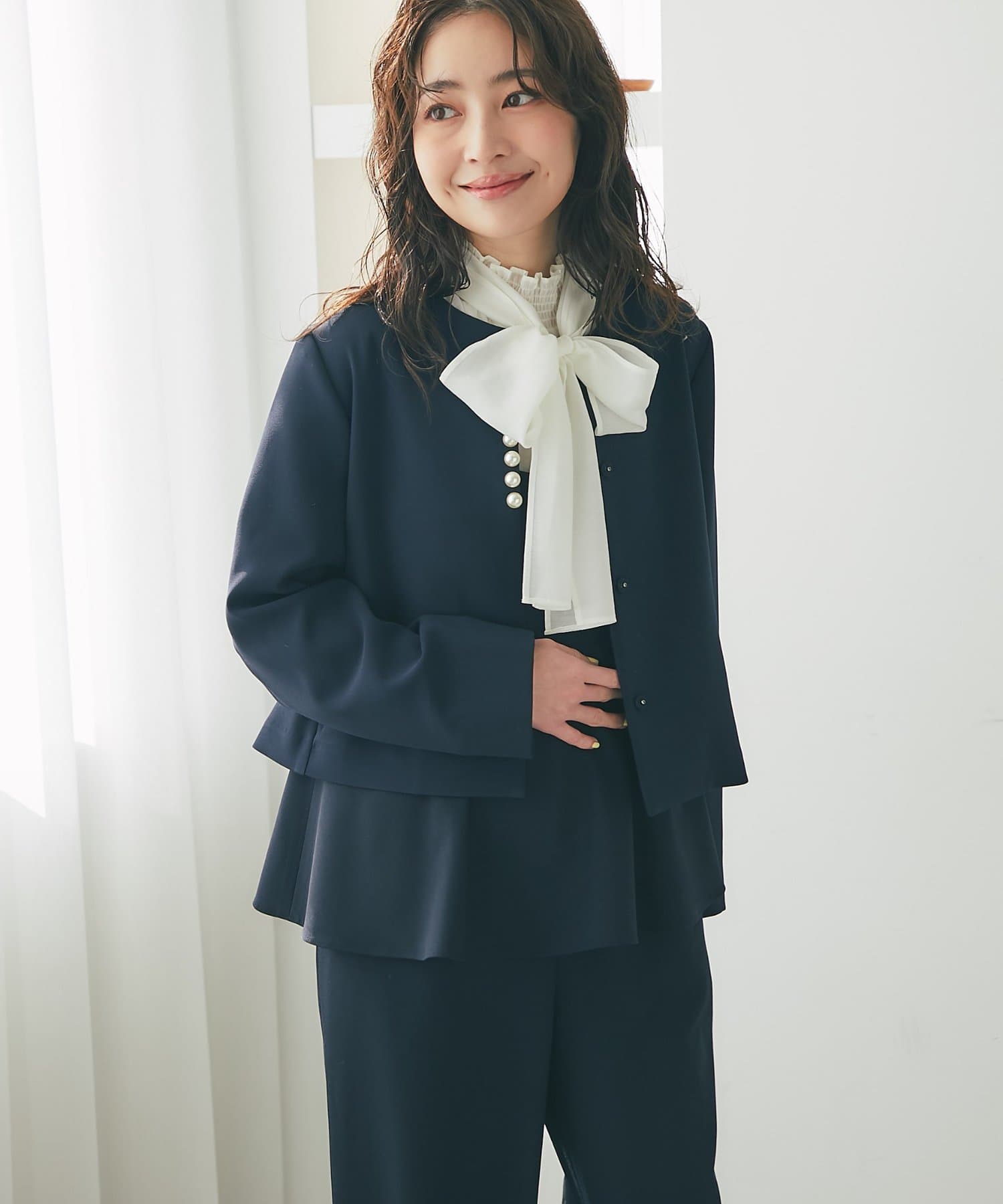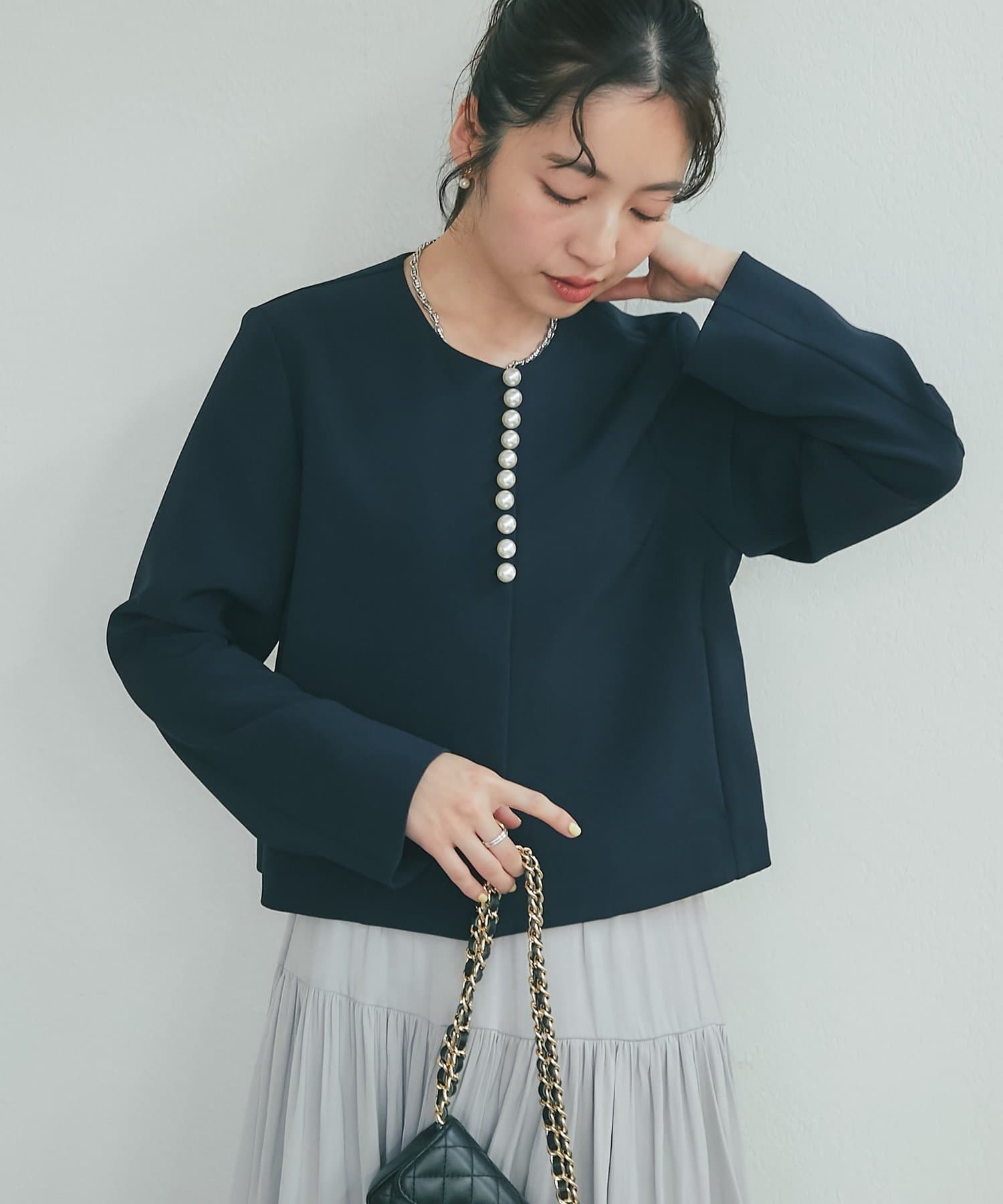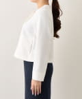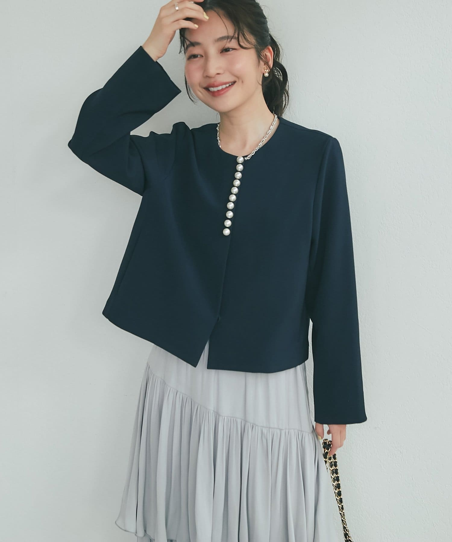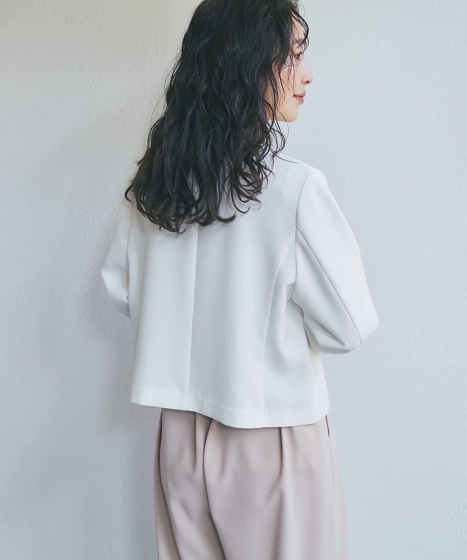 首元をすっきりと見せるノーカラーデザインは、ネックレスやスカーフとの相性も抜群。