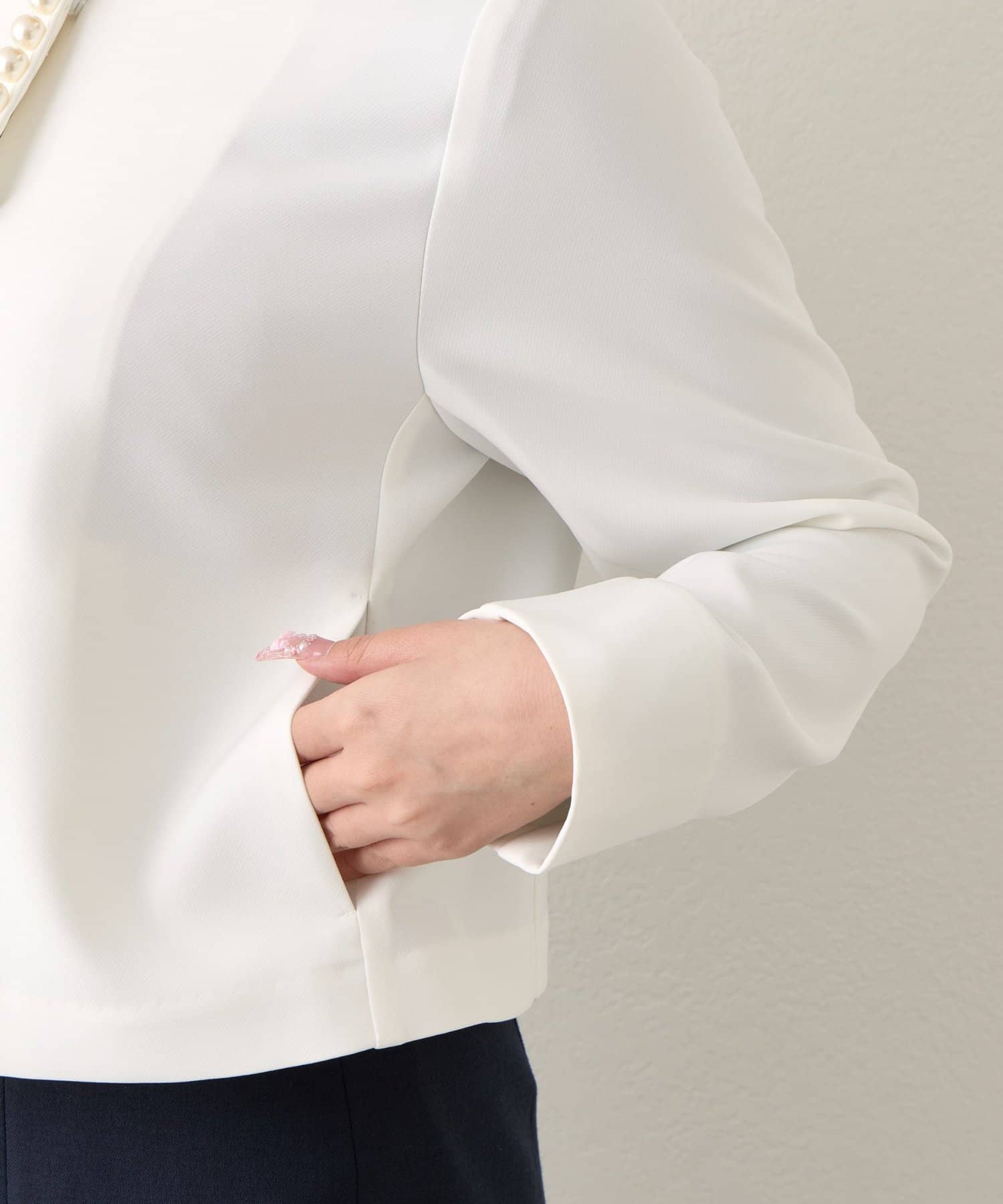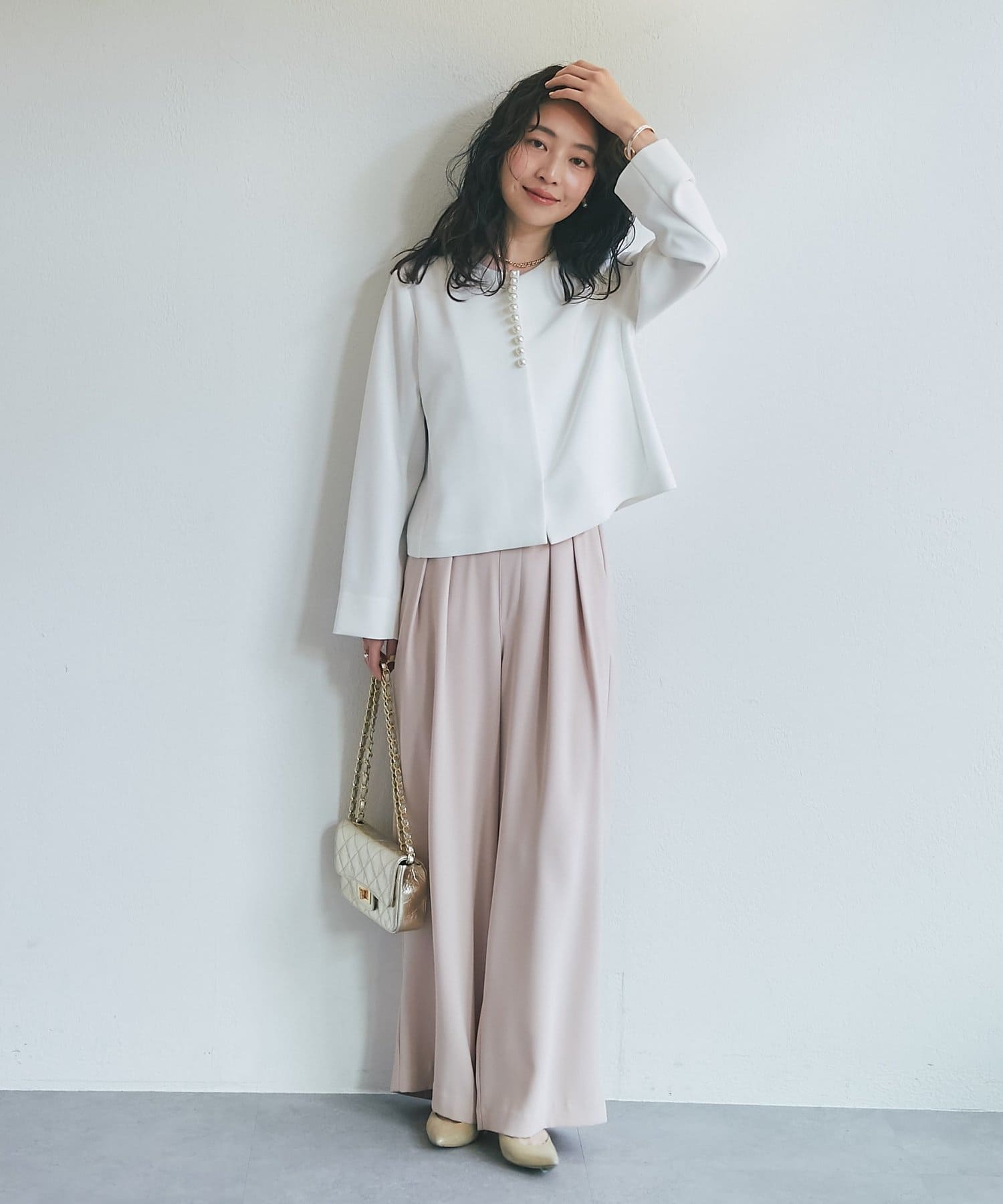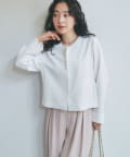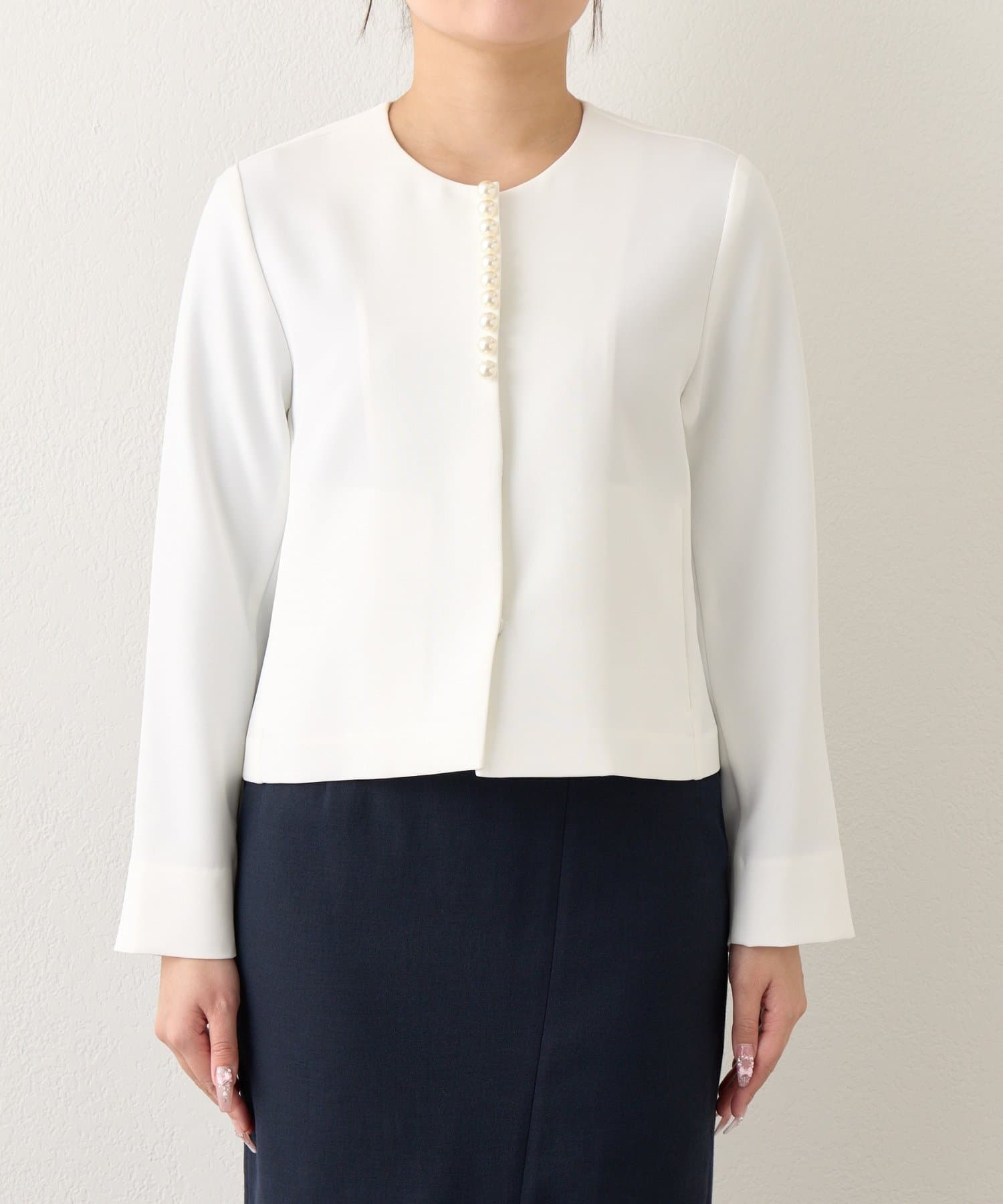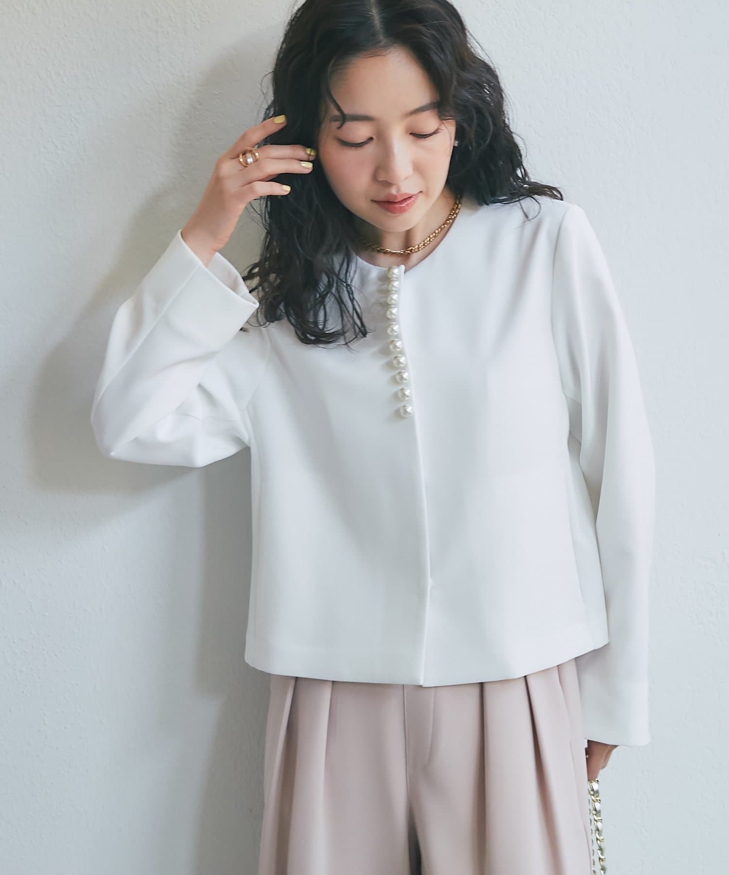 首元をすっきりと見せるノーカラーデザインは、ネックレスやスカーフとの相性も抜群。