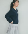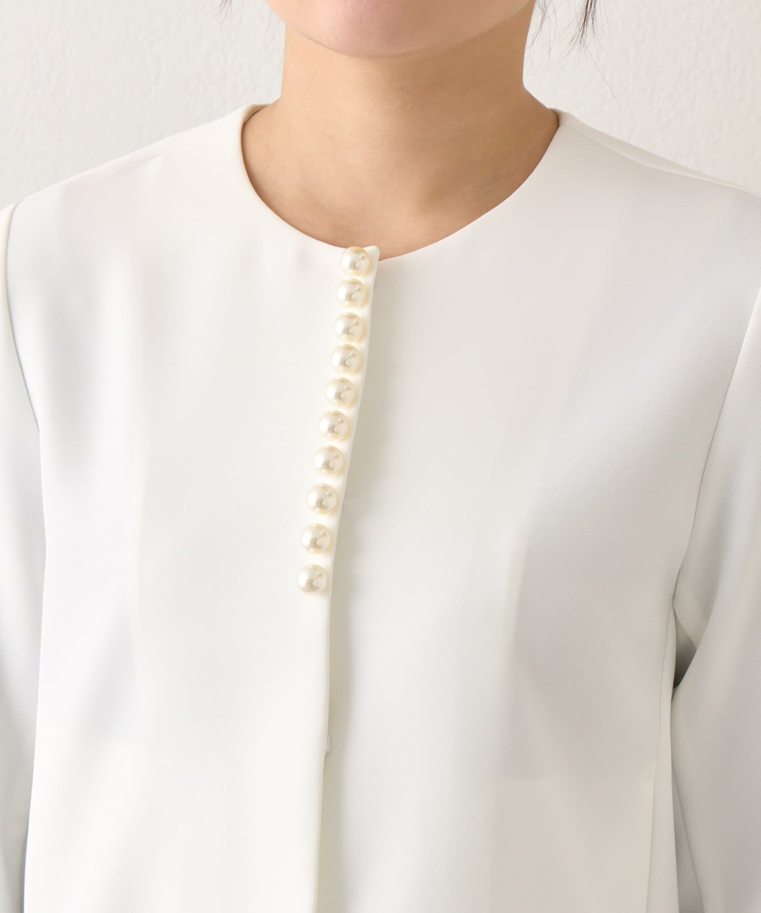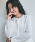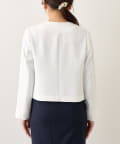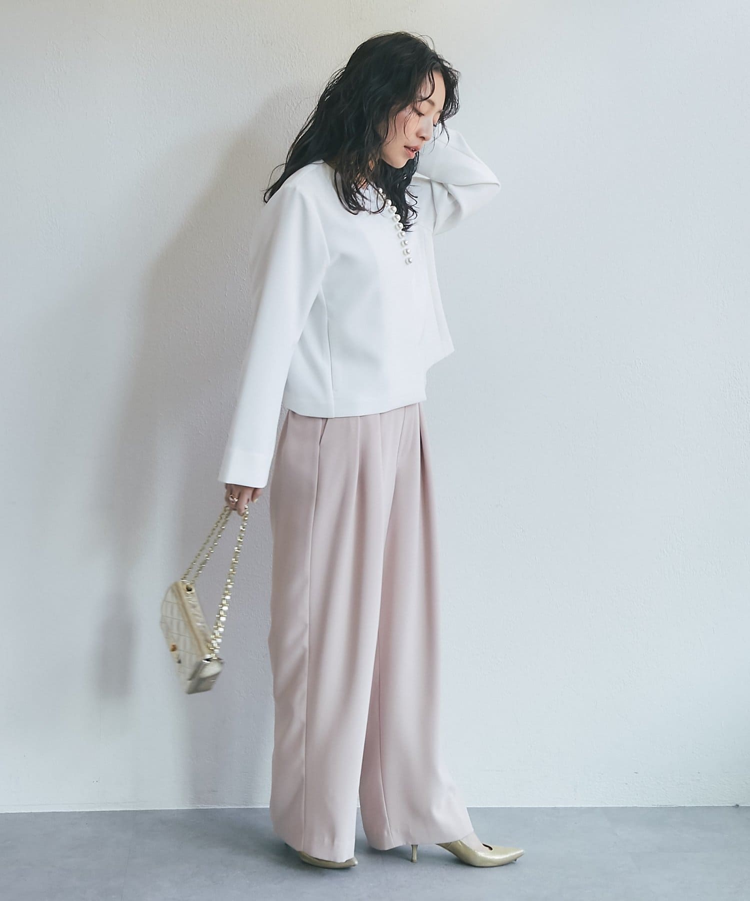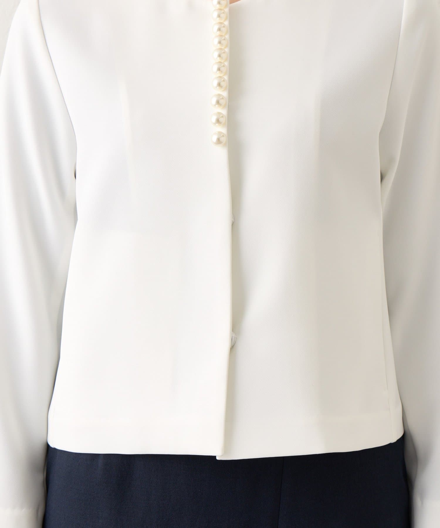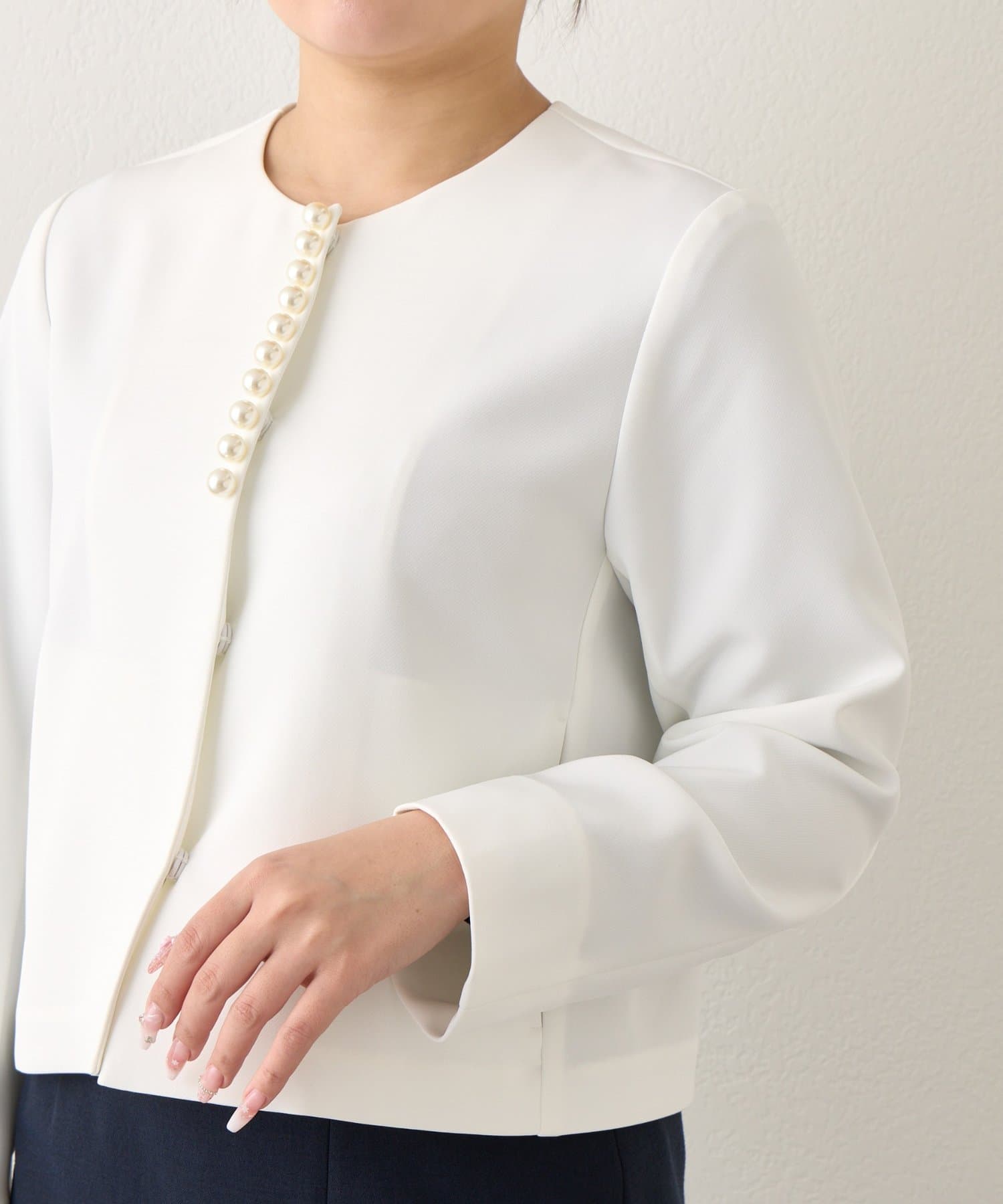首元をすっきりと見せるノーカラーデザインは、ネックレスやスカーフとの相性も抜群。