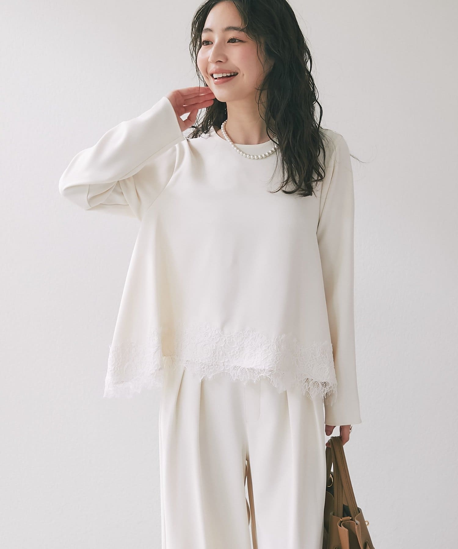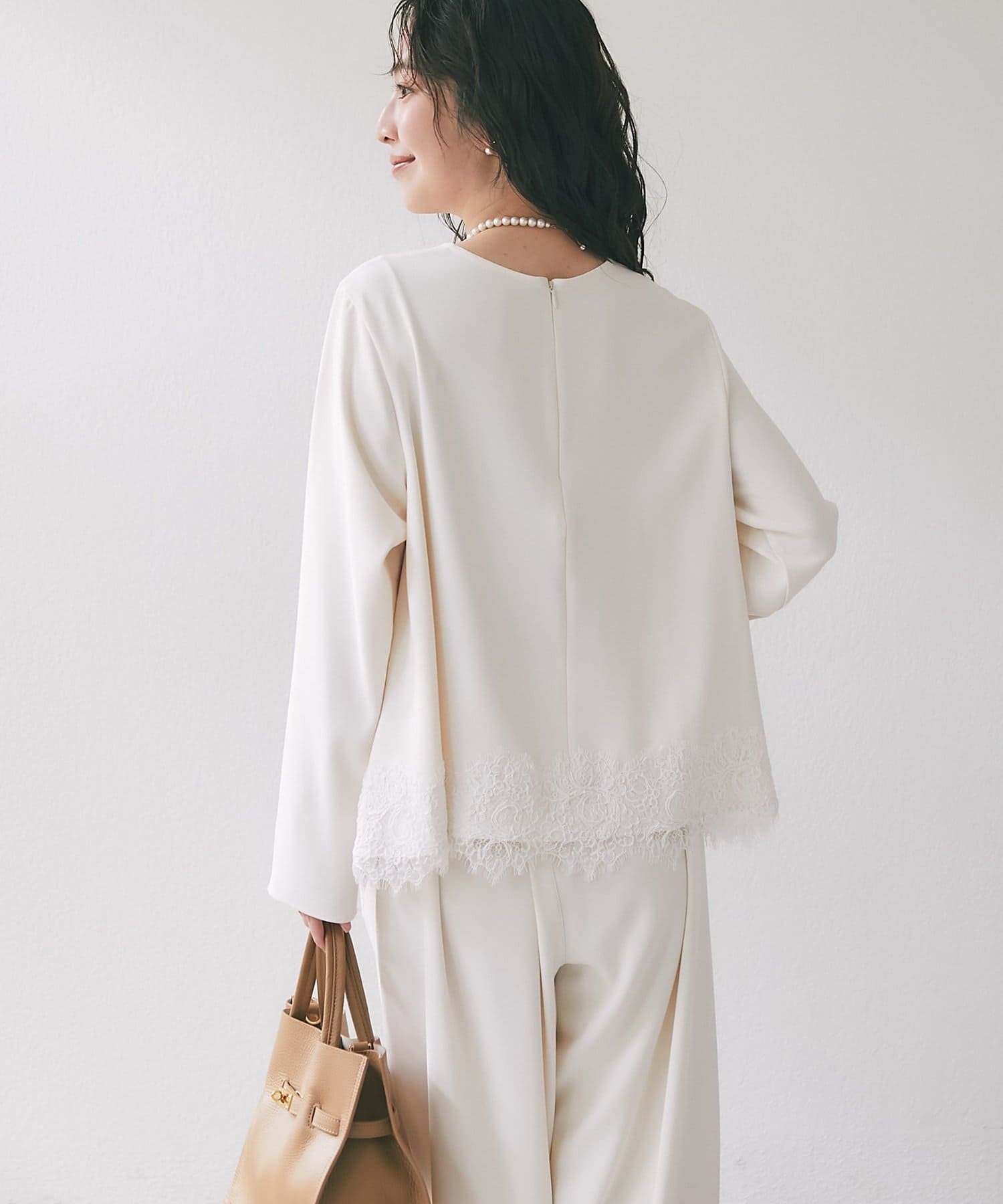 ブラウスは、高級感あるレースを裾にあしらい、さりげない華やかさをプラス。