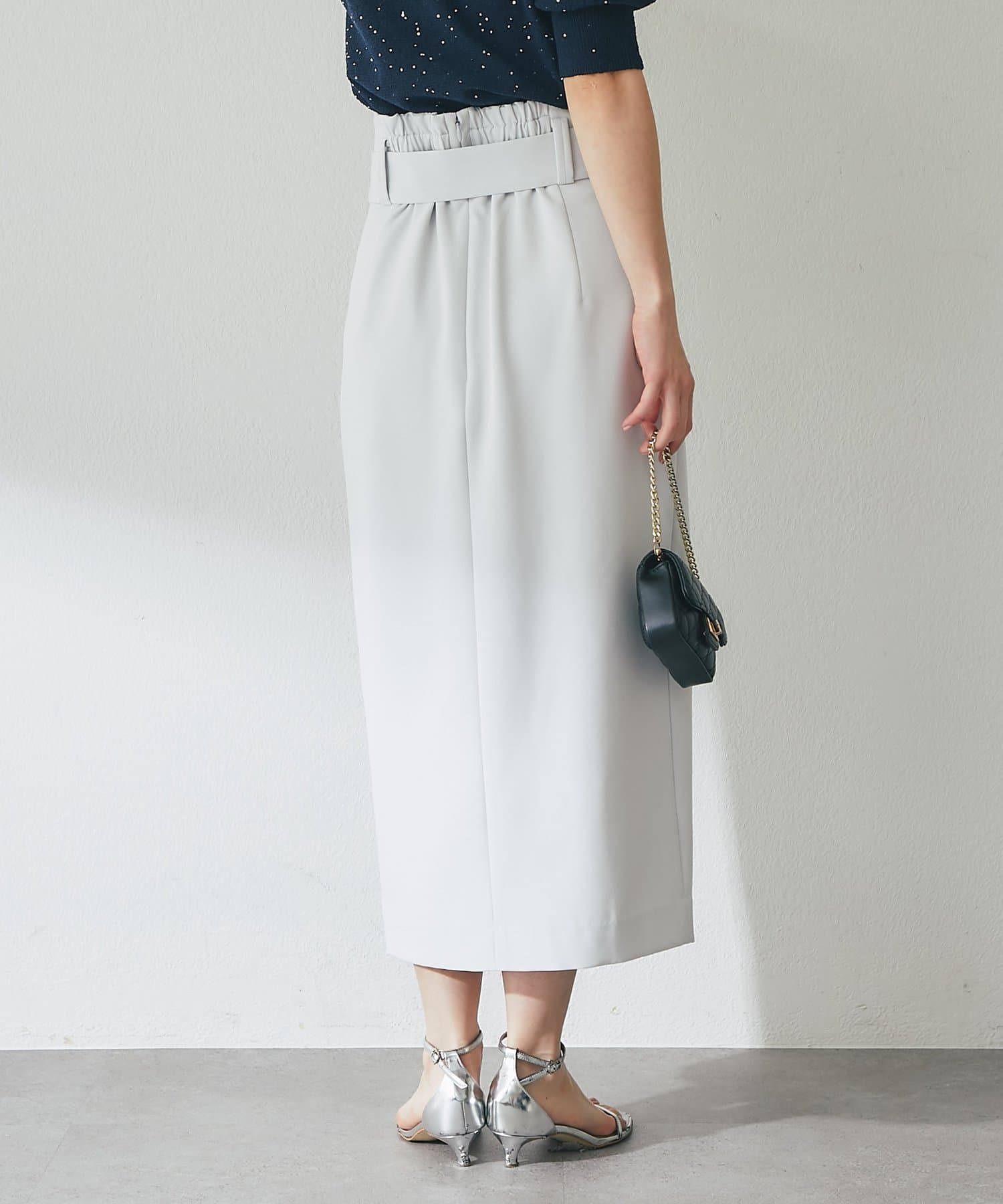 ●デザイン ベルト付きデザインがポイントのミモレ丈スカート。