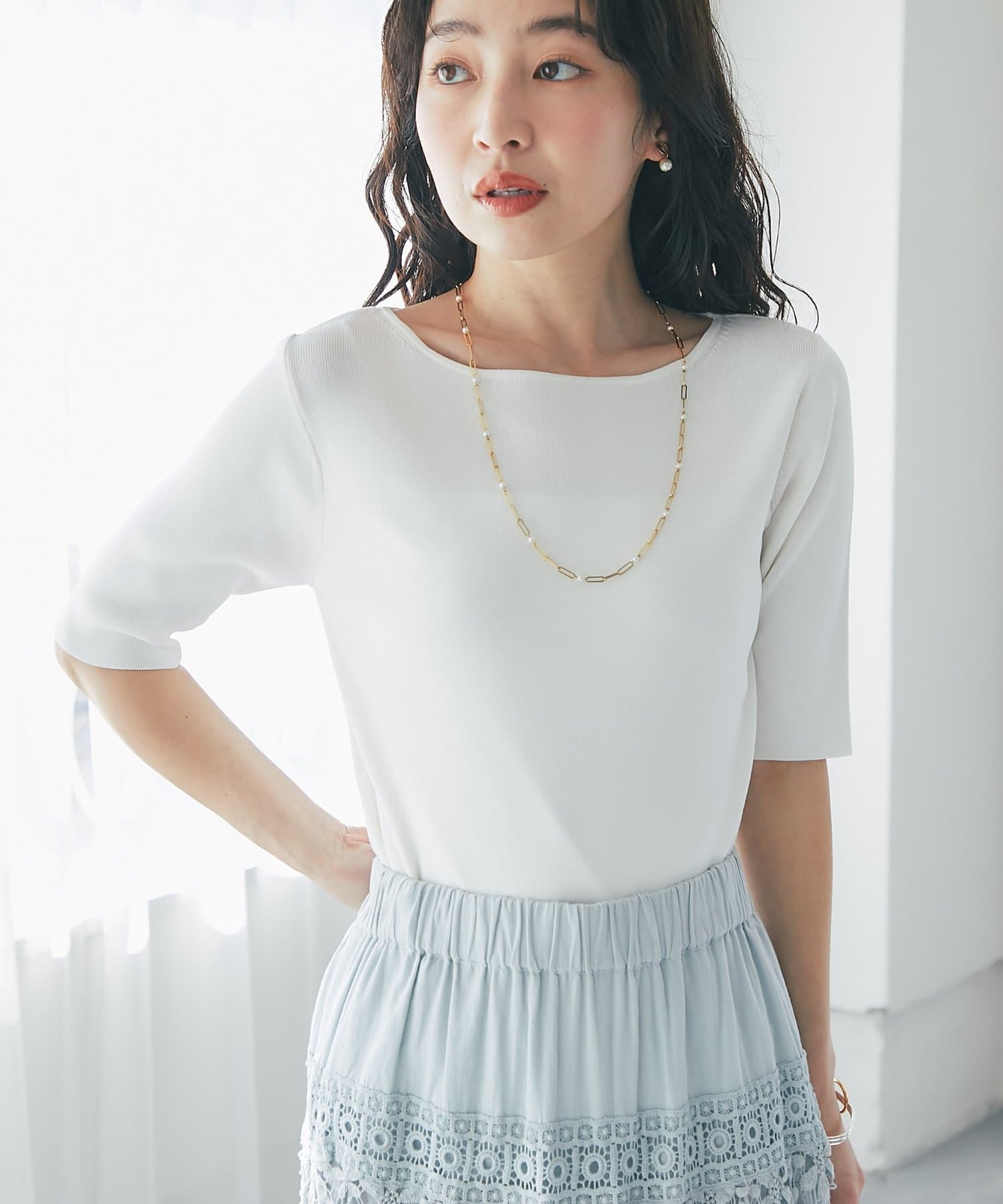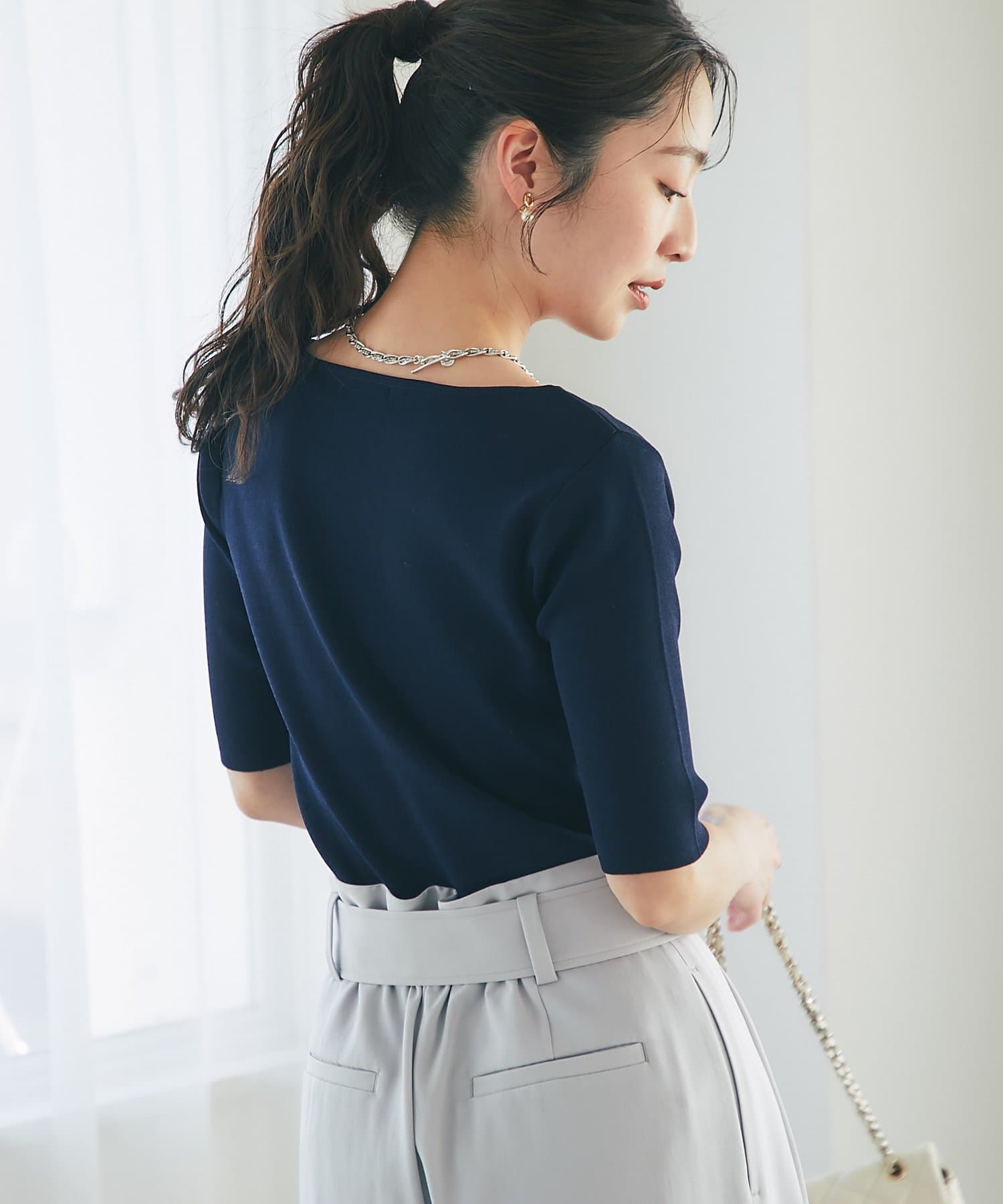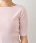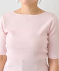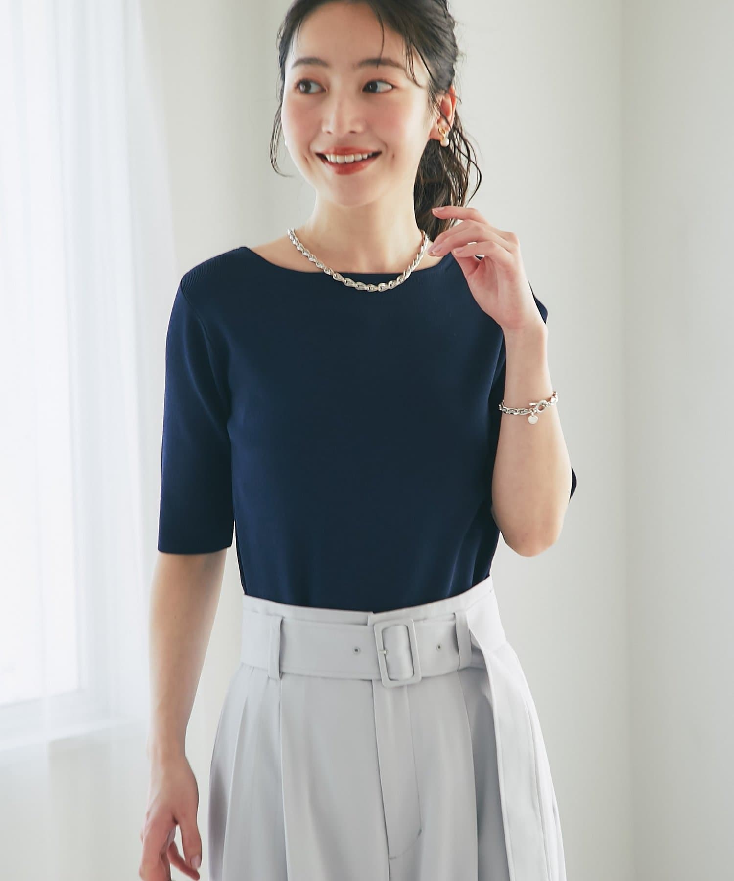 デコルテがきれいに見えるボートネックライン。