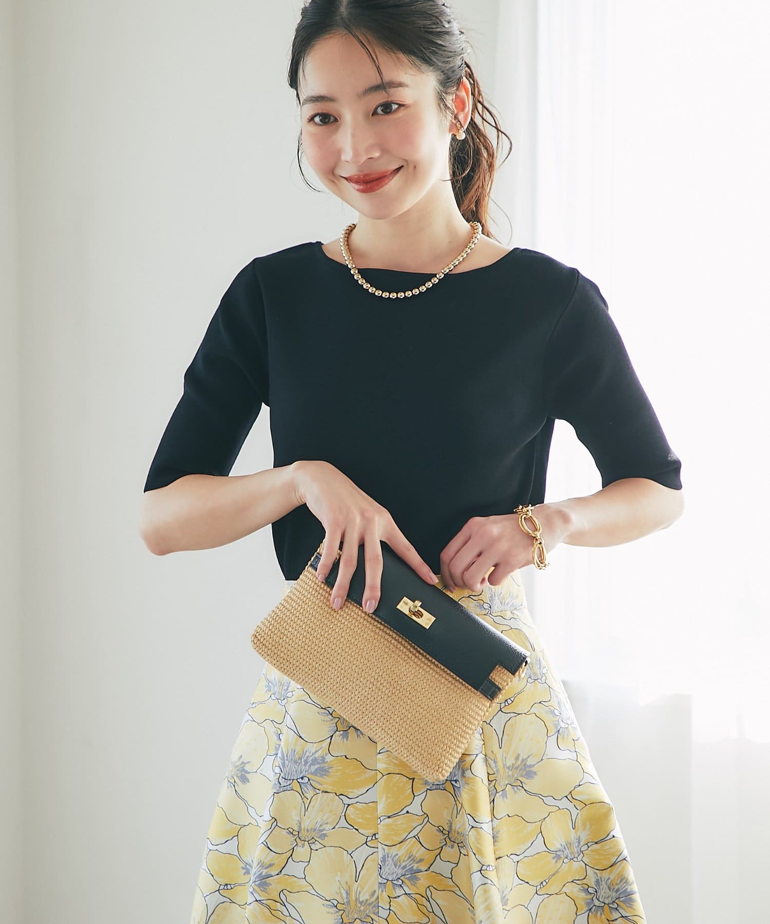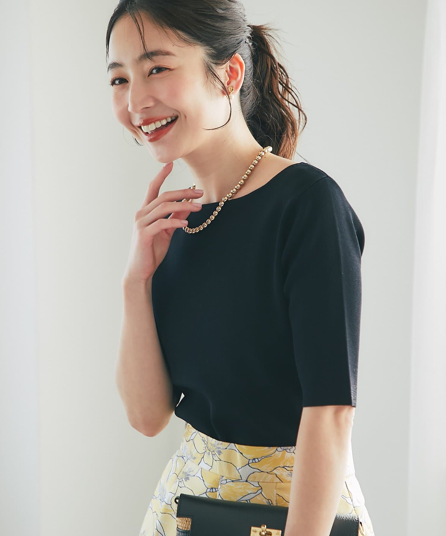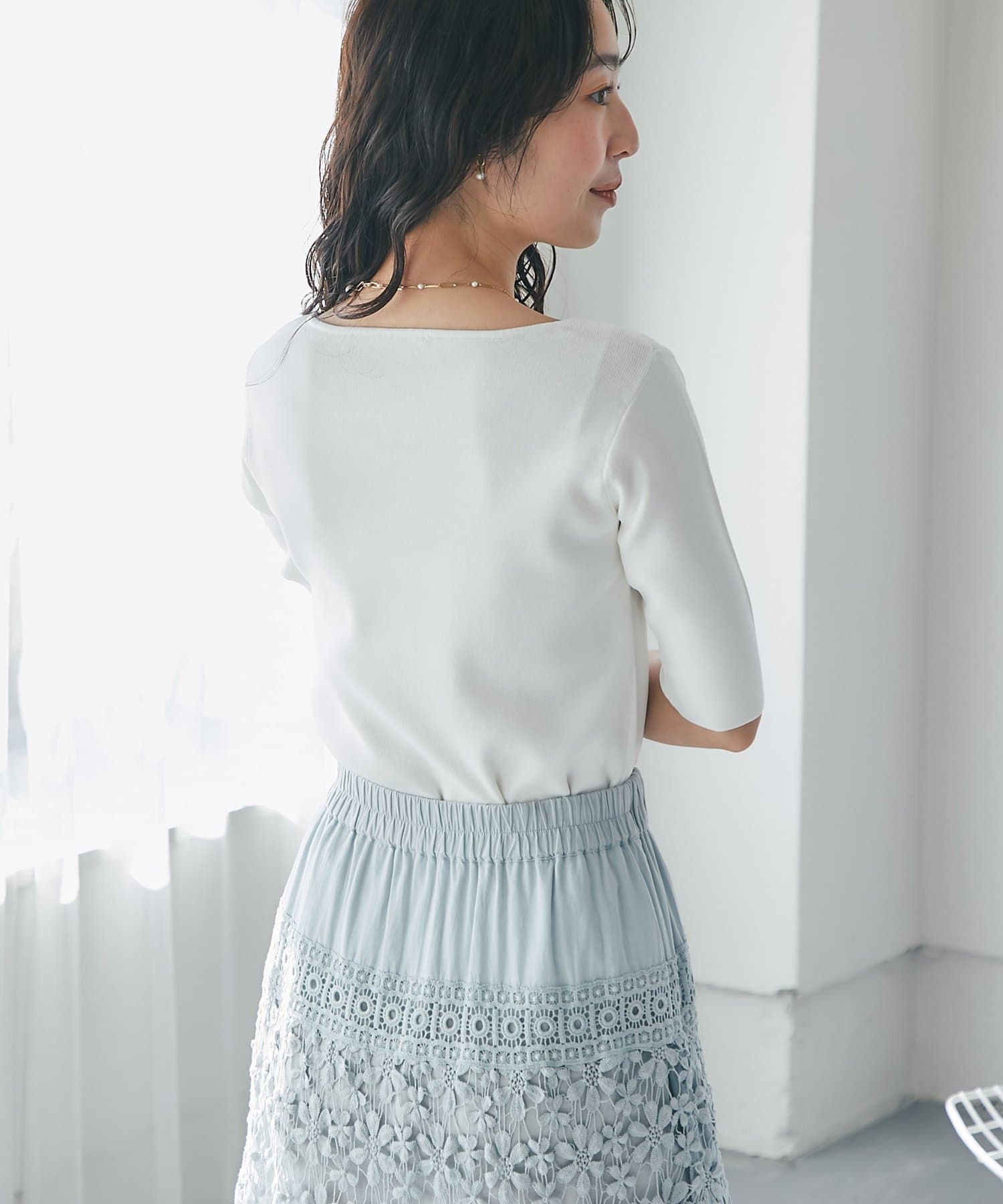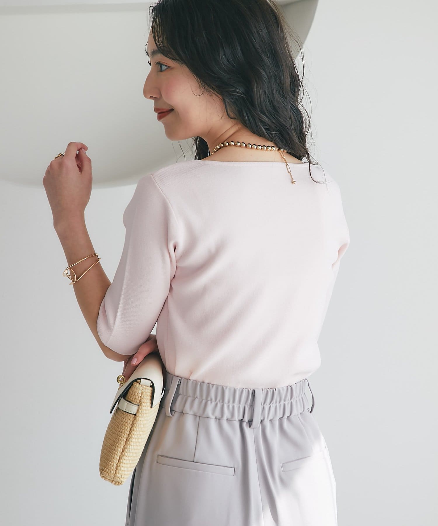 デコルテがきれいに見えるボートネックライン。