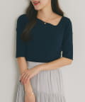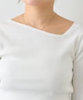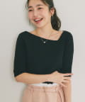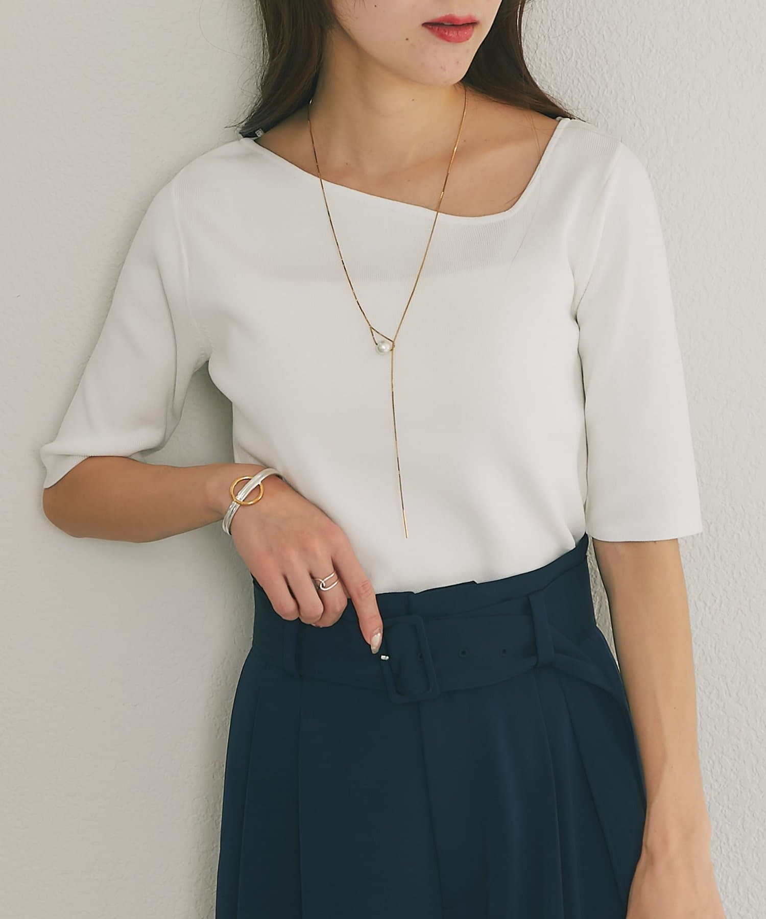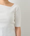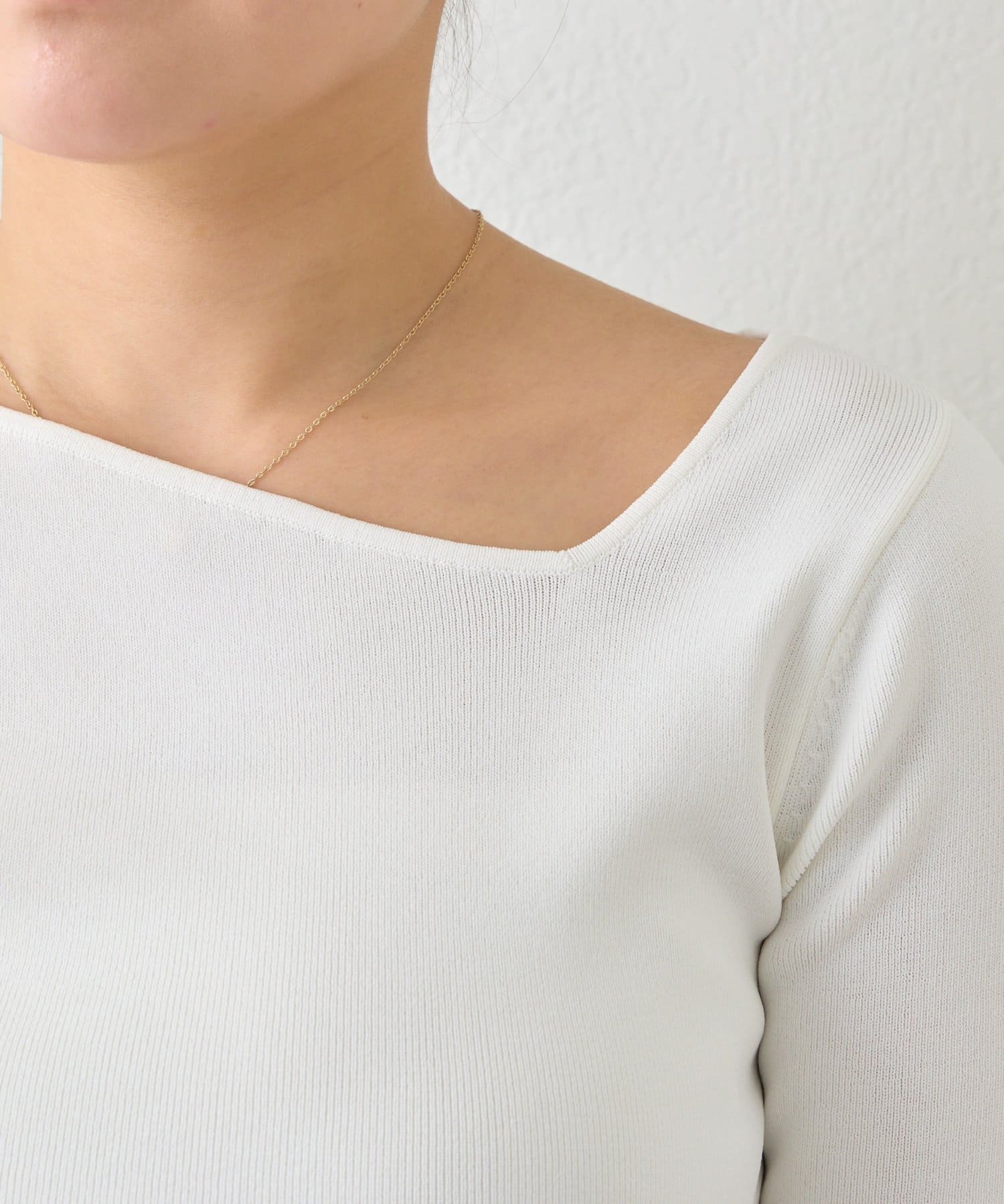 アシンメトリーなネックラインが印象的なリブニットトップス。