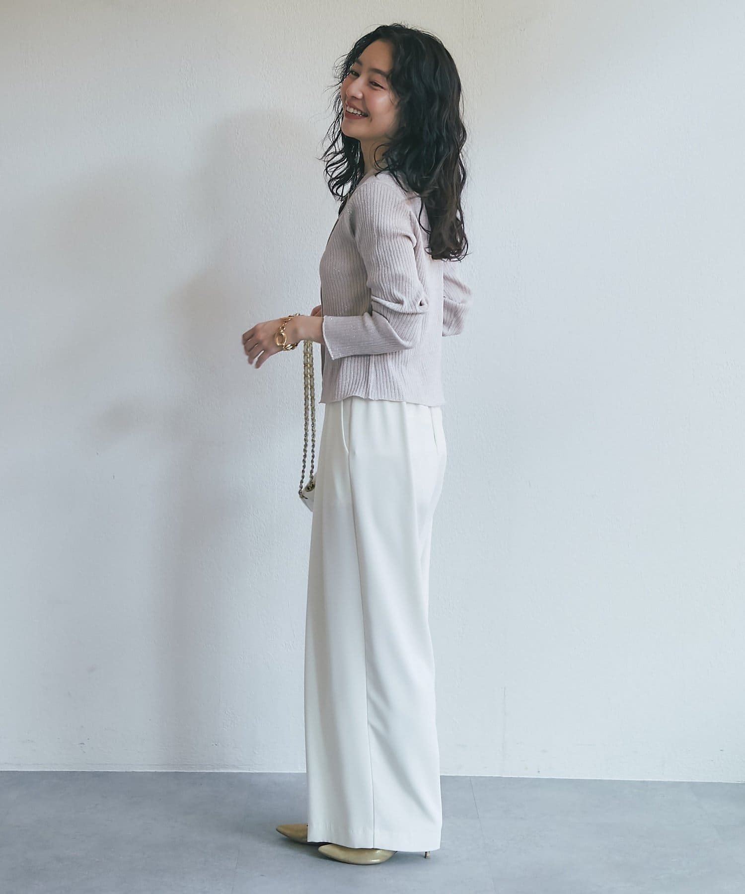 落ち感のある綺麗目なスカートはもちろんデニムなどのパンツスタイルもおすすめ。