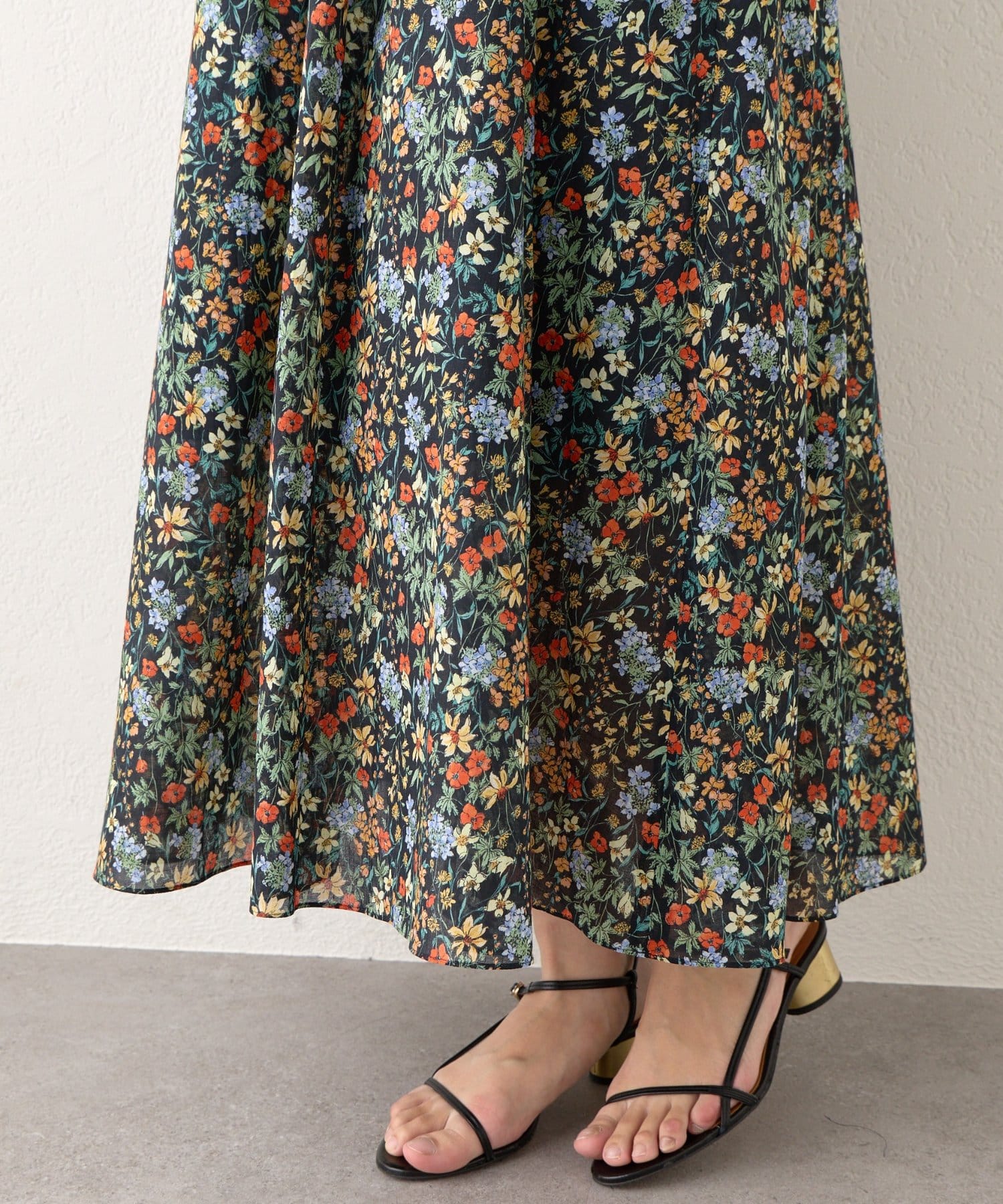 小花柄プリントが優しい印象を与え、フェミニンな雰囲気を演出。