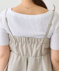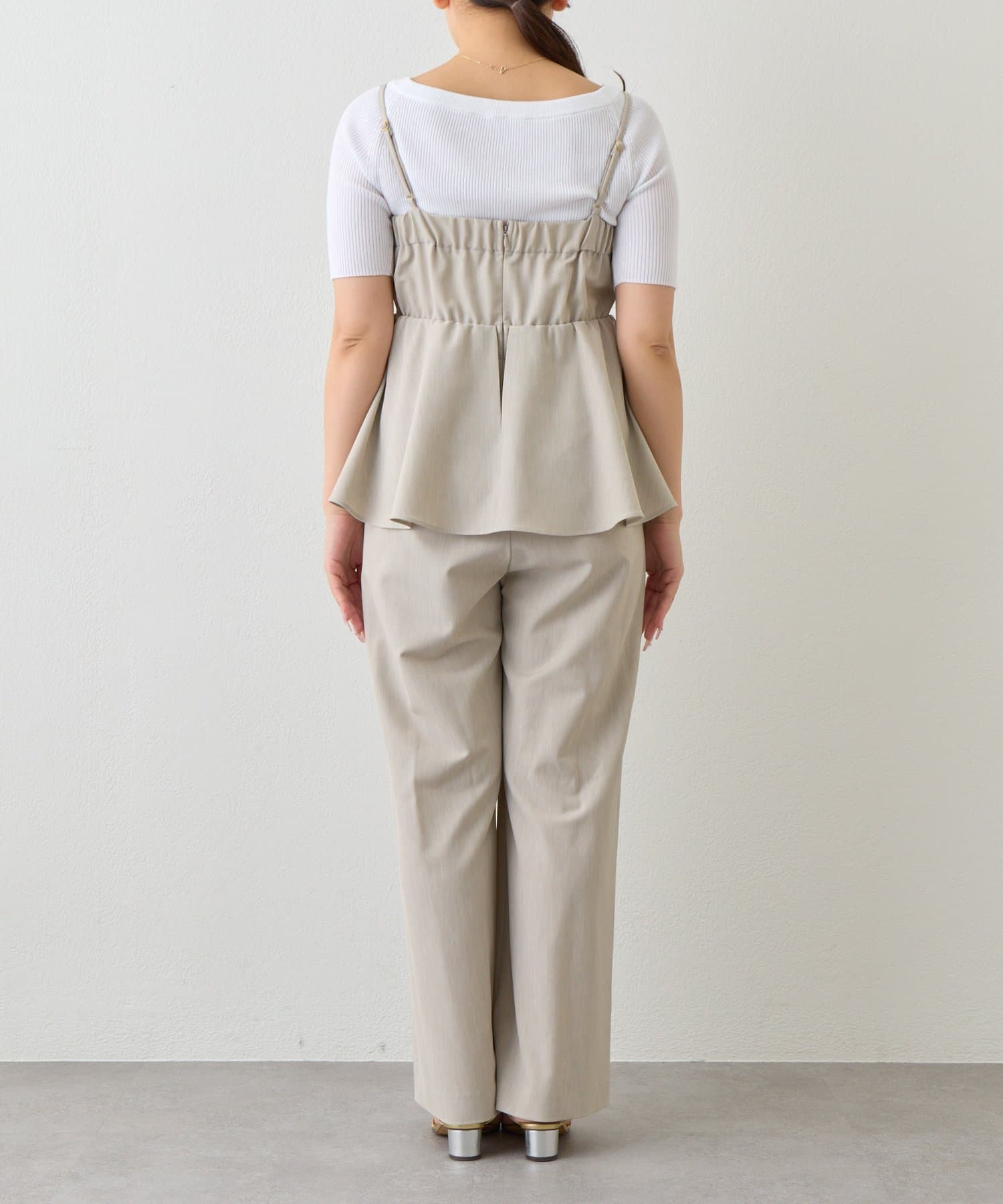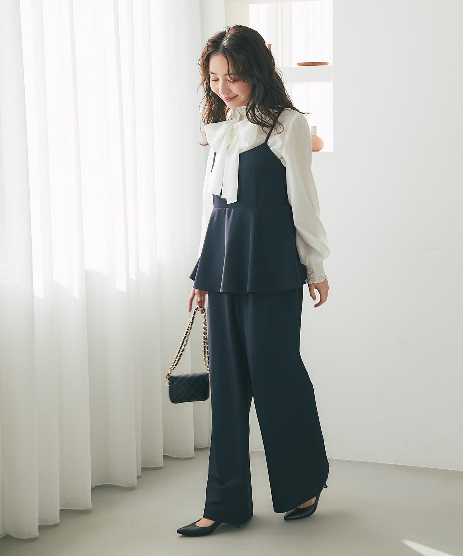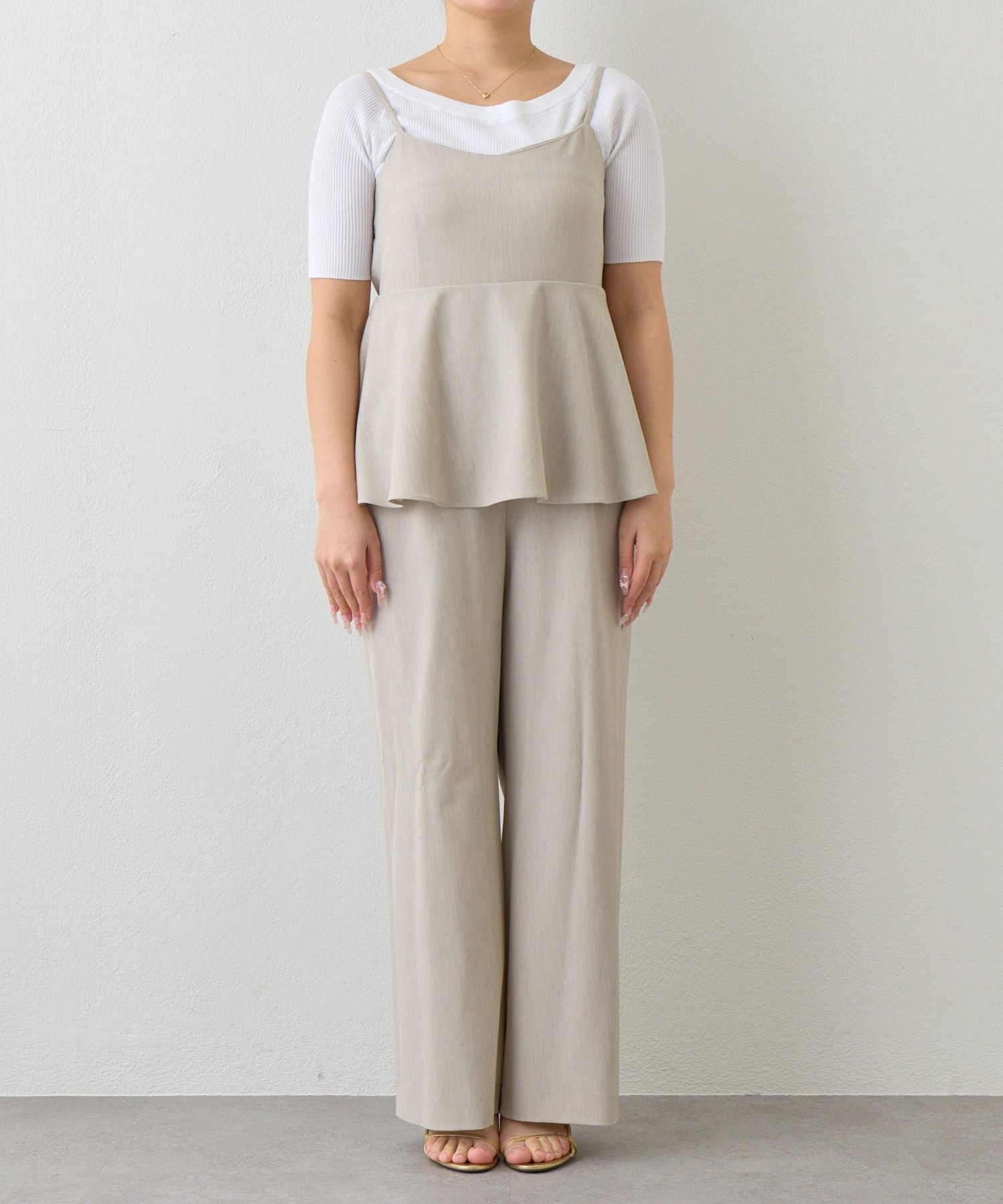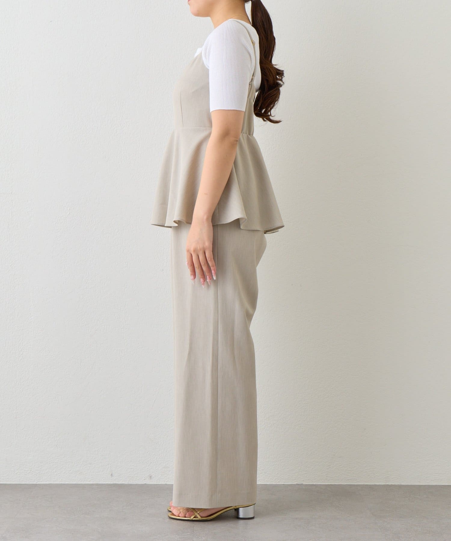 女性らしいペプラムシルエットが目を惹く、キャミソールタイプのオールインワン。