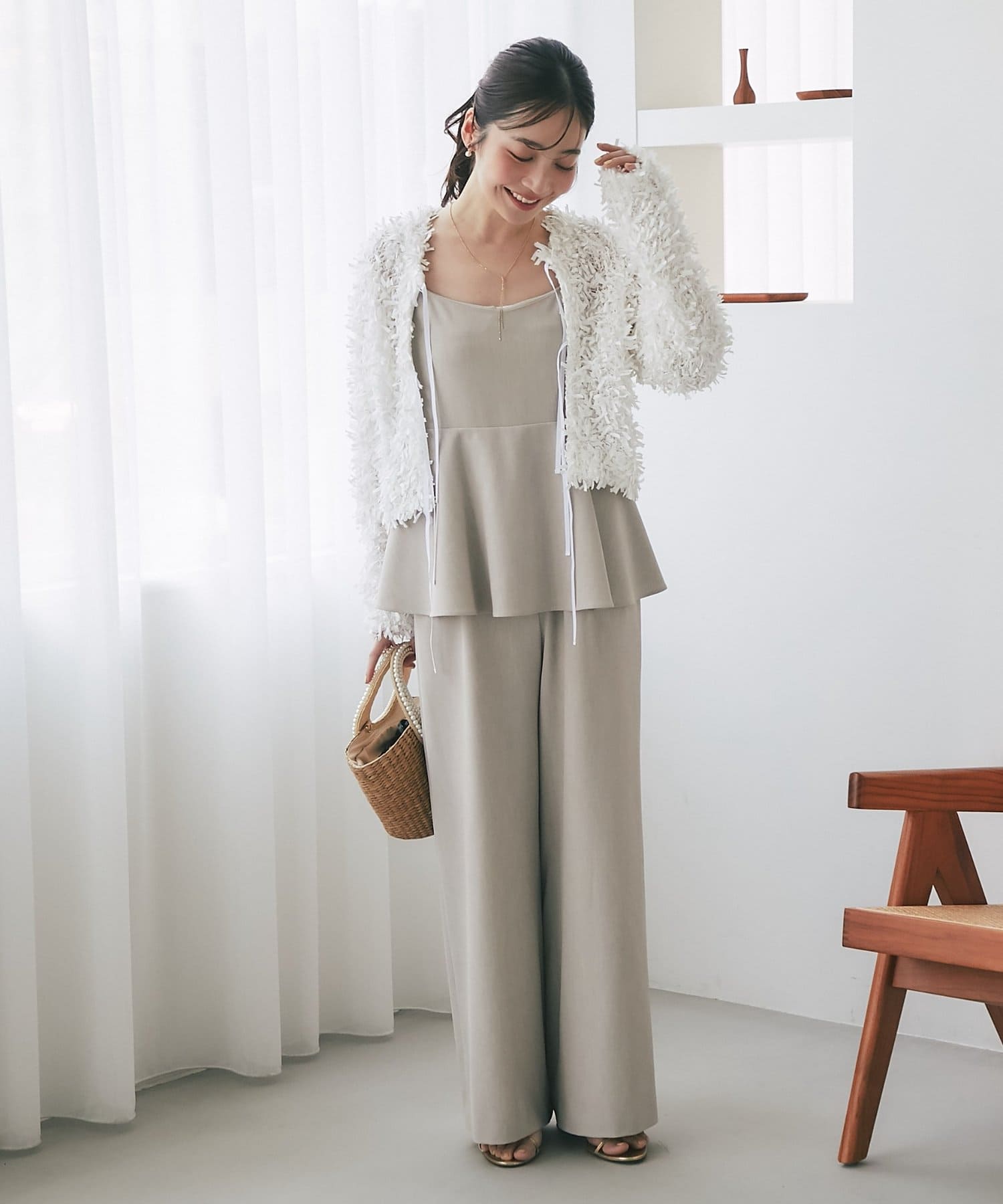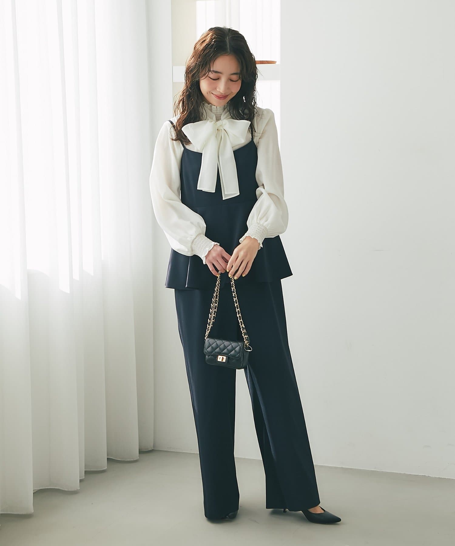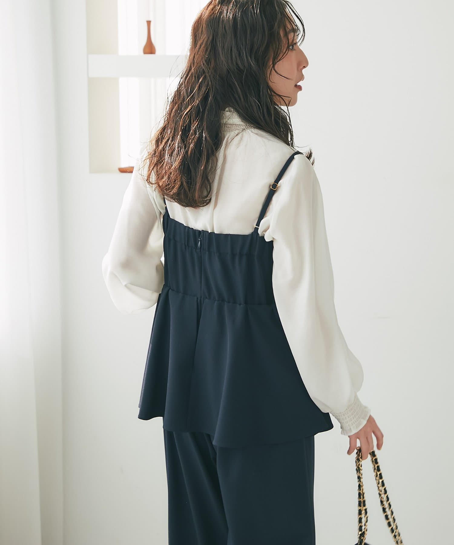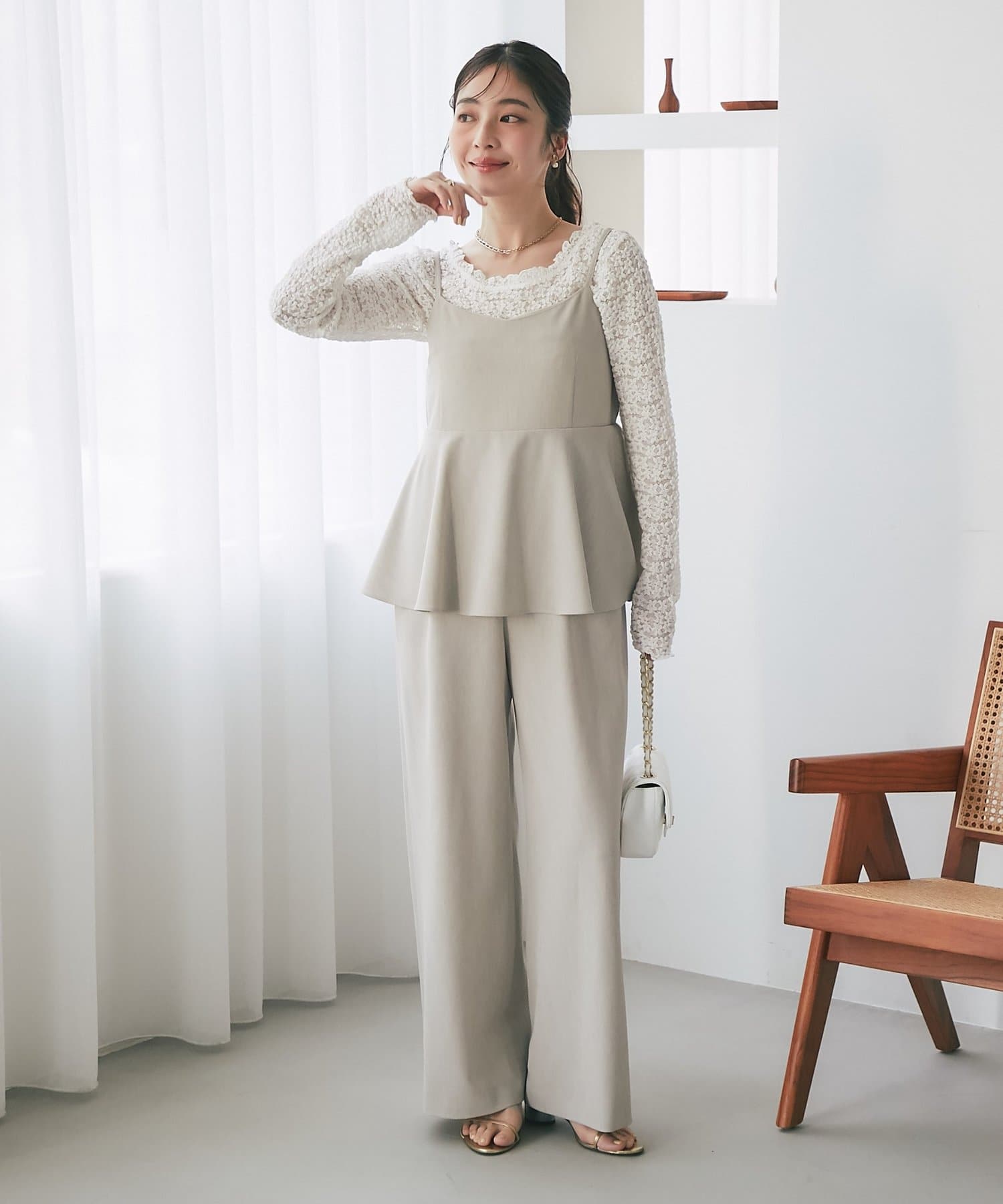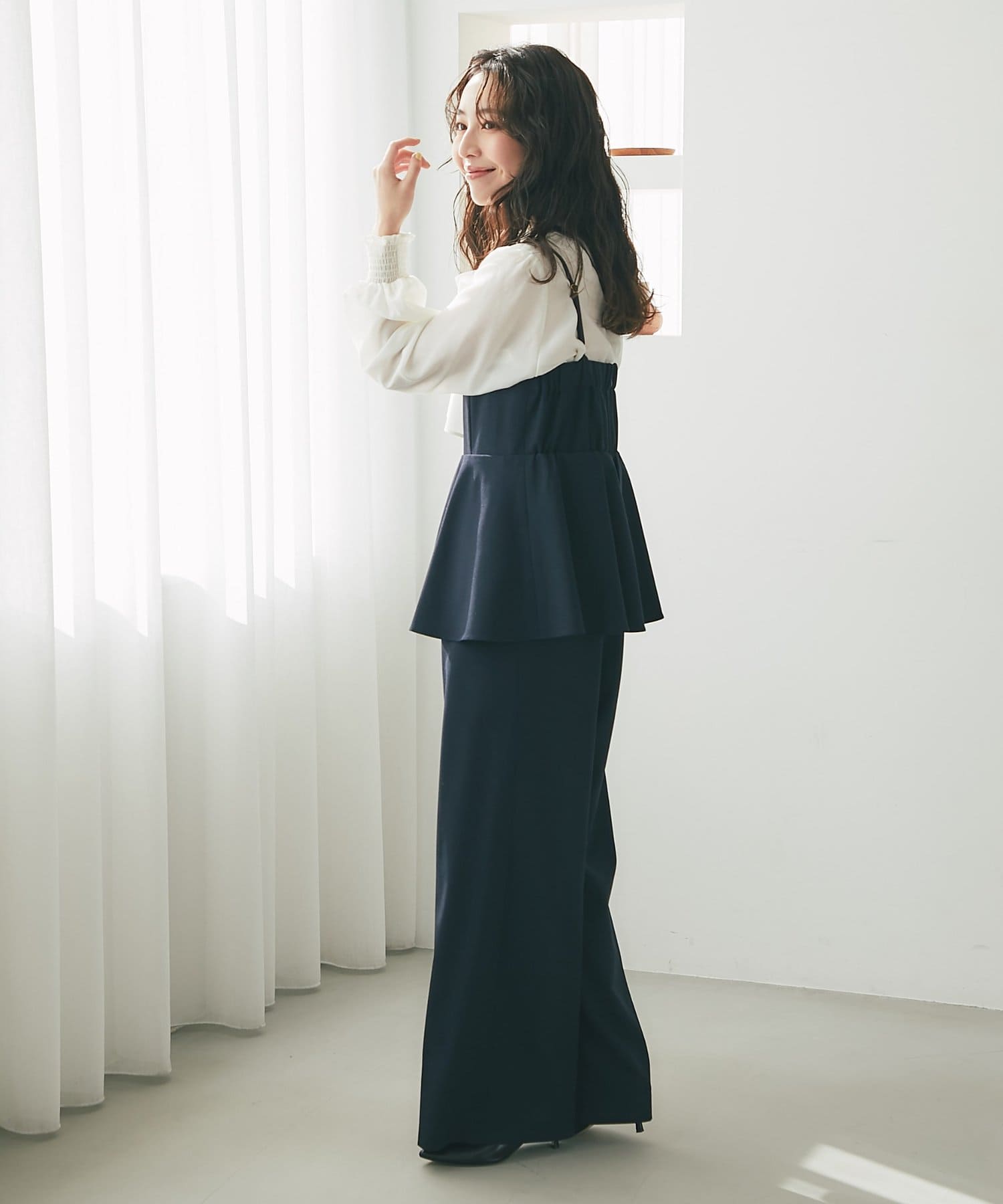 女性らしいペプラムシルエットが目を惹く、キャミソールタイプのオールインワン。