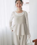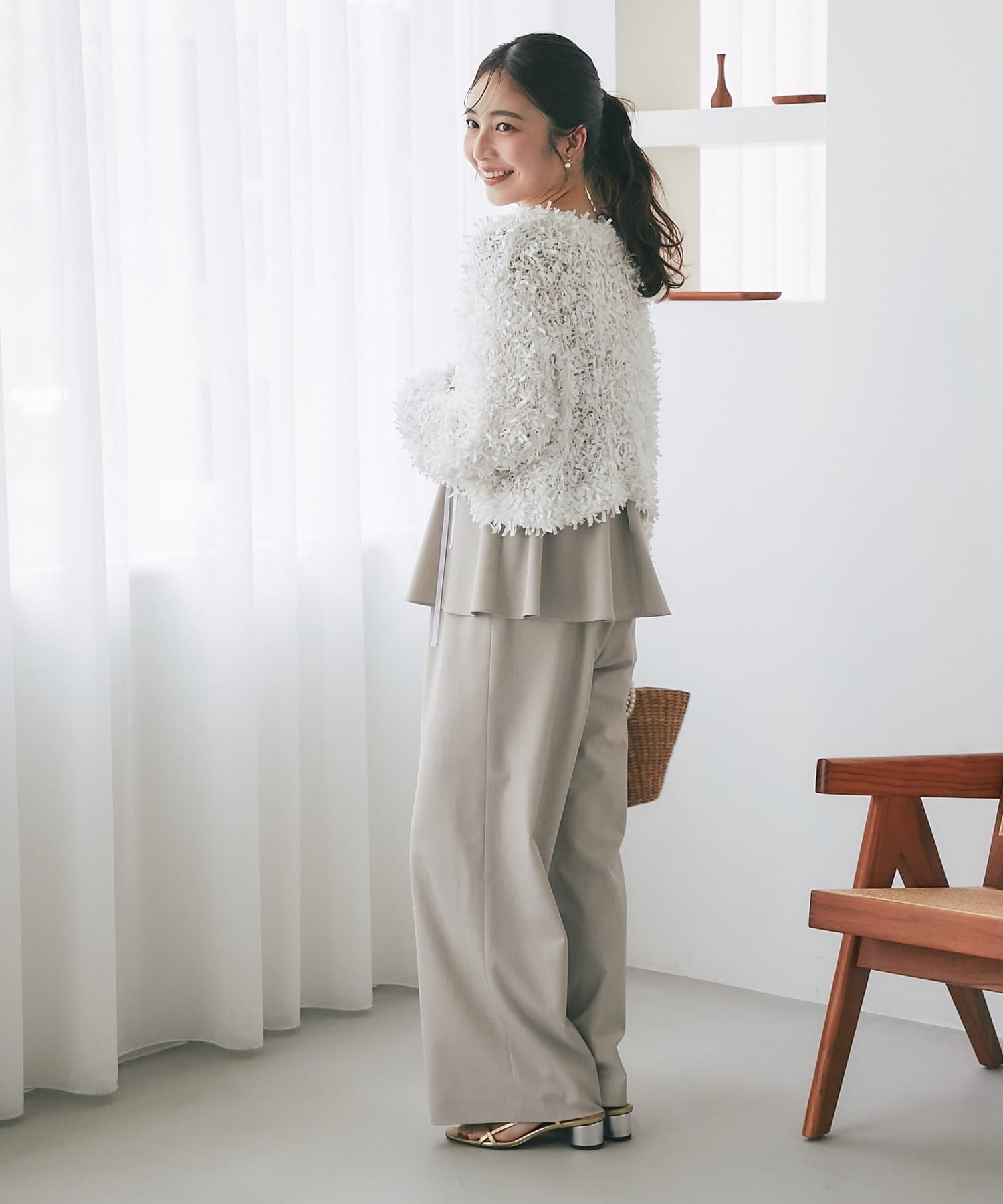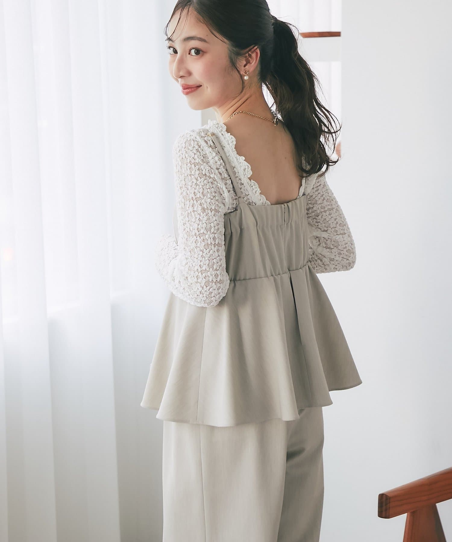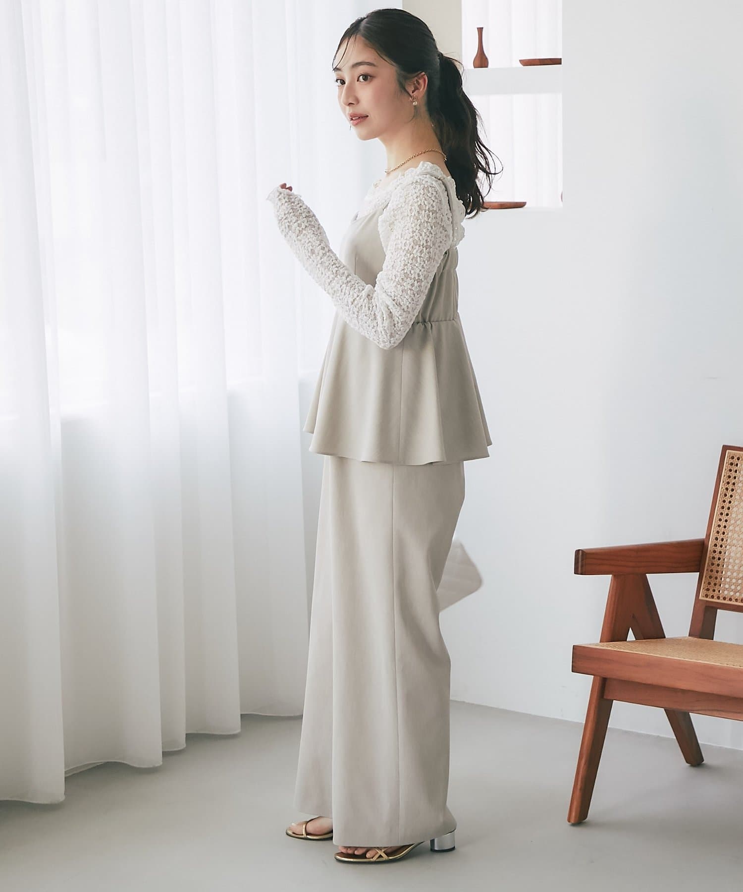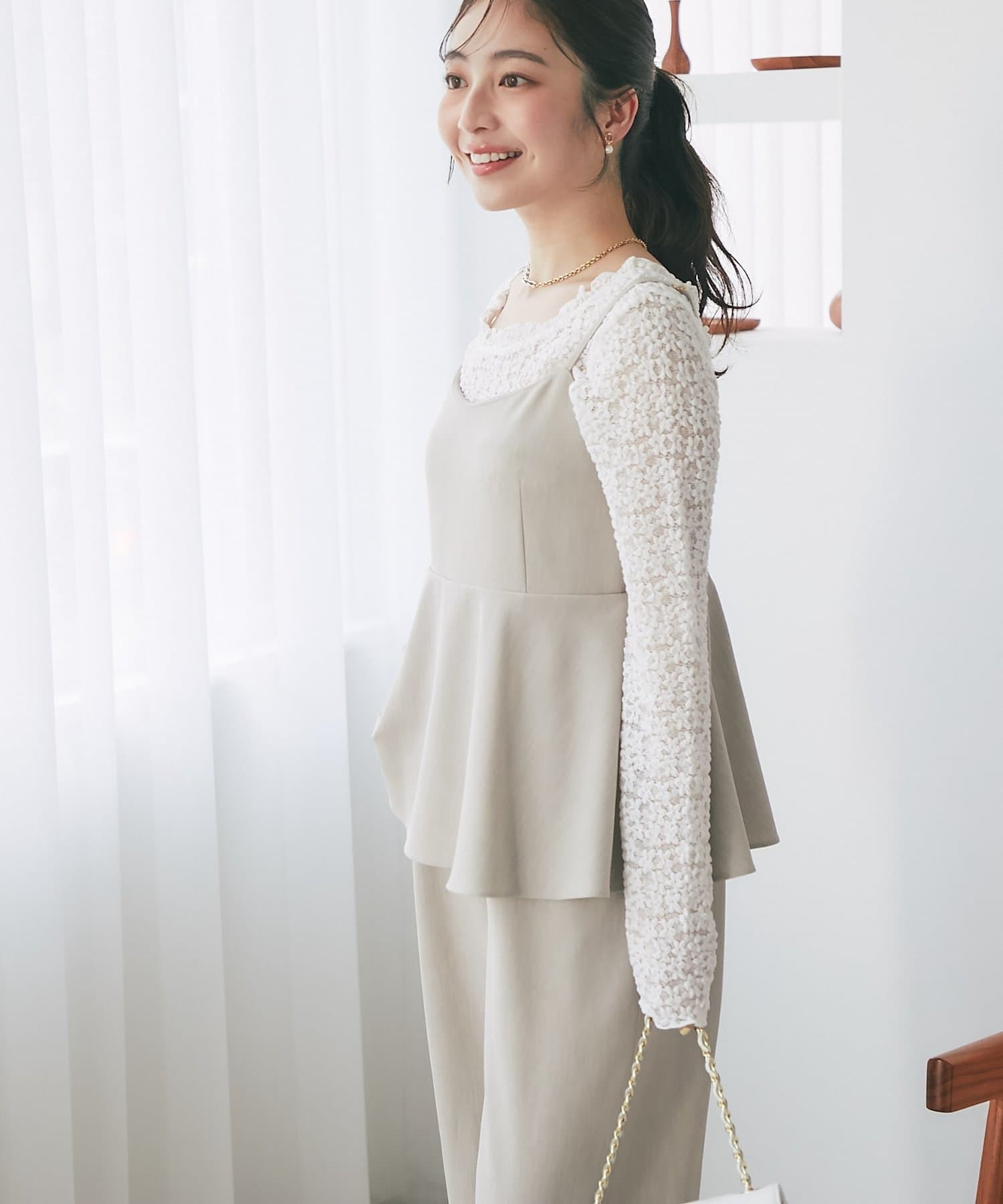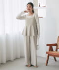高めのウエスト位置からふんわりと広がるペプラムデザインが、