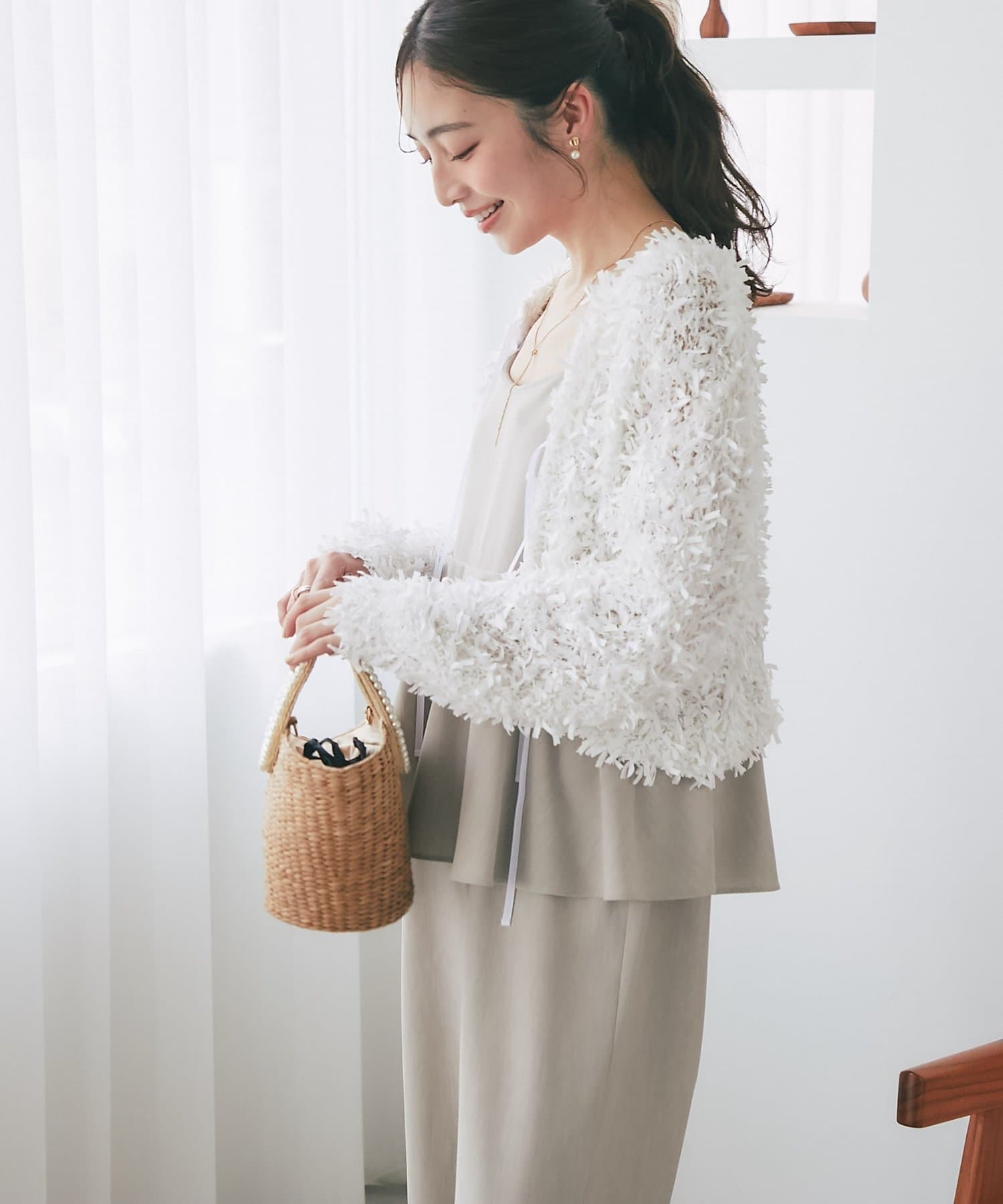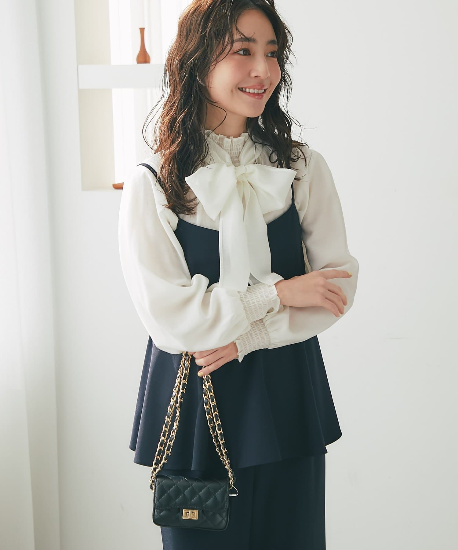 春は薄手のタイトなニットやカットソーと合わせて、すっきりとした着こなしに。