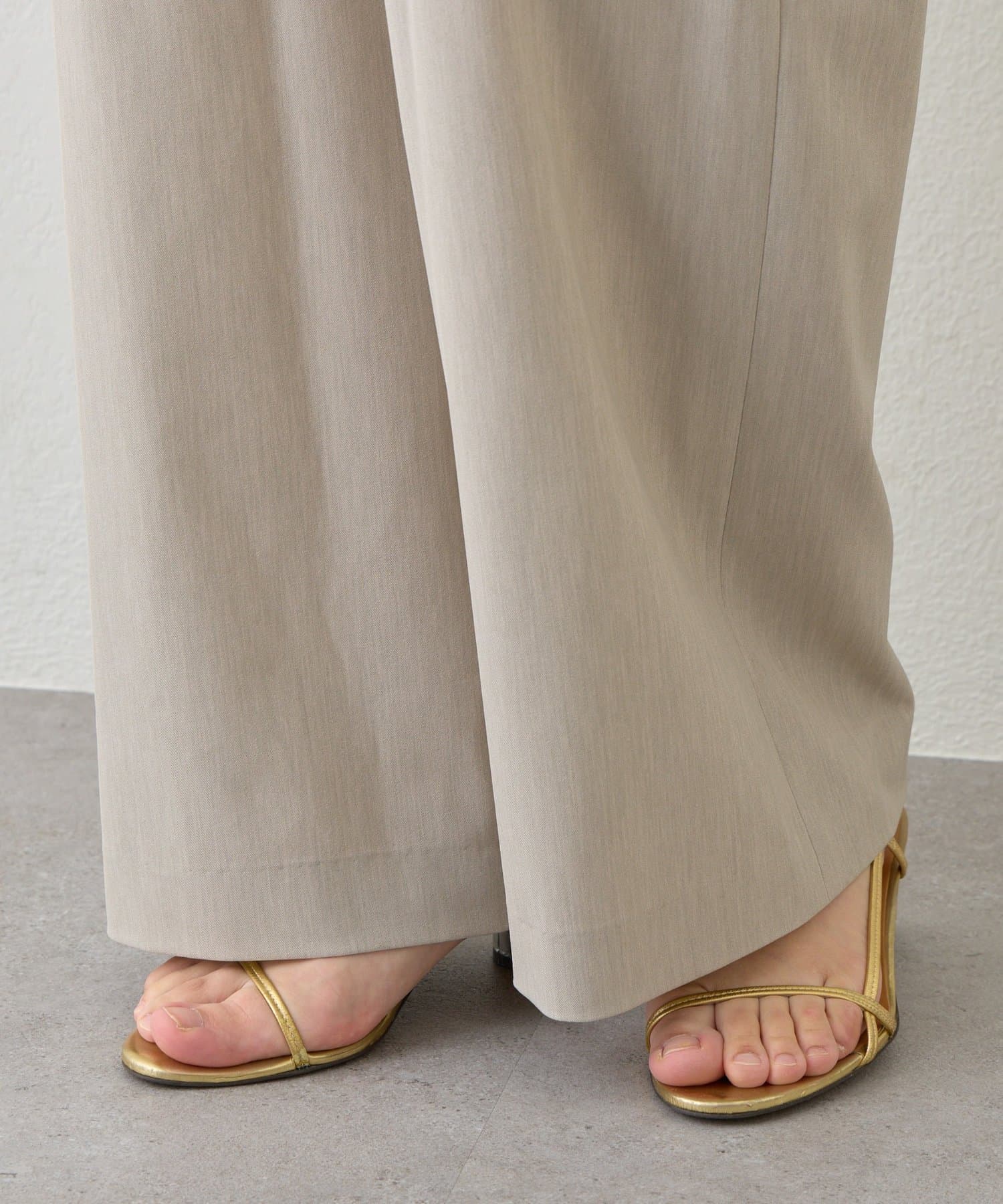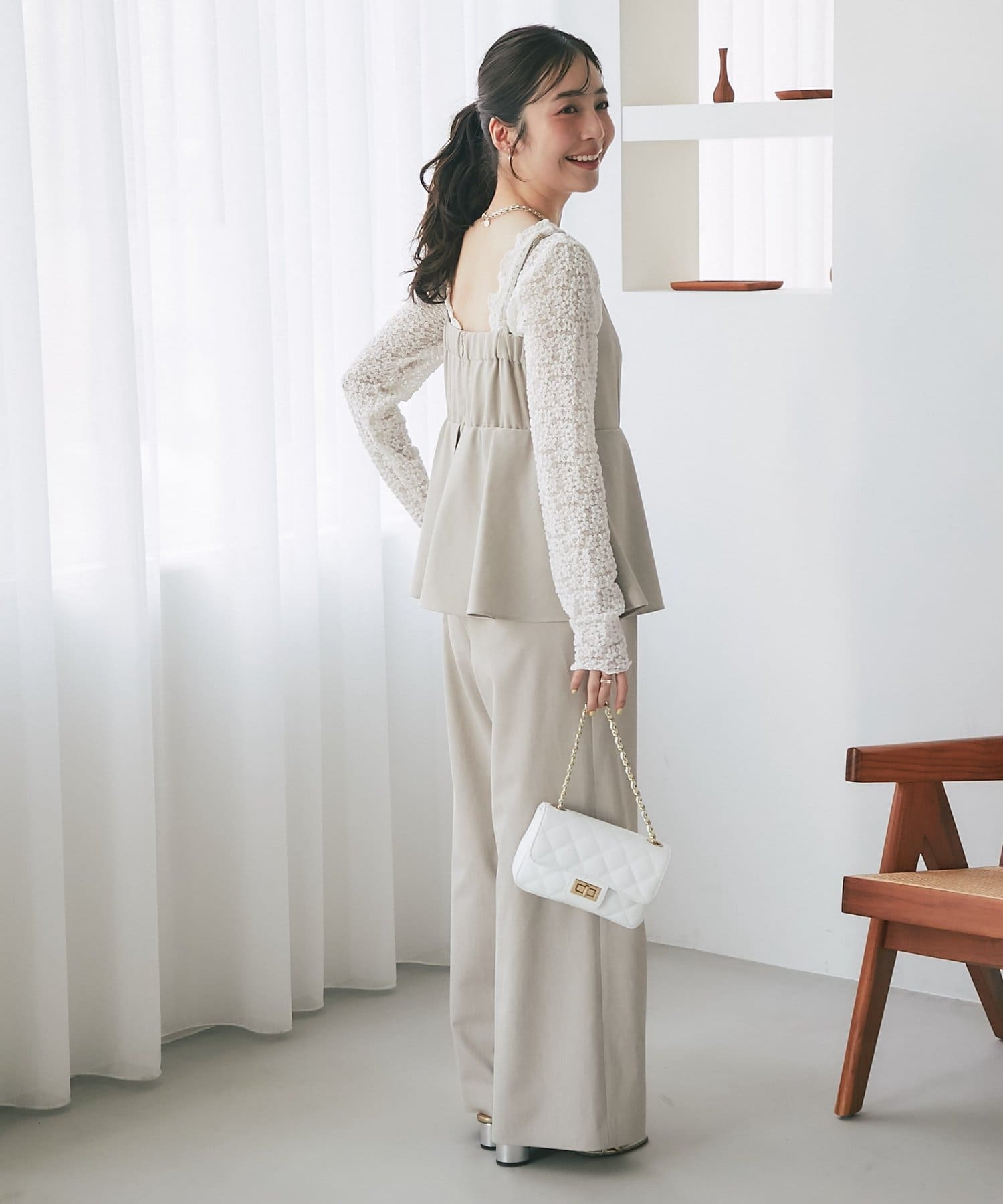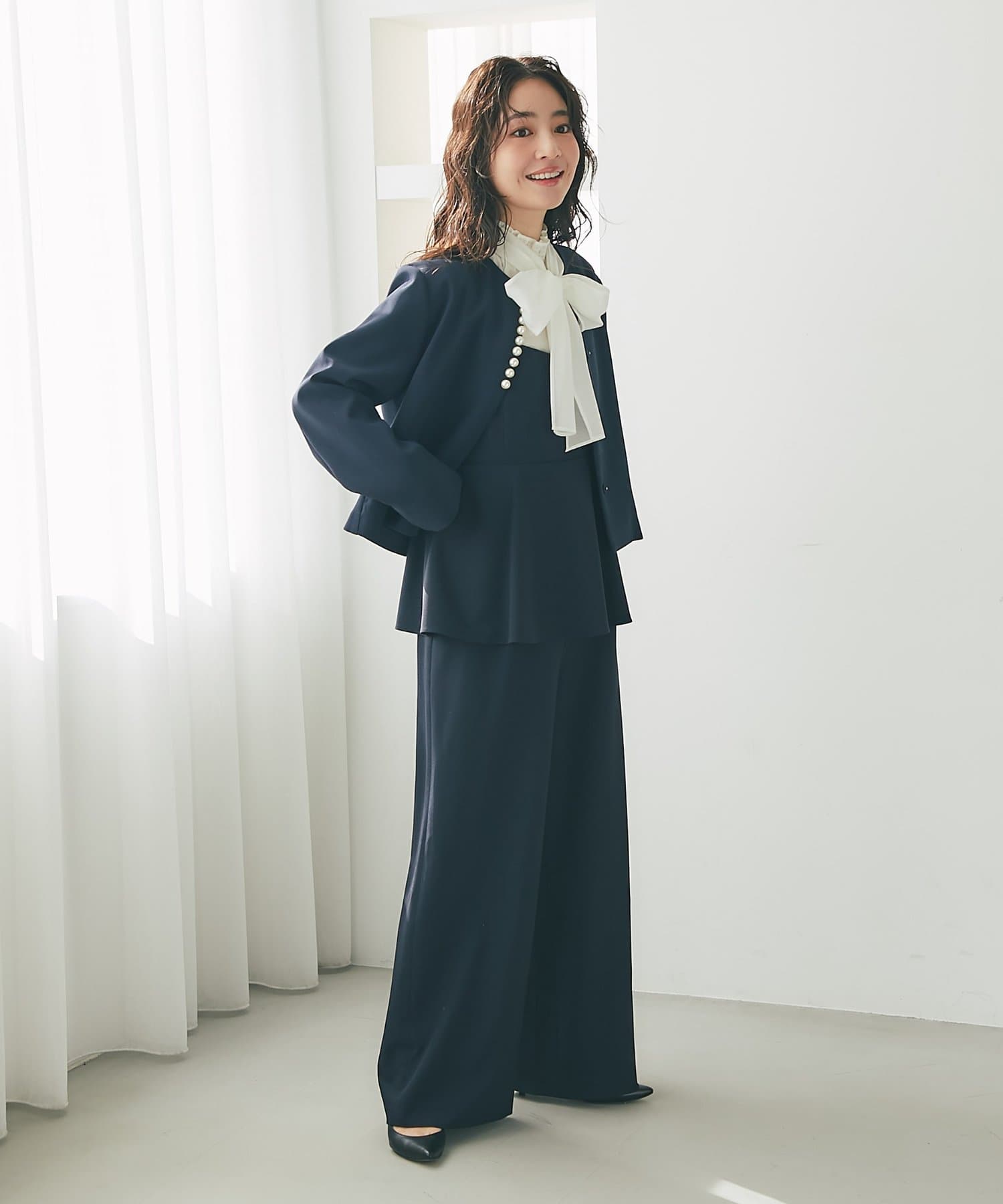パンツ部分は落ち感のあるストレートシルエットで、甘さを抑えたシルエットに。