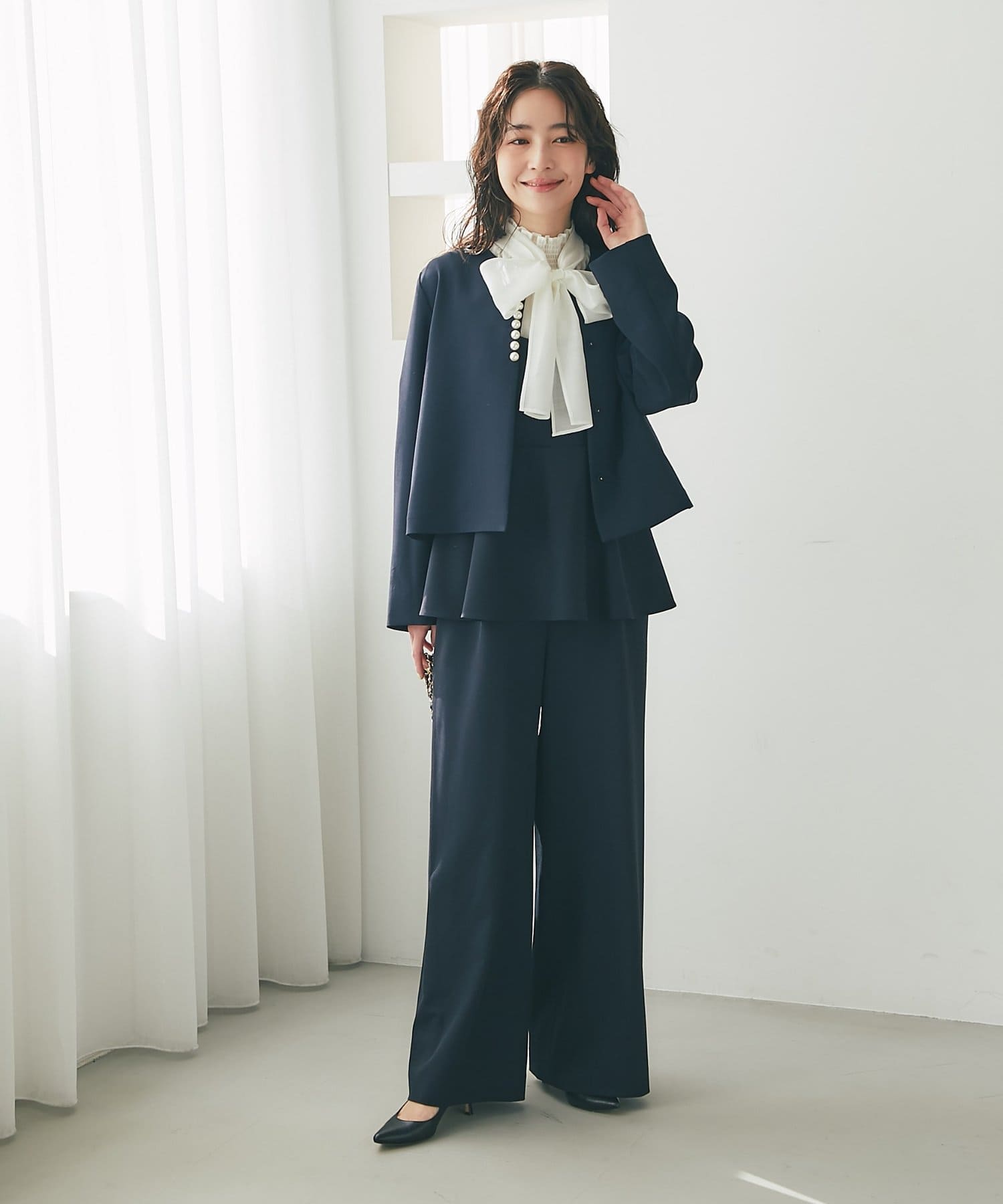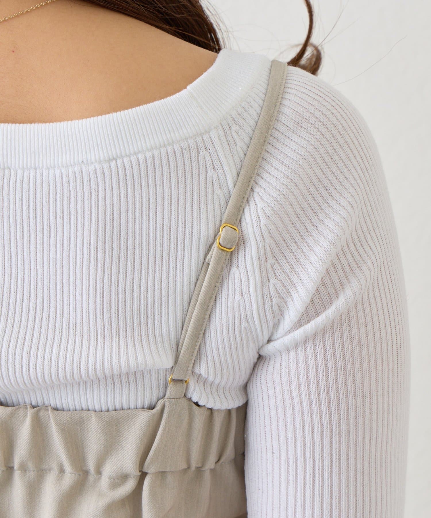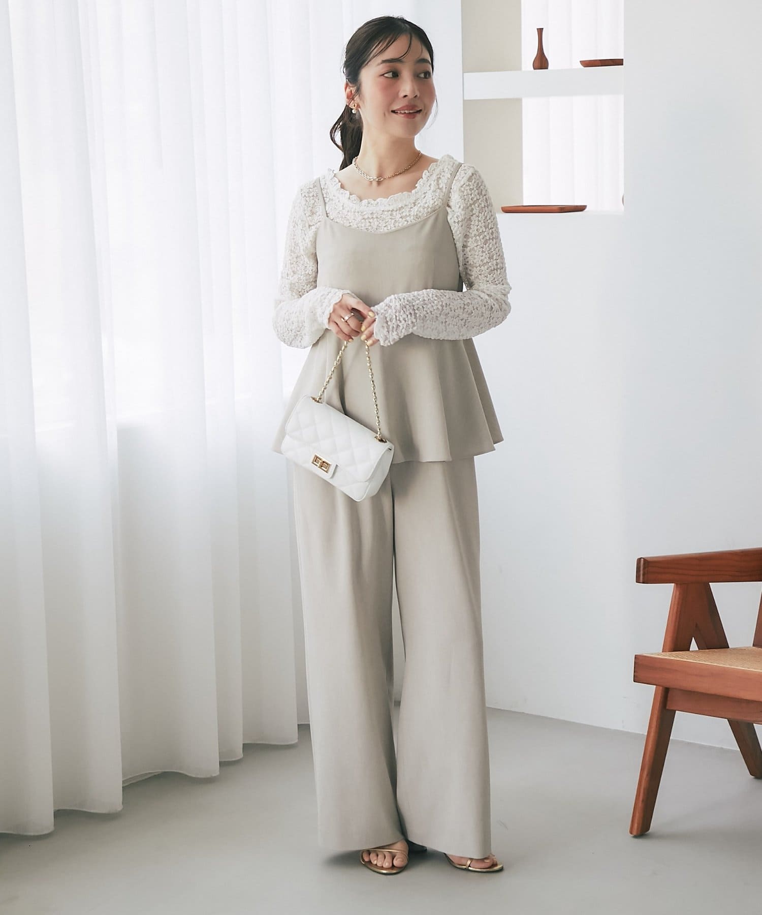 パンツ部分は落ち感のあるストレートシルエットで、甘さを抑えたシルエットに。