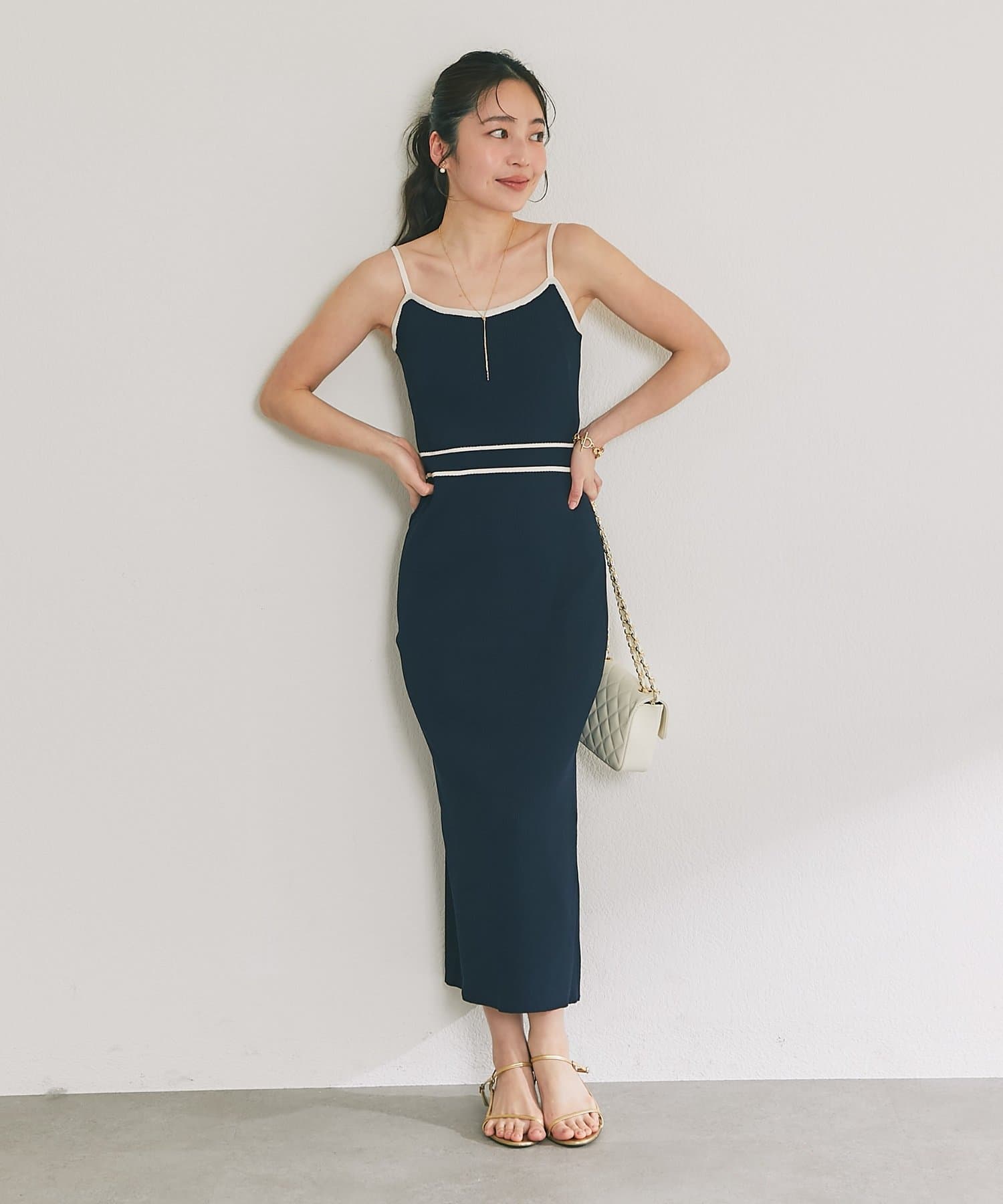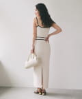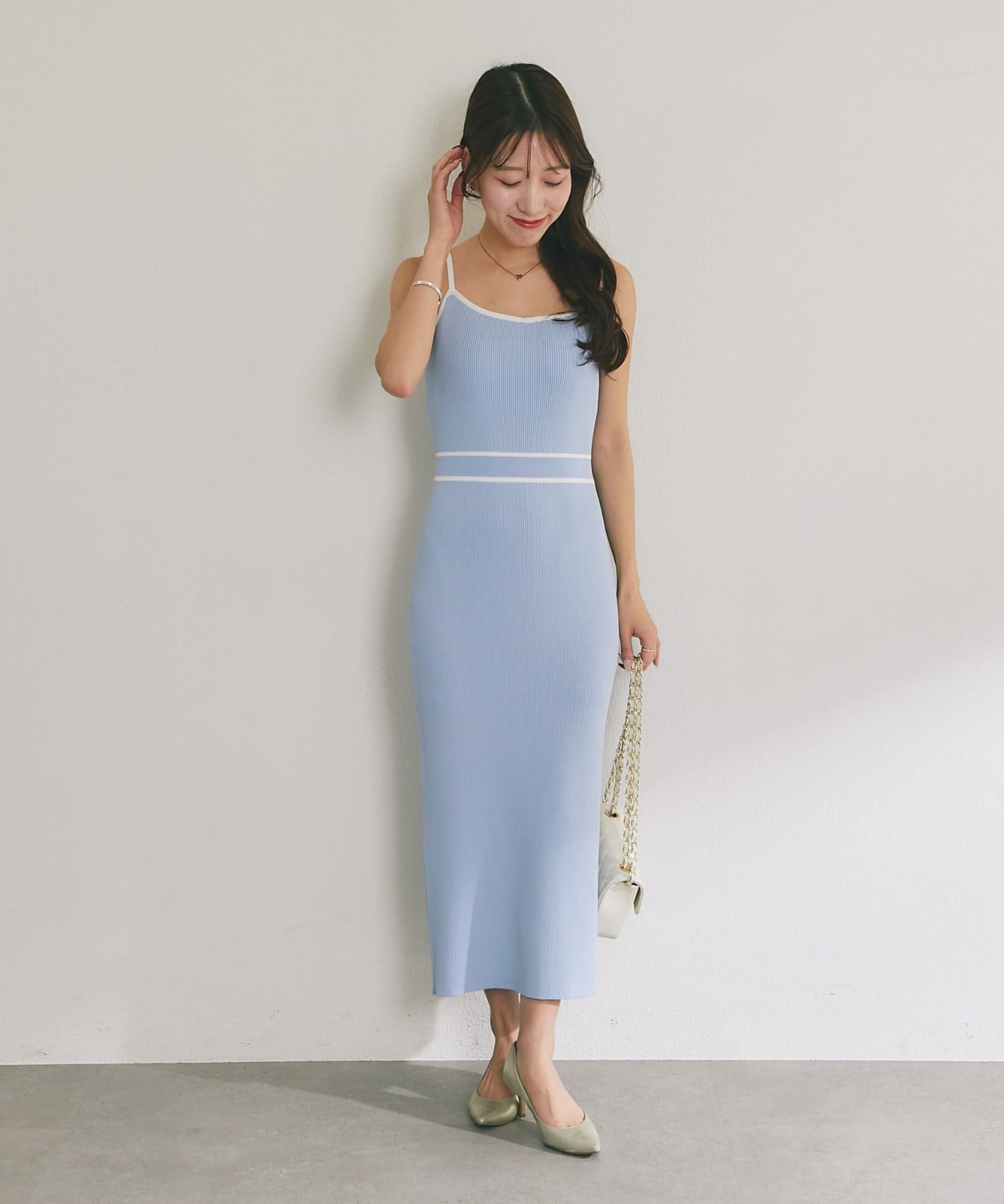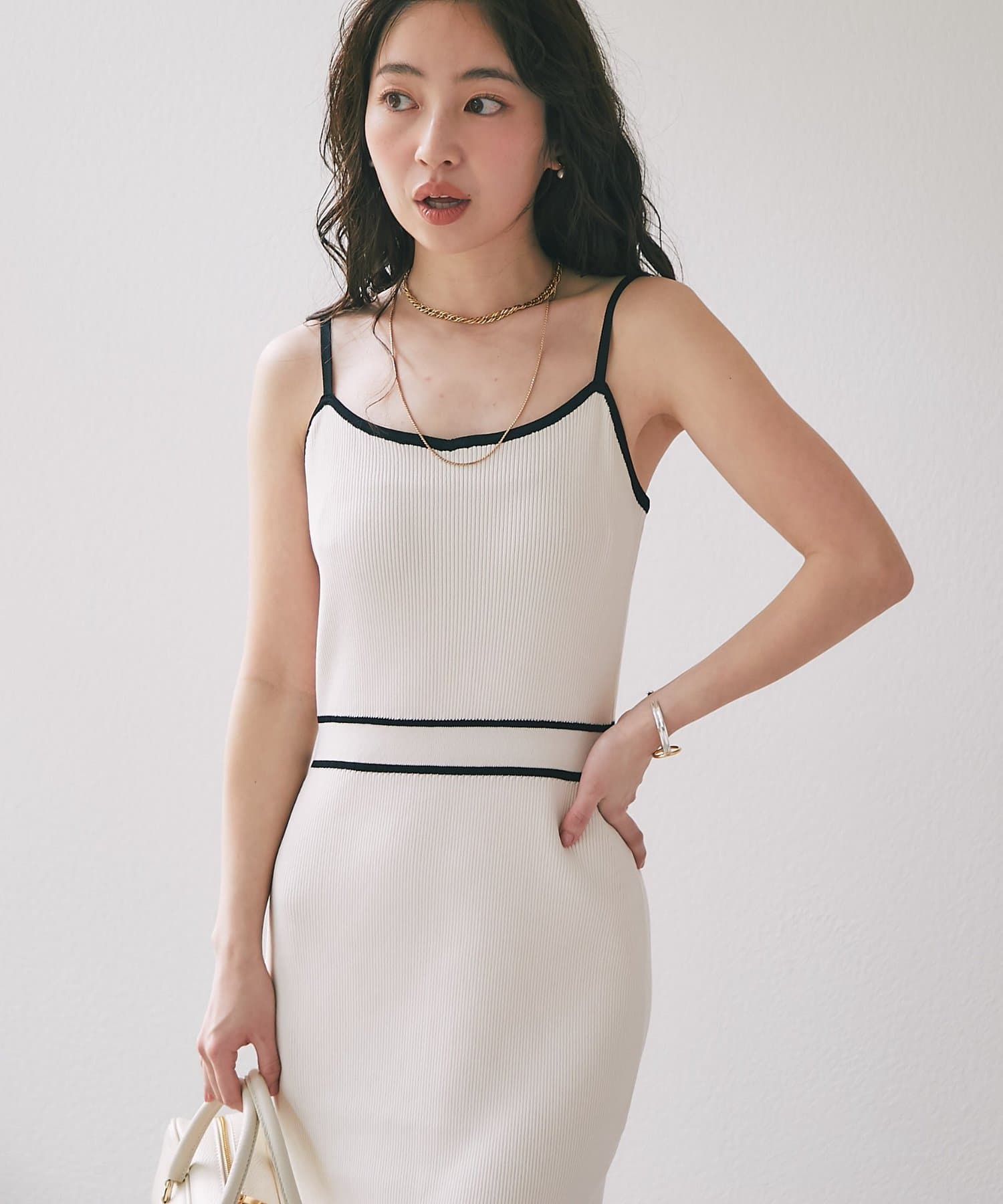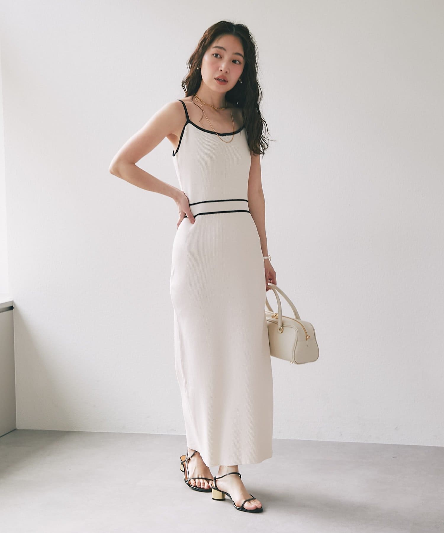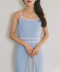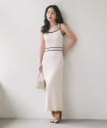 縦ラインを強調するリブ編みのキャミワンピースは