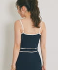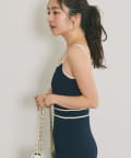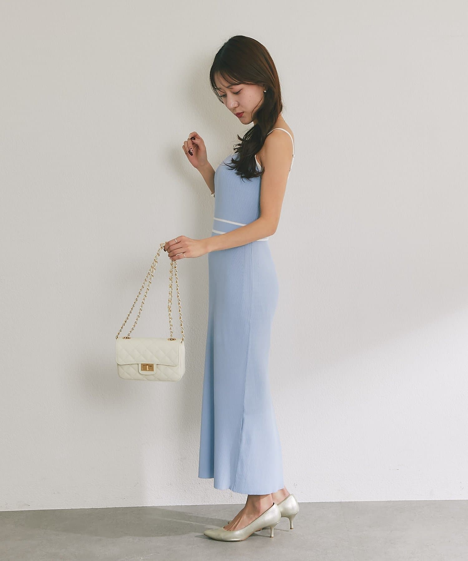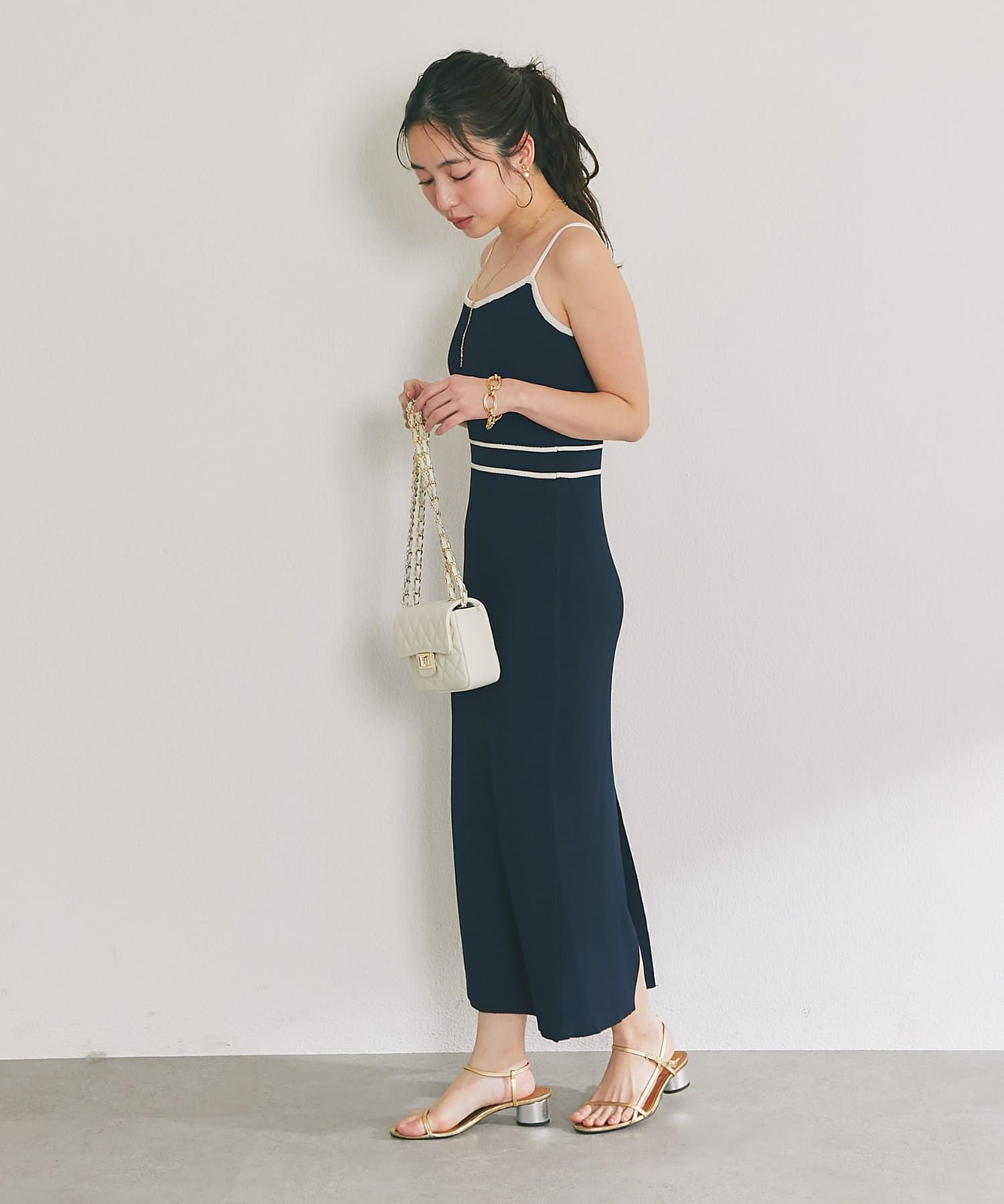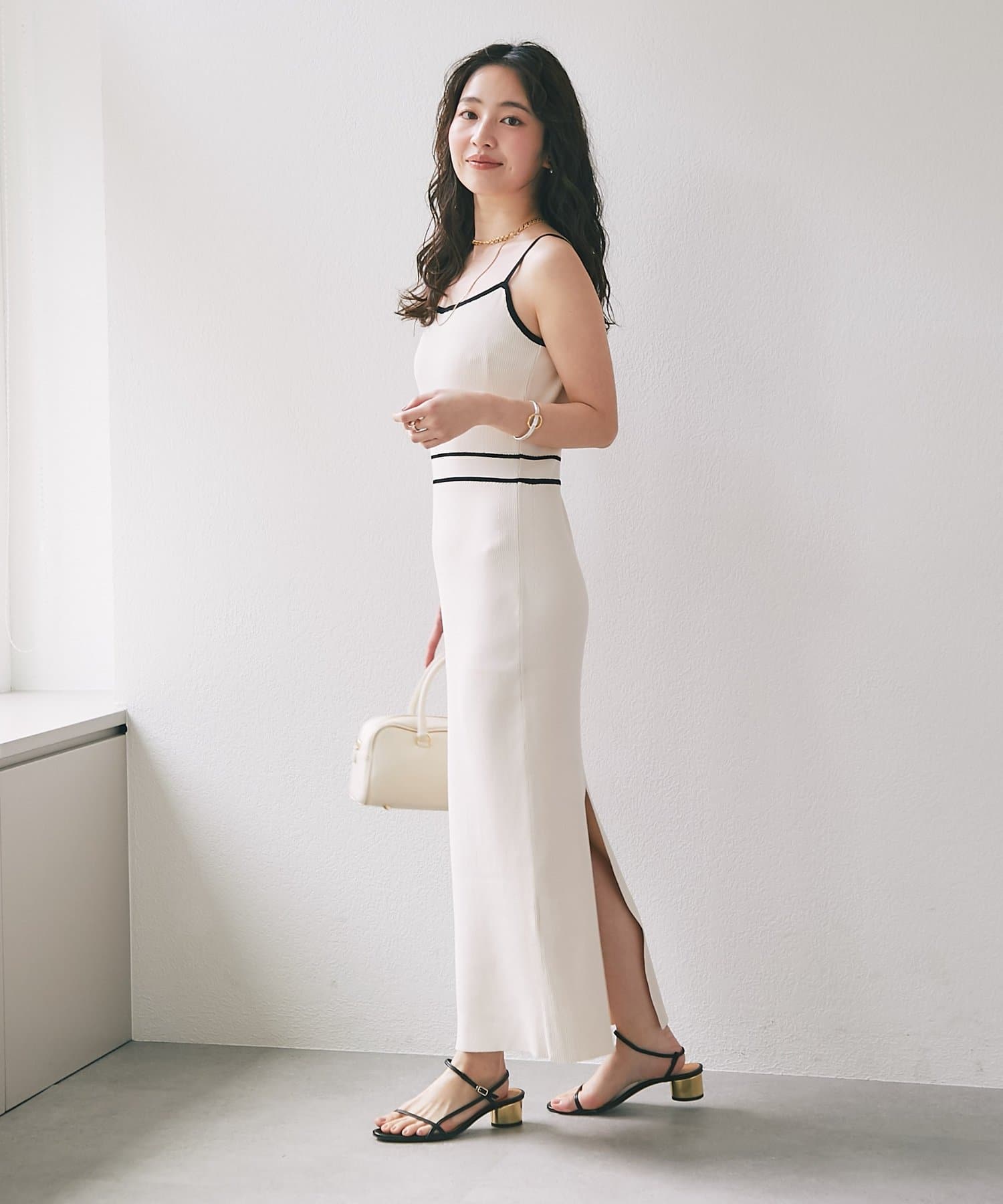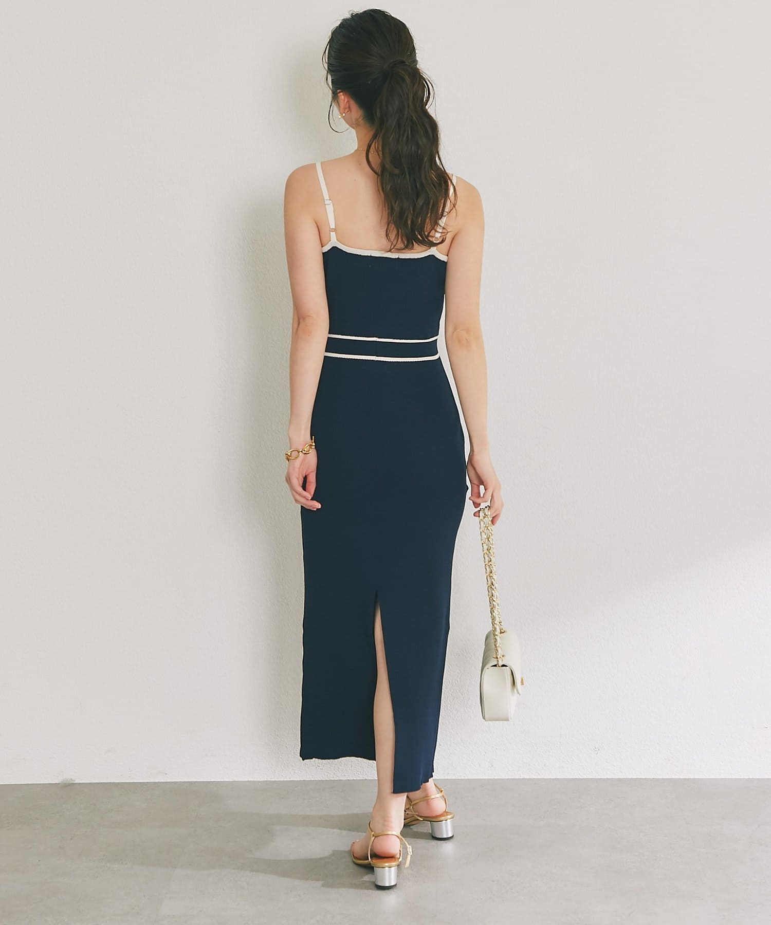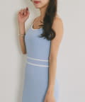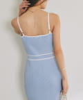 縦ラインを強調するリブ編みのキャミワンピースは