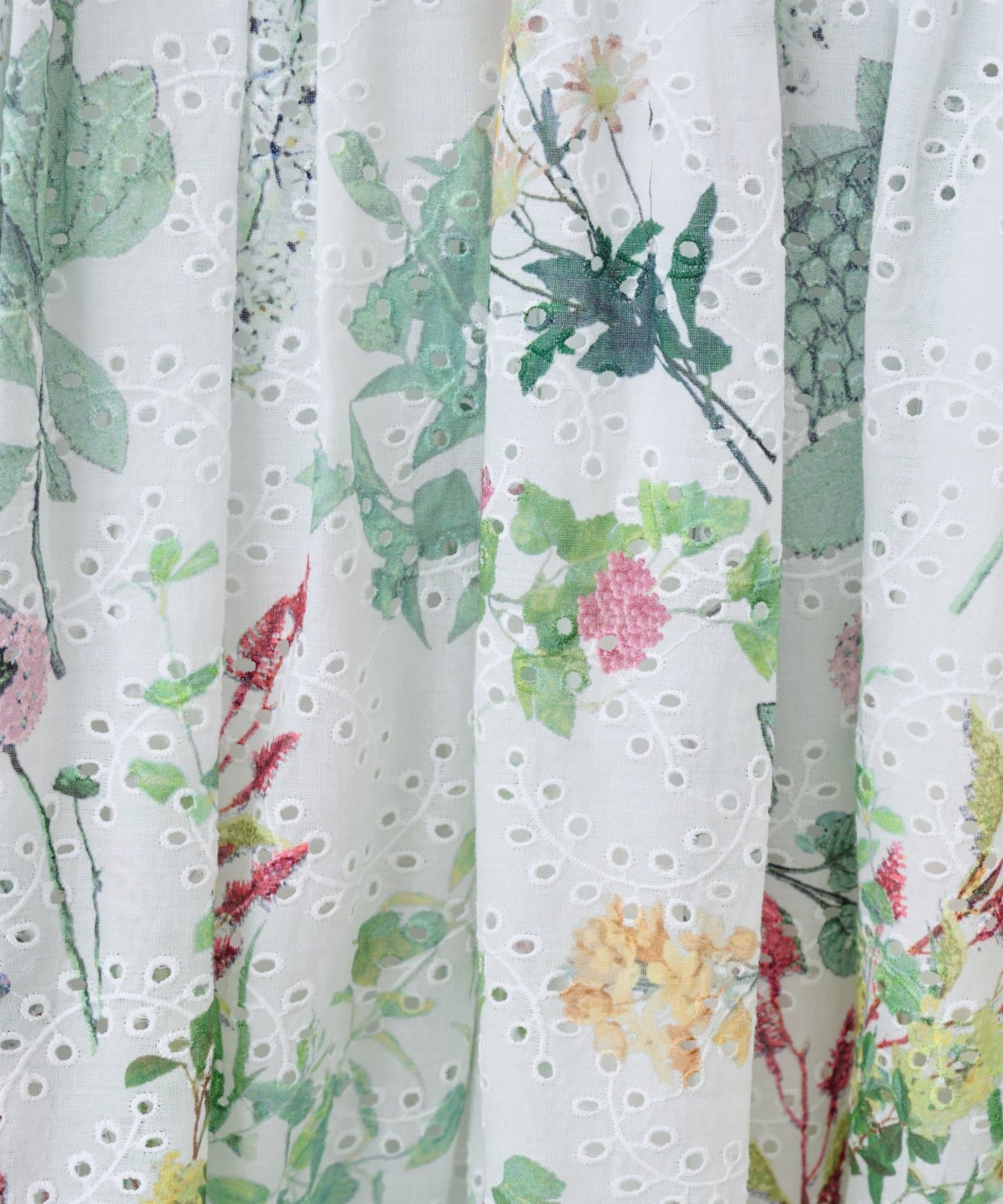 刺繍の施された生地に、他にはない自然な花柄がプリントされたエレガントな一枚。