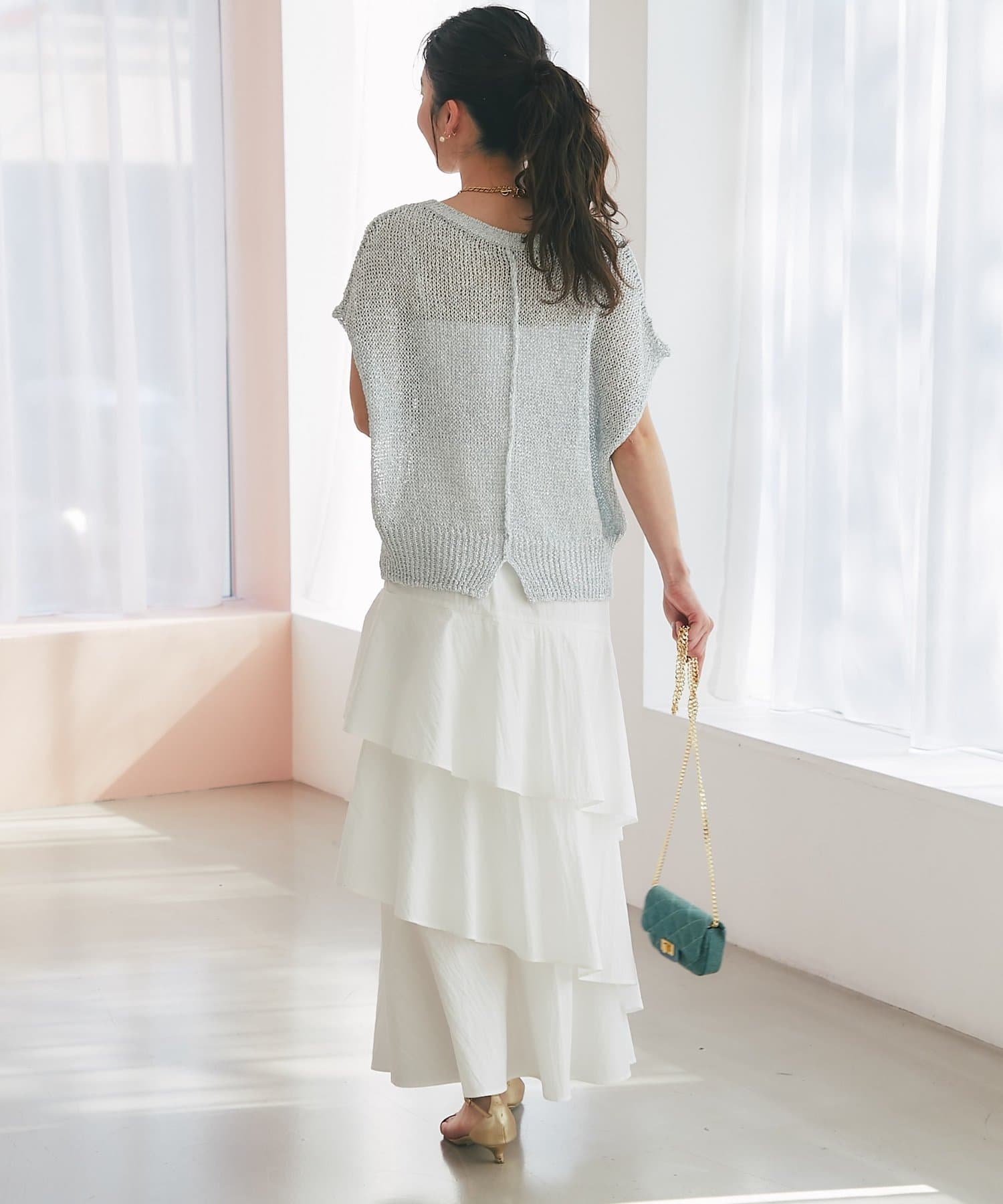 タイトなトップスはもちろんデザインのあるブラウスなどとの着こなしもおすすめ。