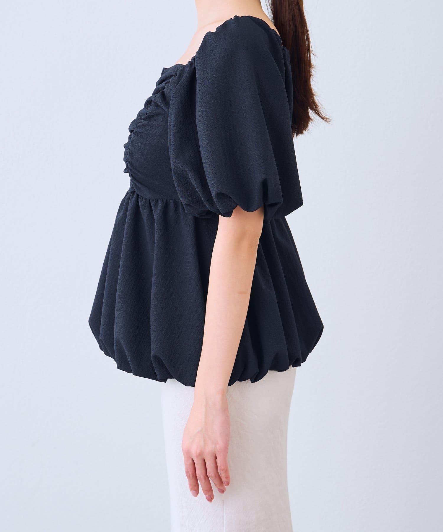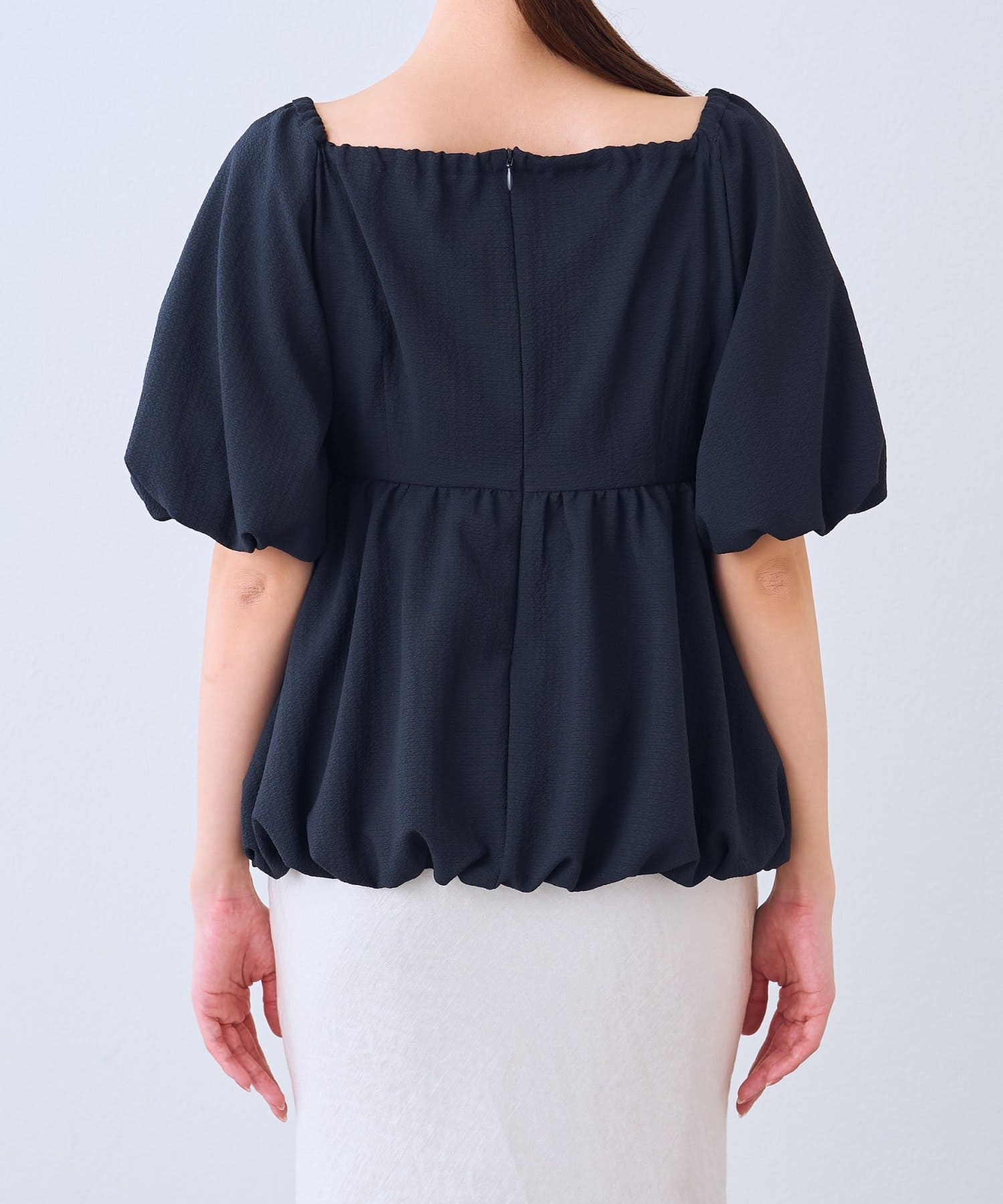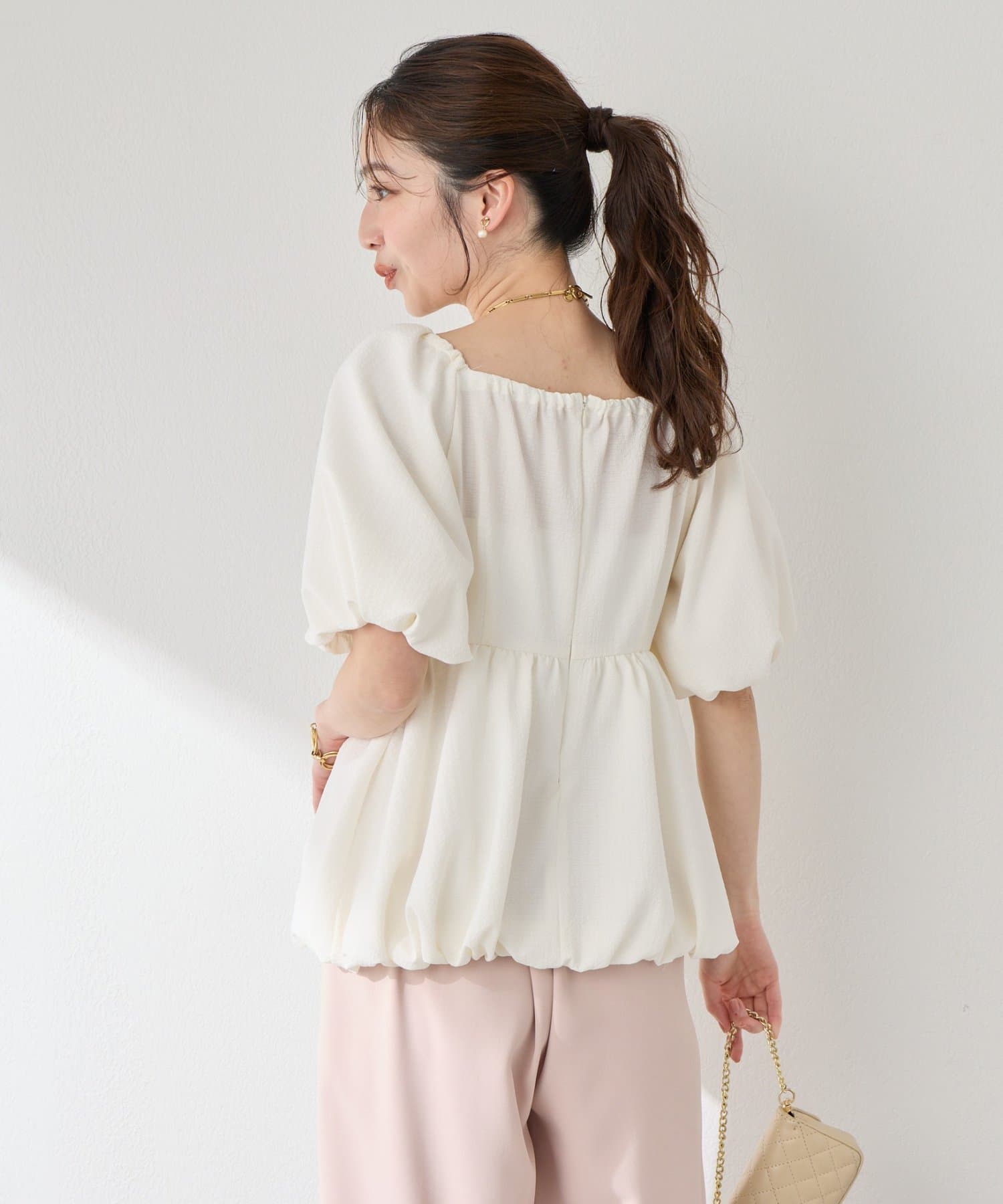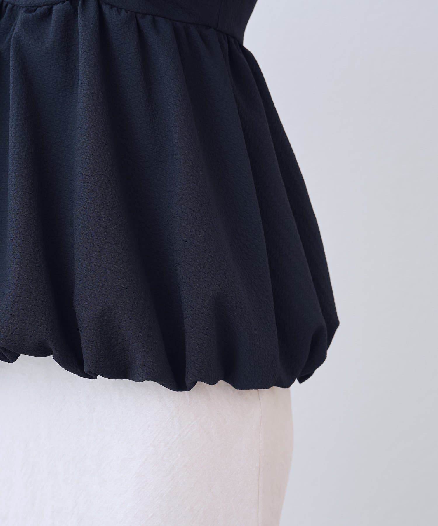 ふんわりとしたボリュームスリーブと、裾に向かって広がるペプラムシルエットが