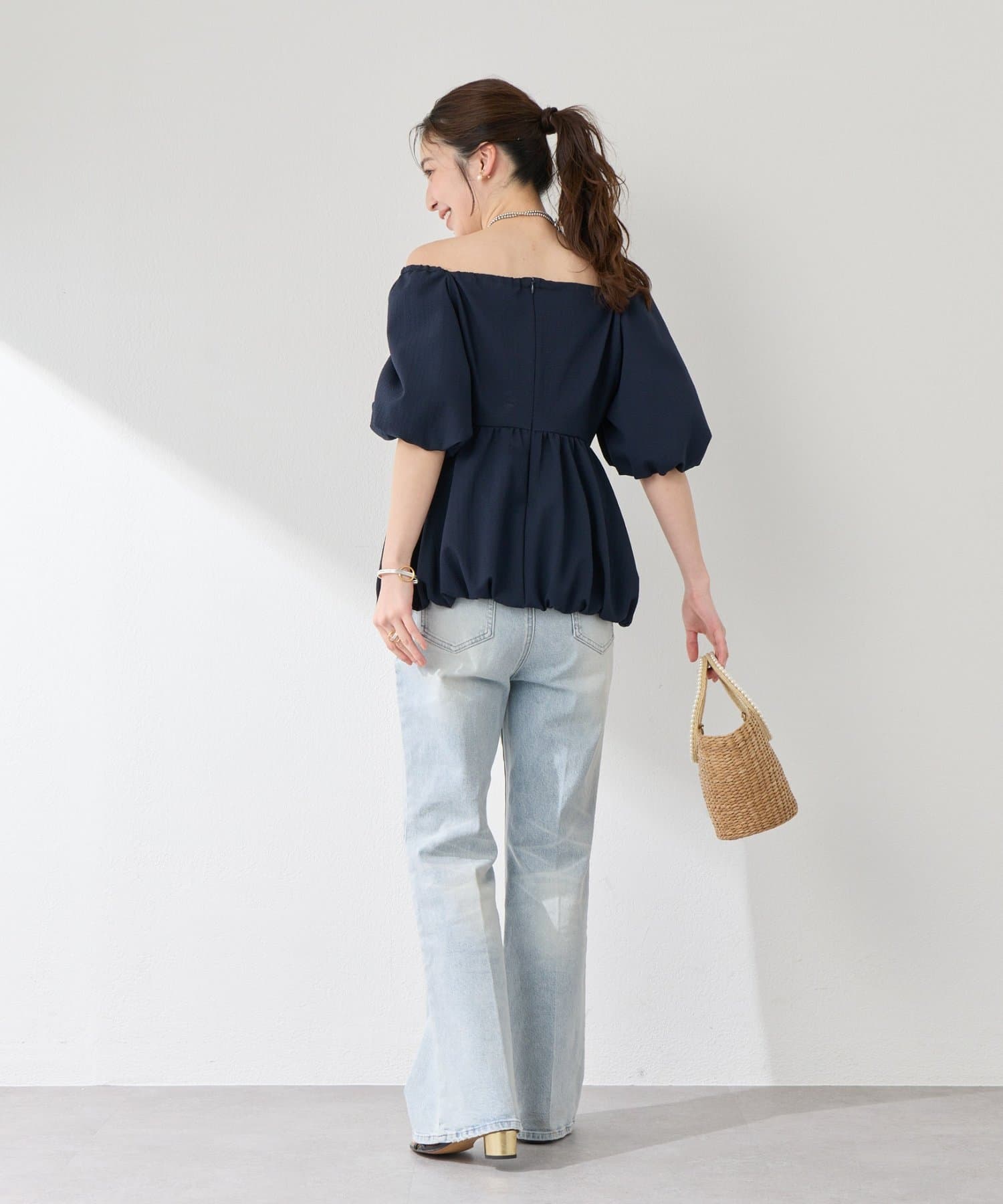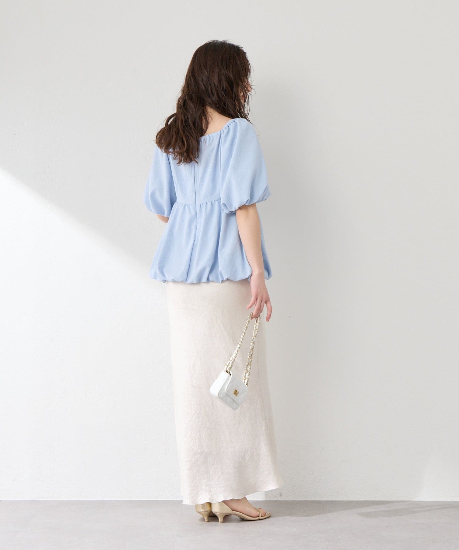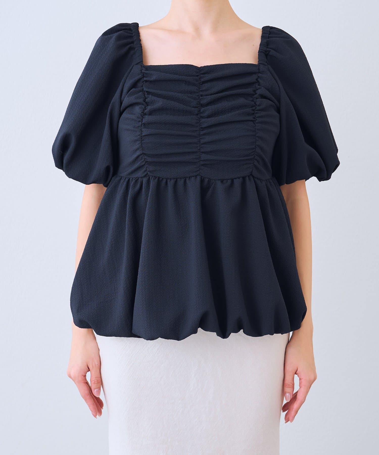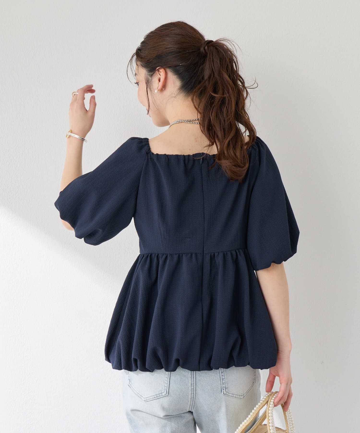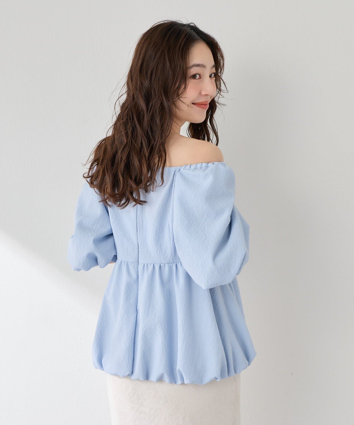 ふんわりとしたボリュームスリーブと、裾に向かって広がるペプラムシルエットが