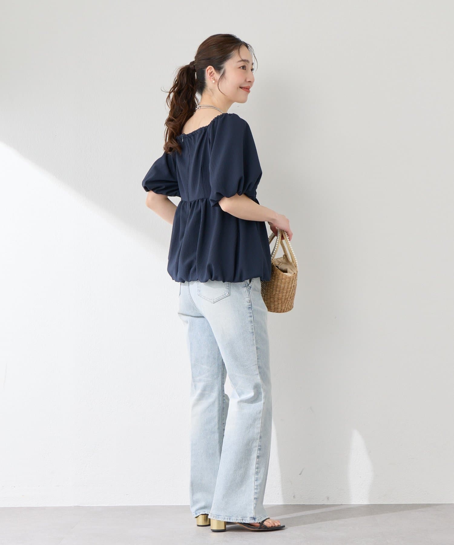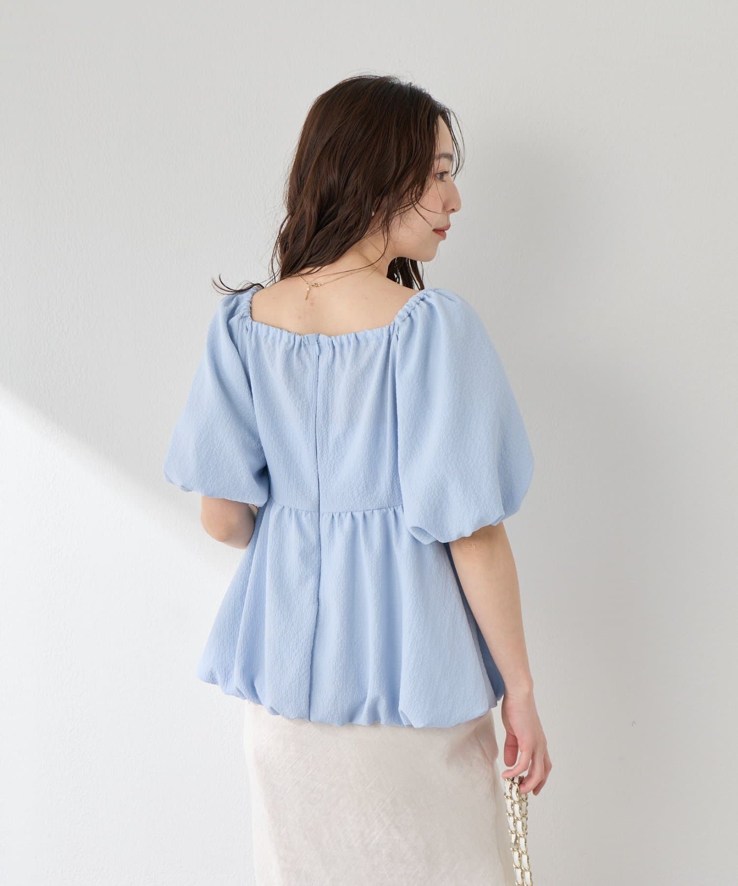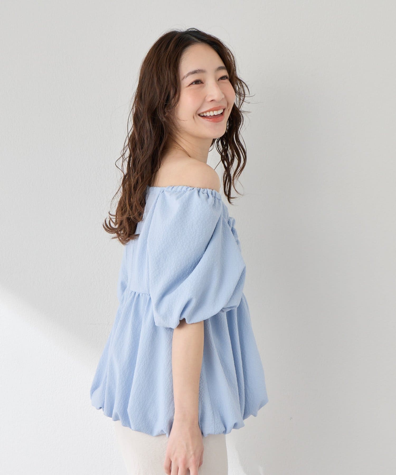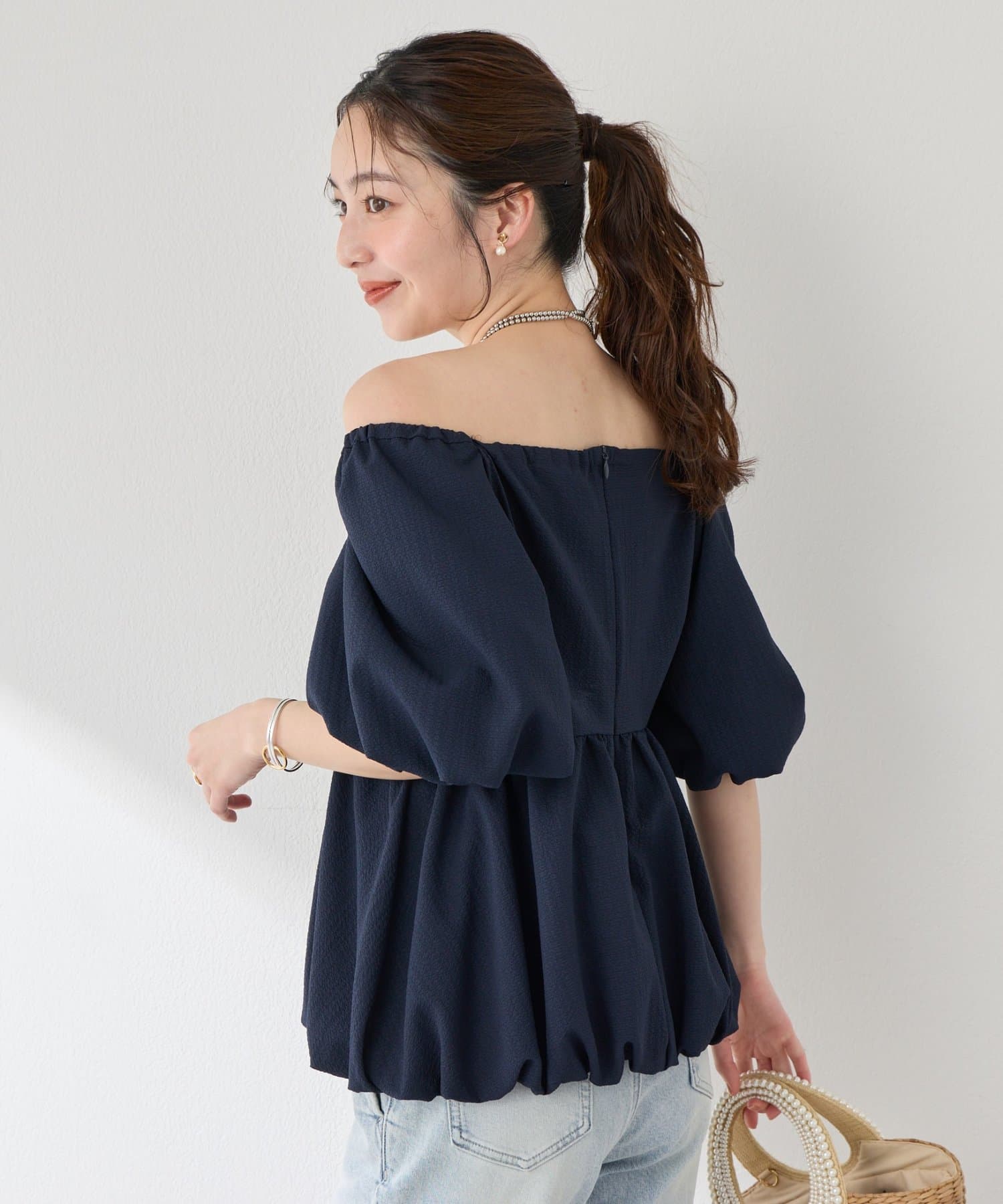 ふんわりとしたボリュームスリーブと、裾に向かって広がるペプラムシルエットが