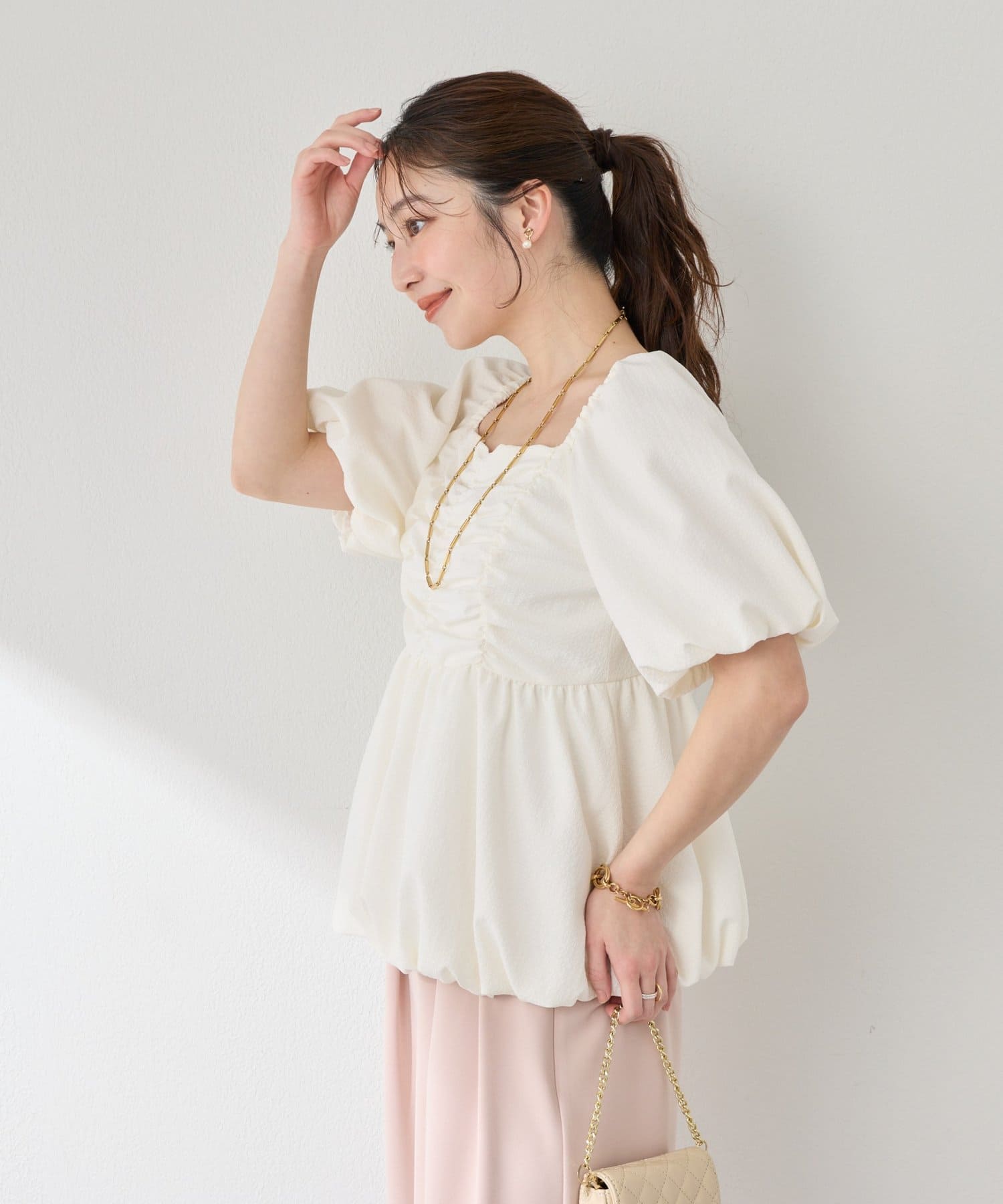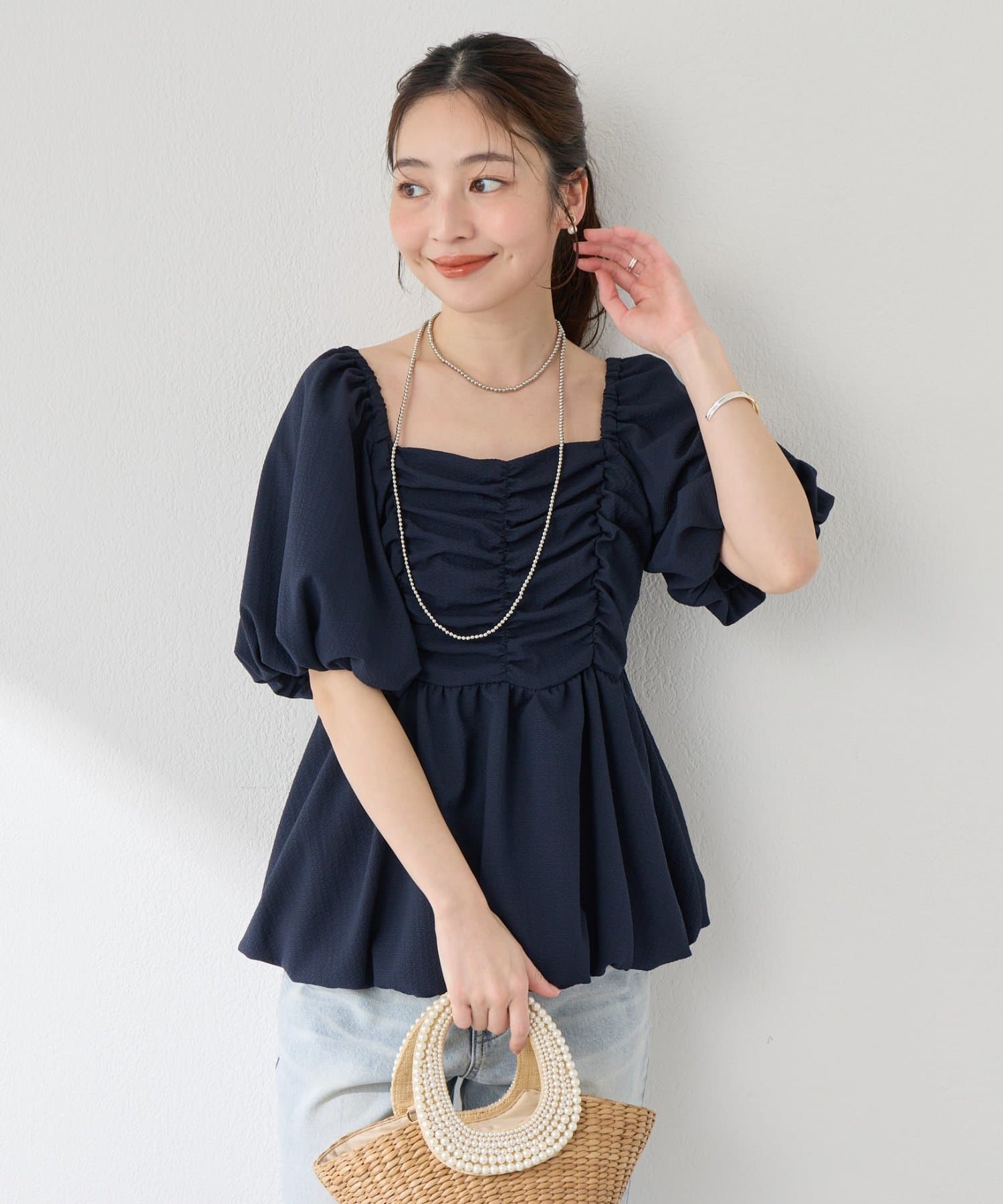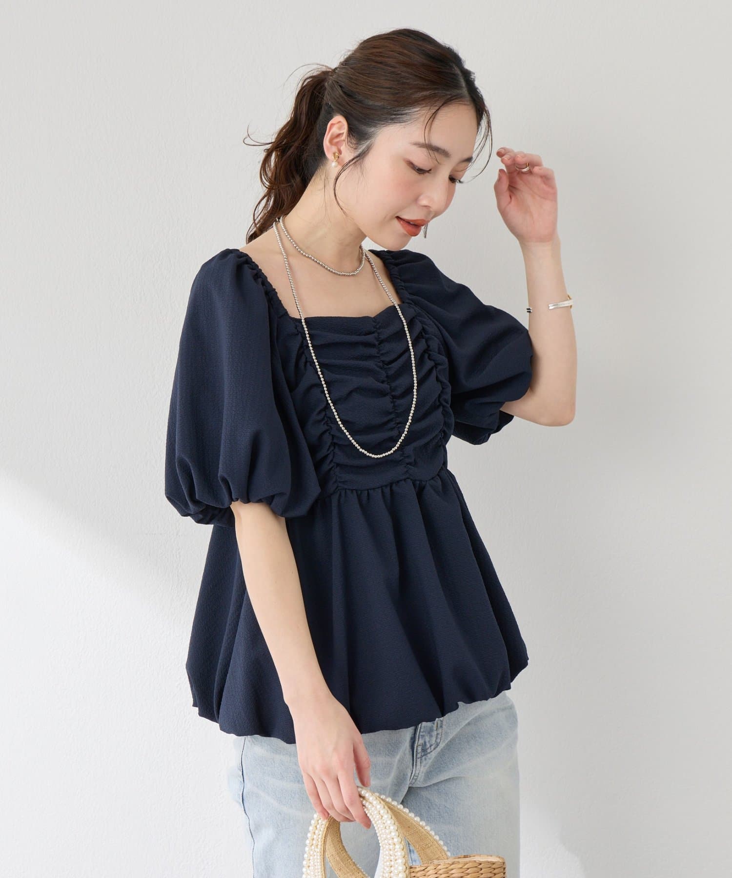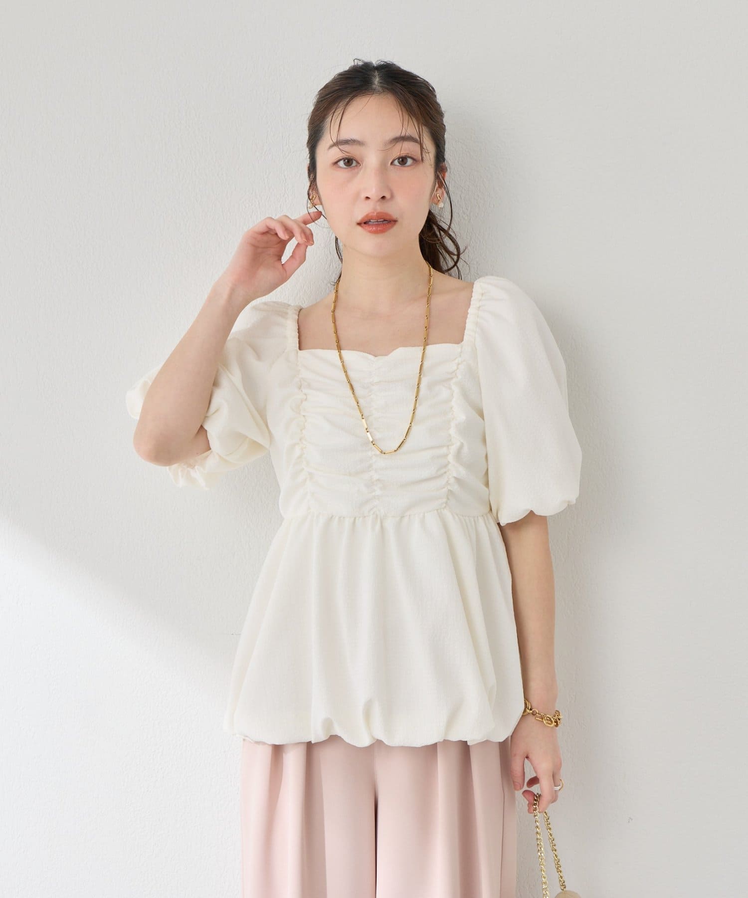 胸元のギャザーデザインが目を引く、フェミニンなブラウス。
