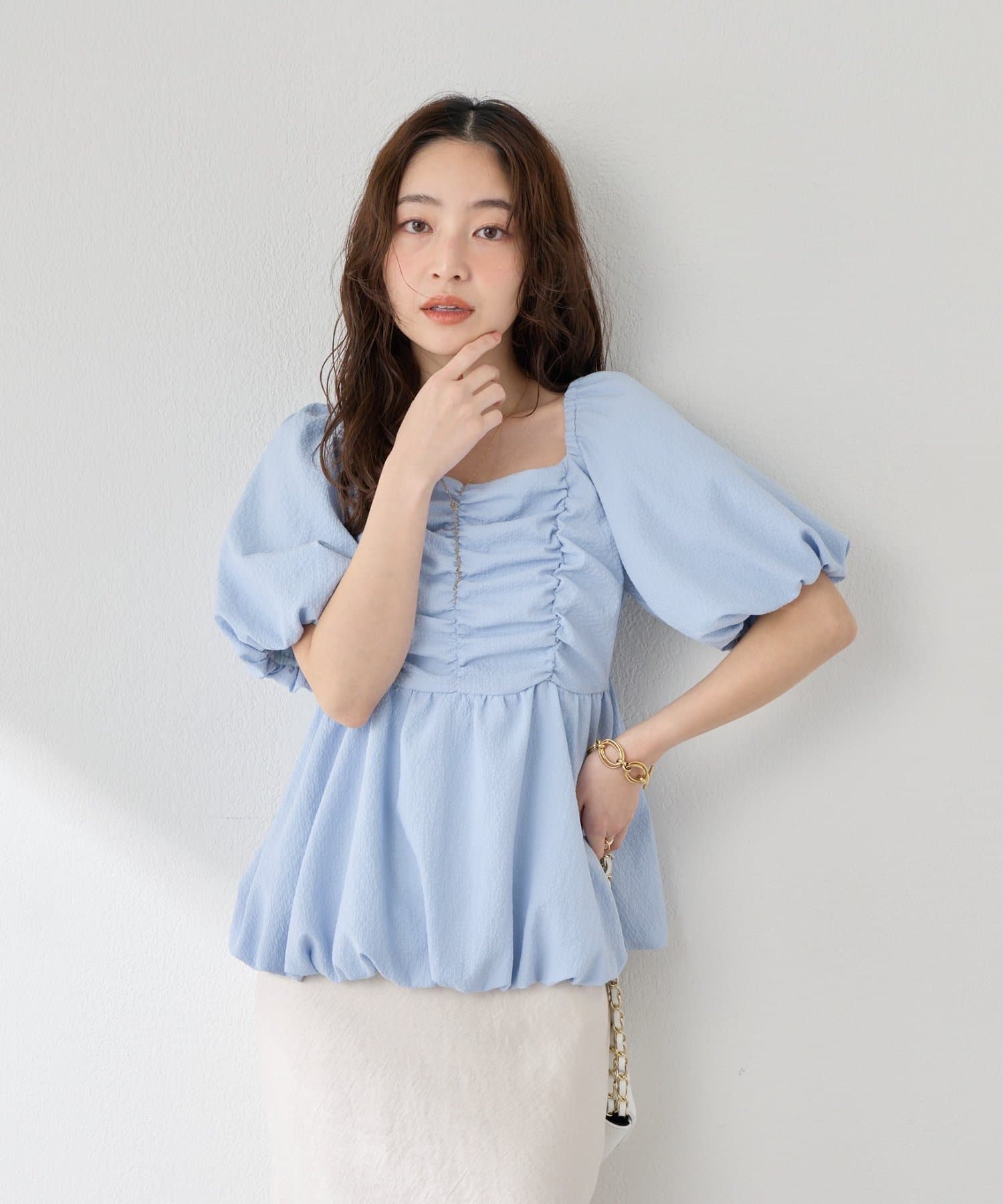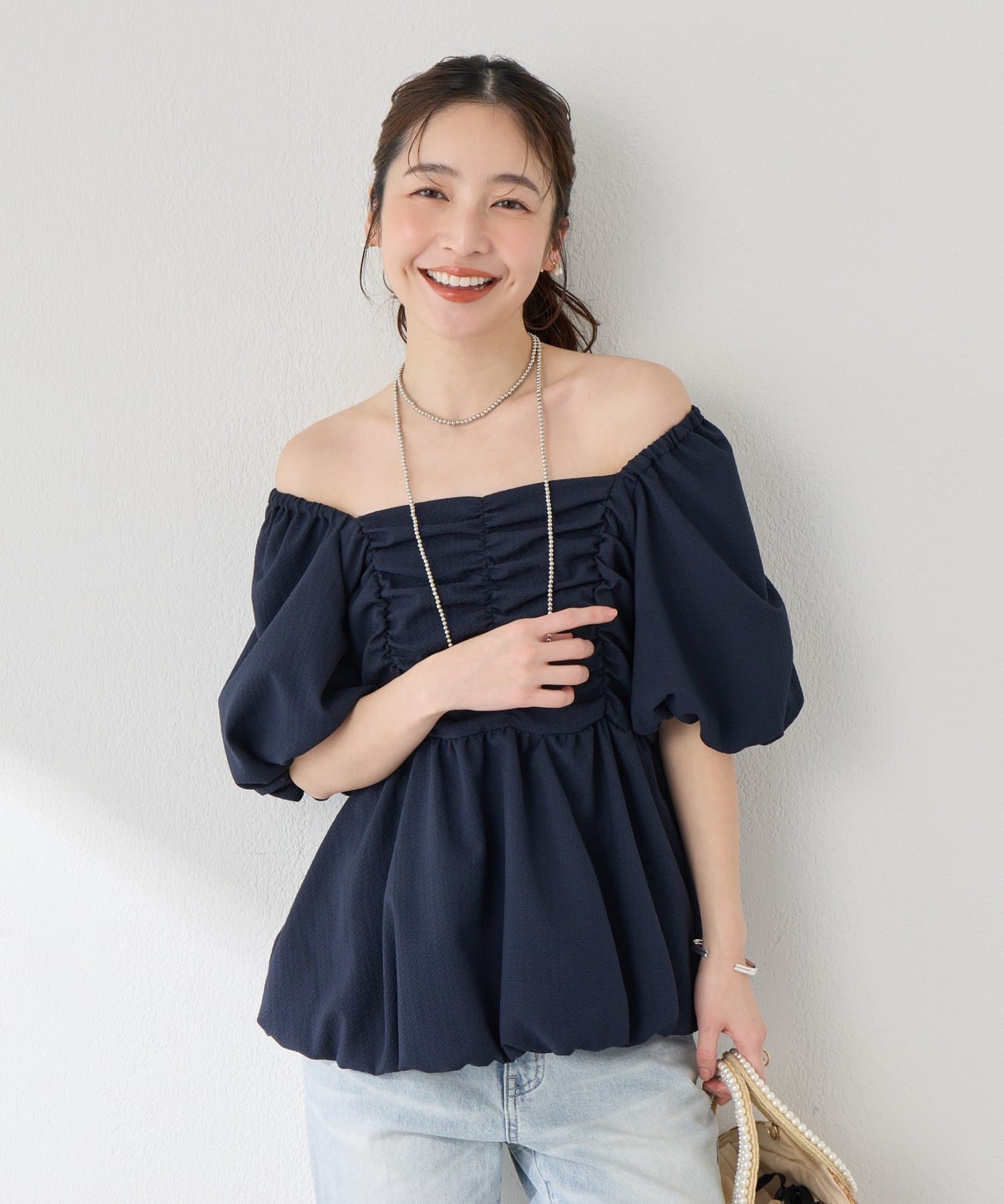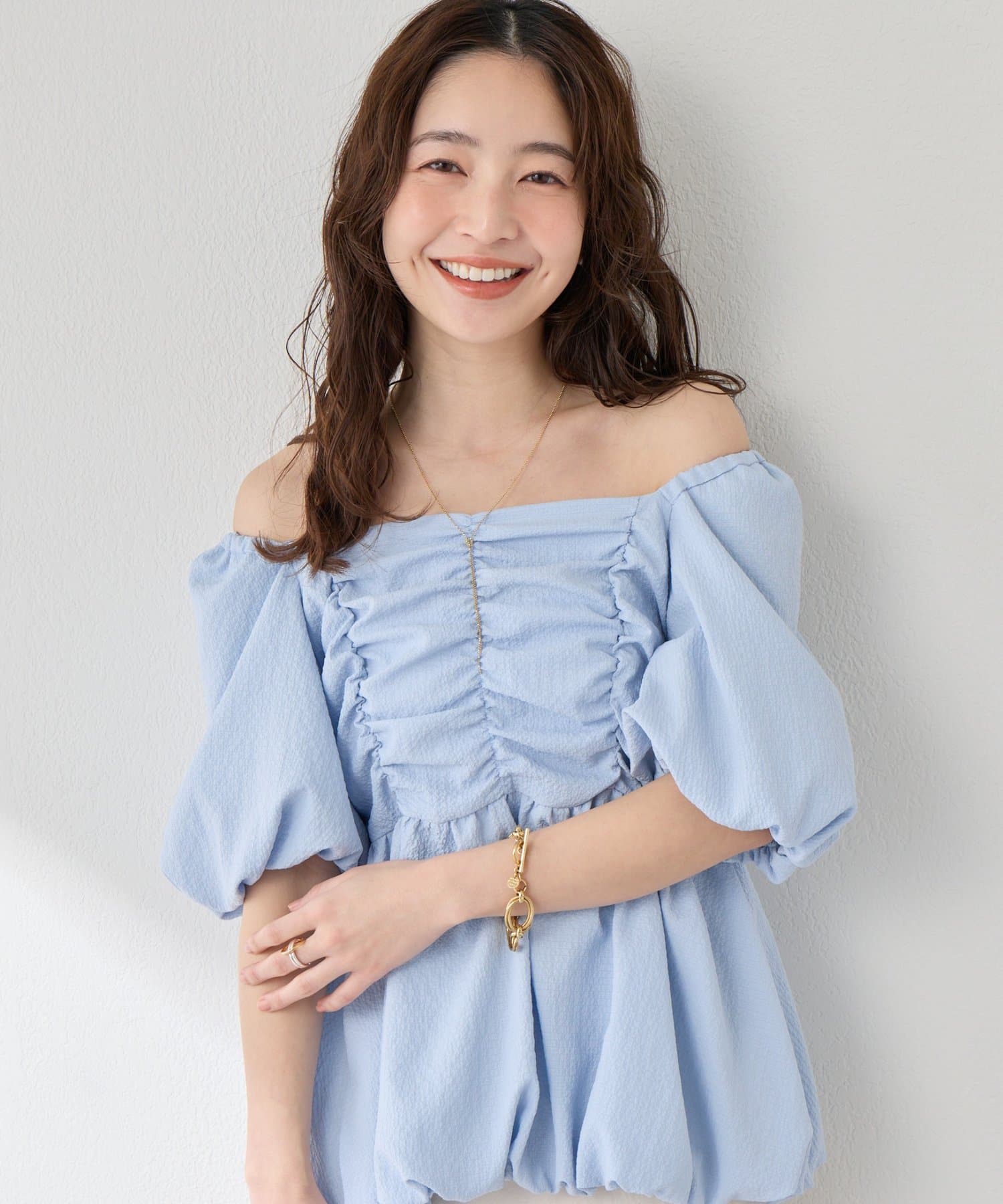 胸元のギャザーデザインが目を引く、フェミニンなブラウス。