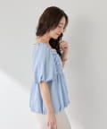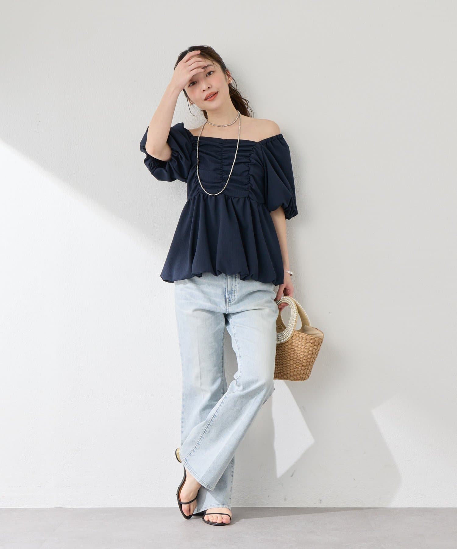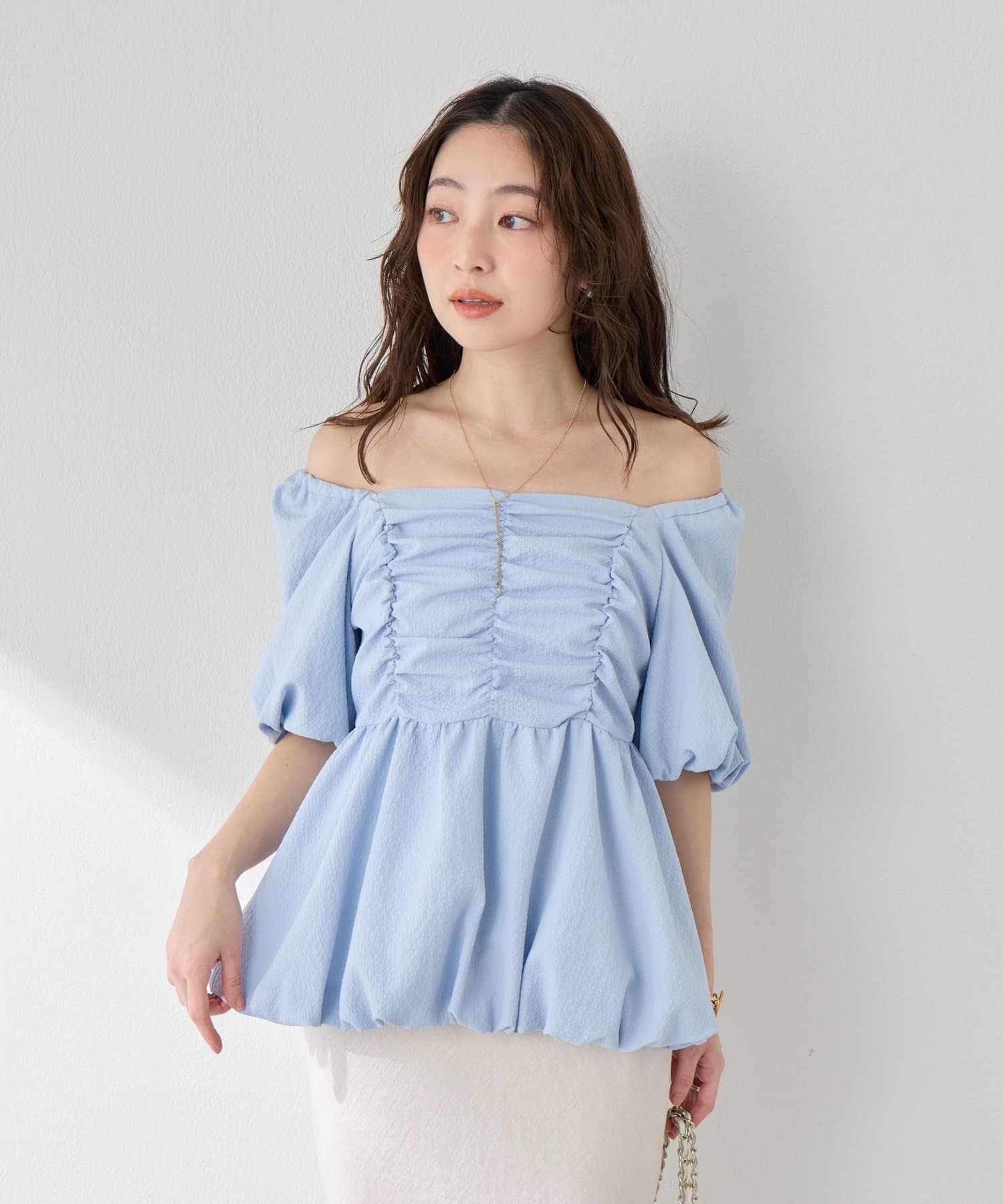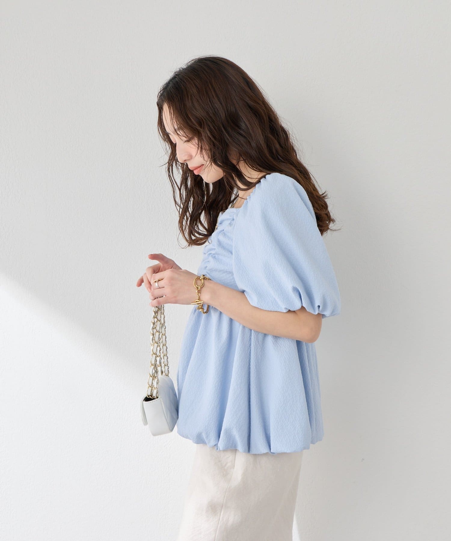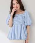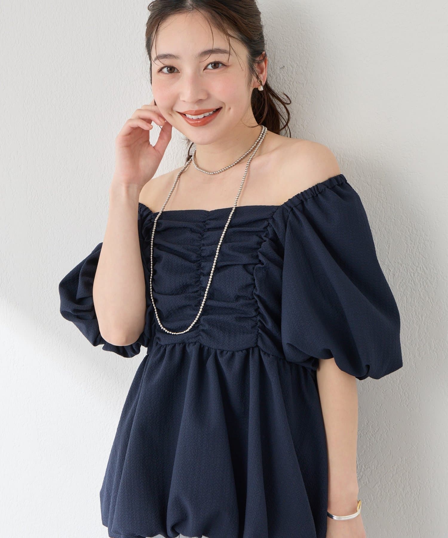 胸元のギャザーデザインが目を引く、フェミニンなブラウス。