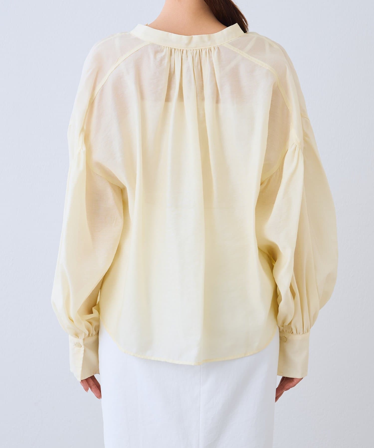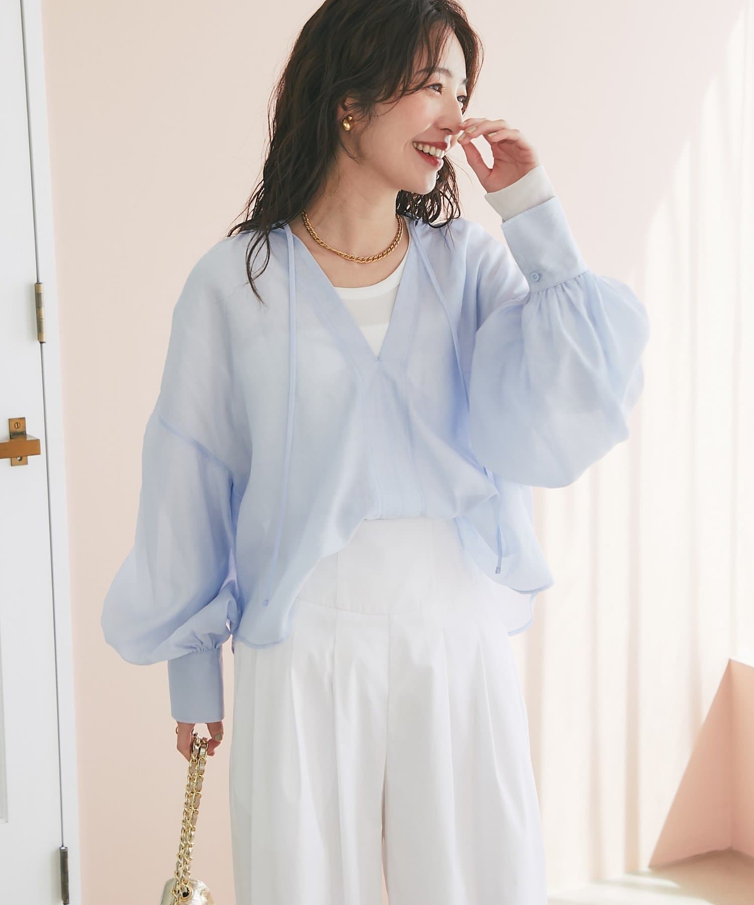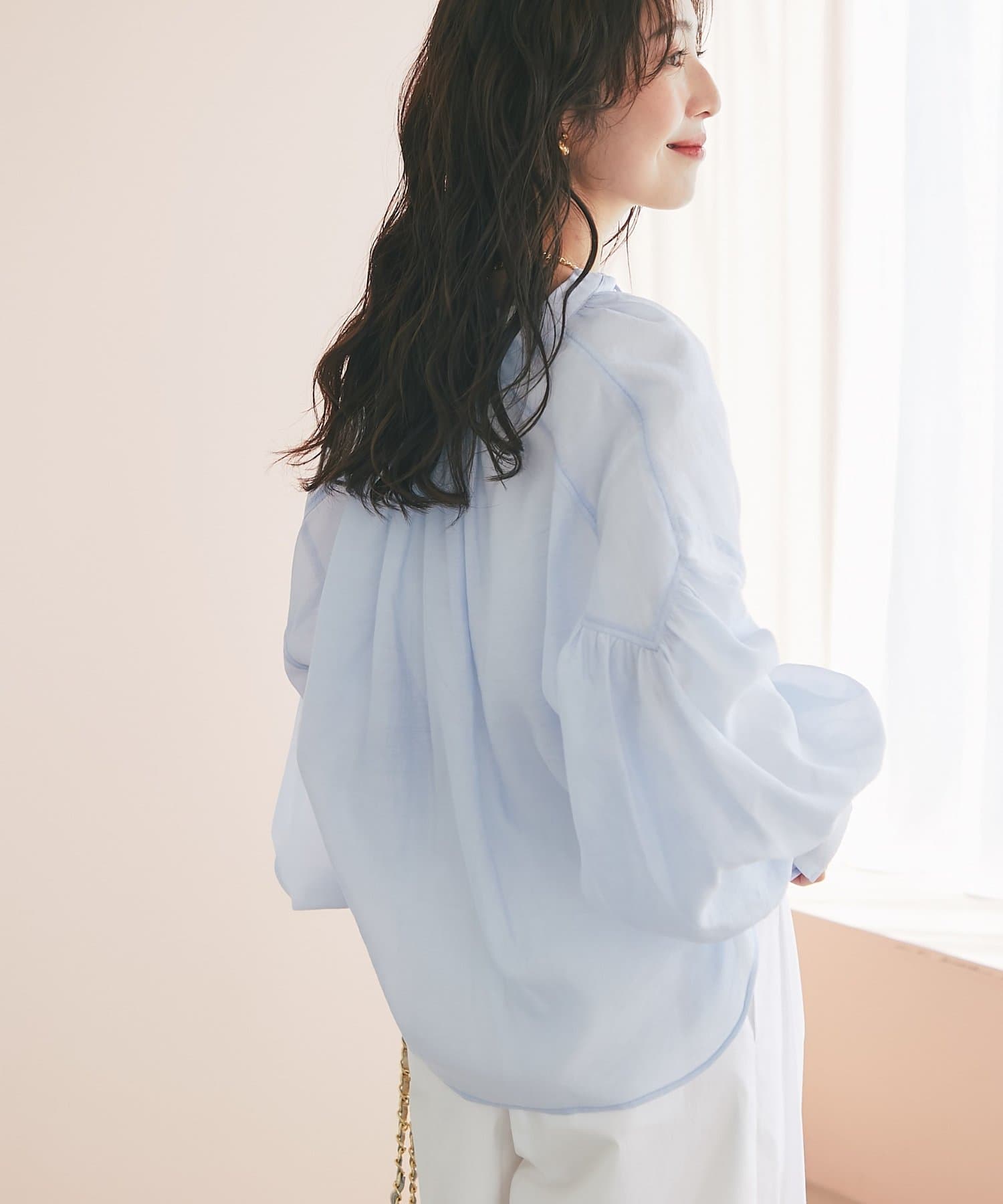 程よい透け感のあるバルーンスリーブは、腕を華奢に見せ女性らしい優しさをプラス。