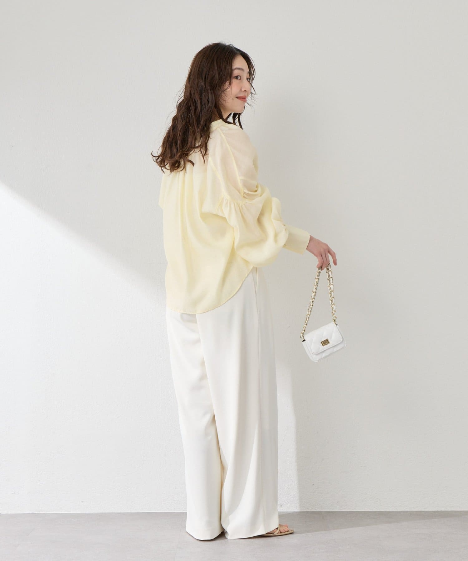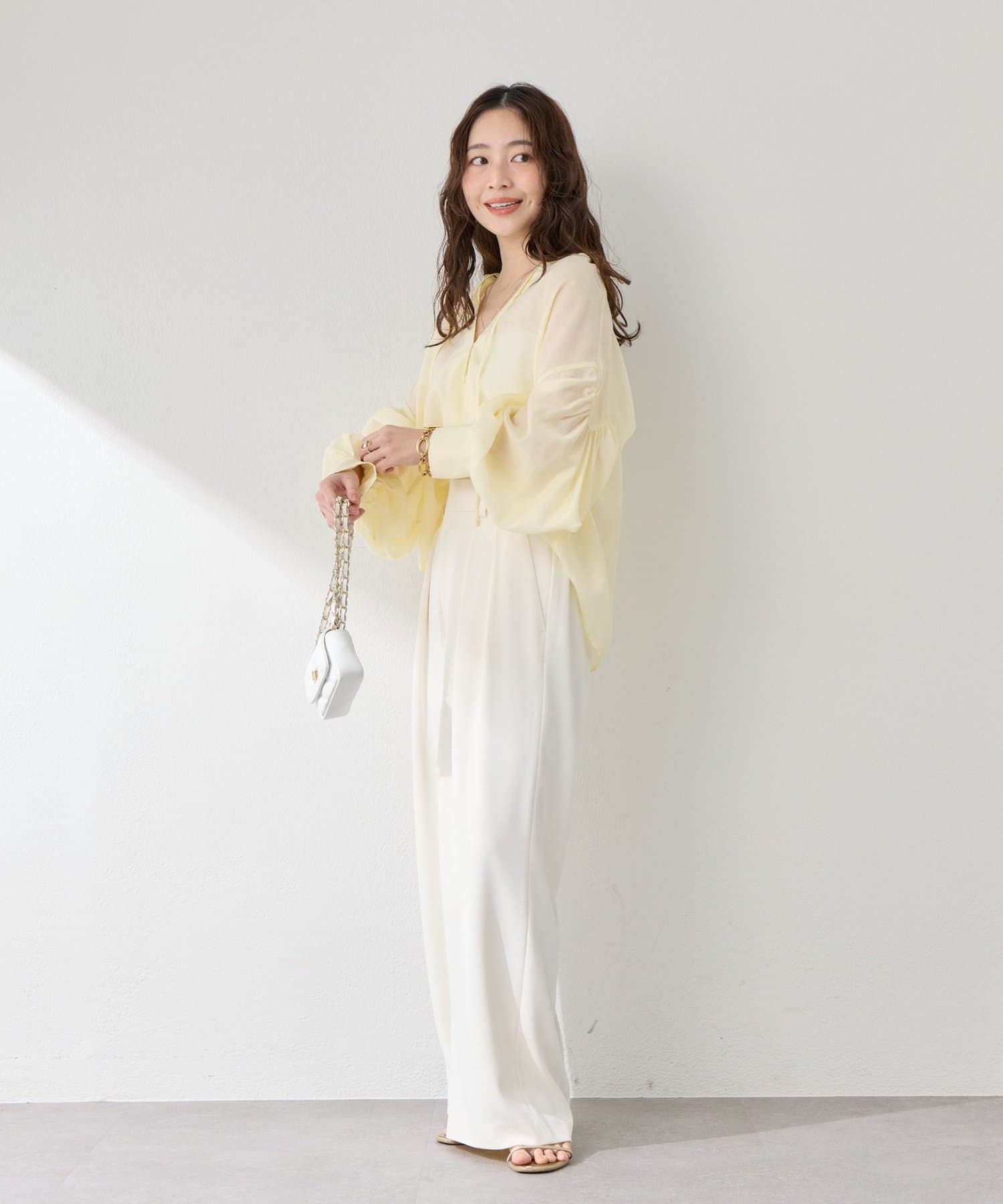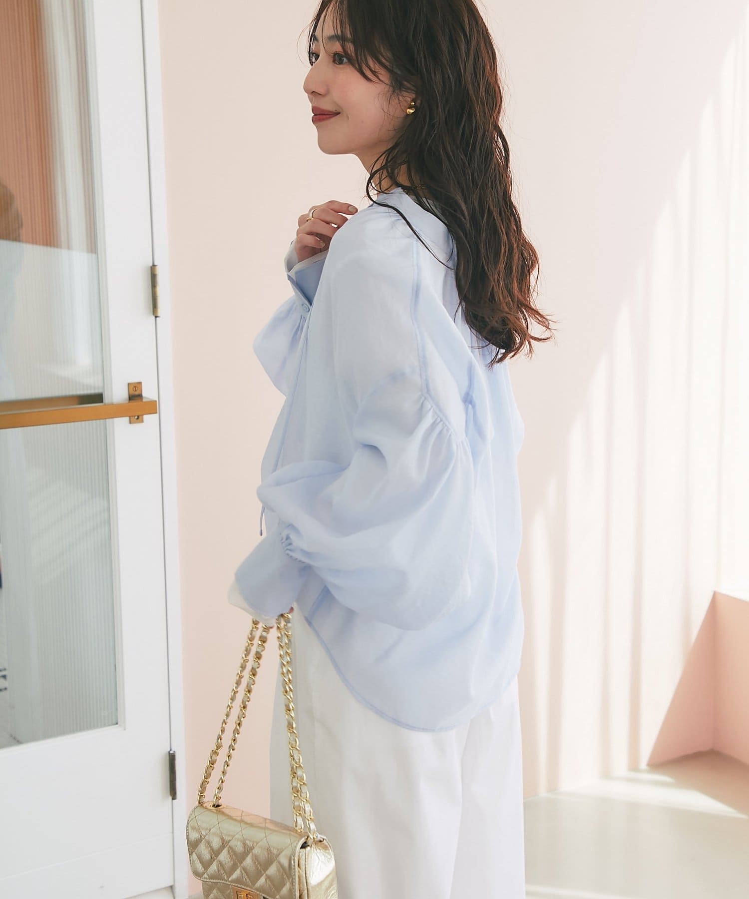 程よい透け感のあるバルーンスリーブは、腕を華奢に見せ女性らしい優しさをプラス。