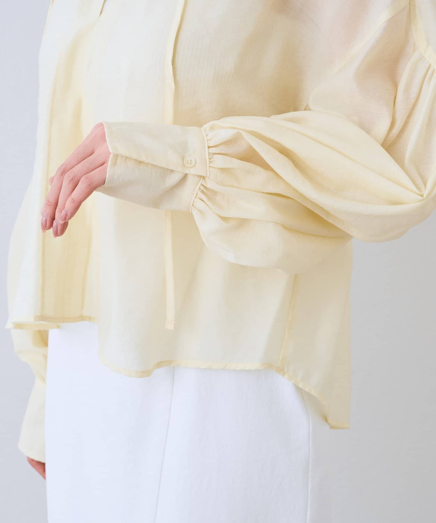 程よい透け感のあるバルーンスリーブは、腕を華奢に見せ女性らしい優しさをプラス。