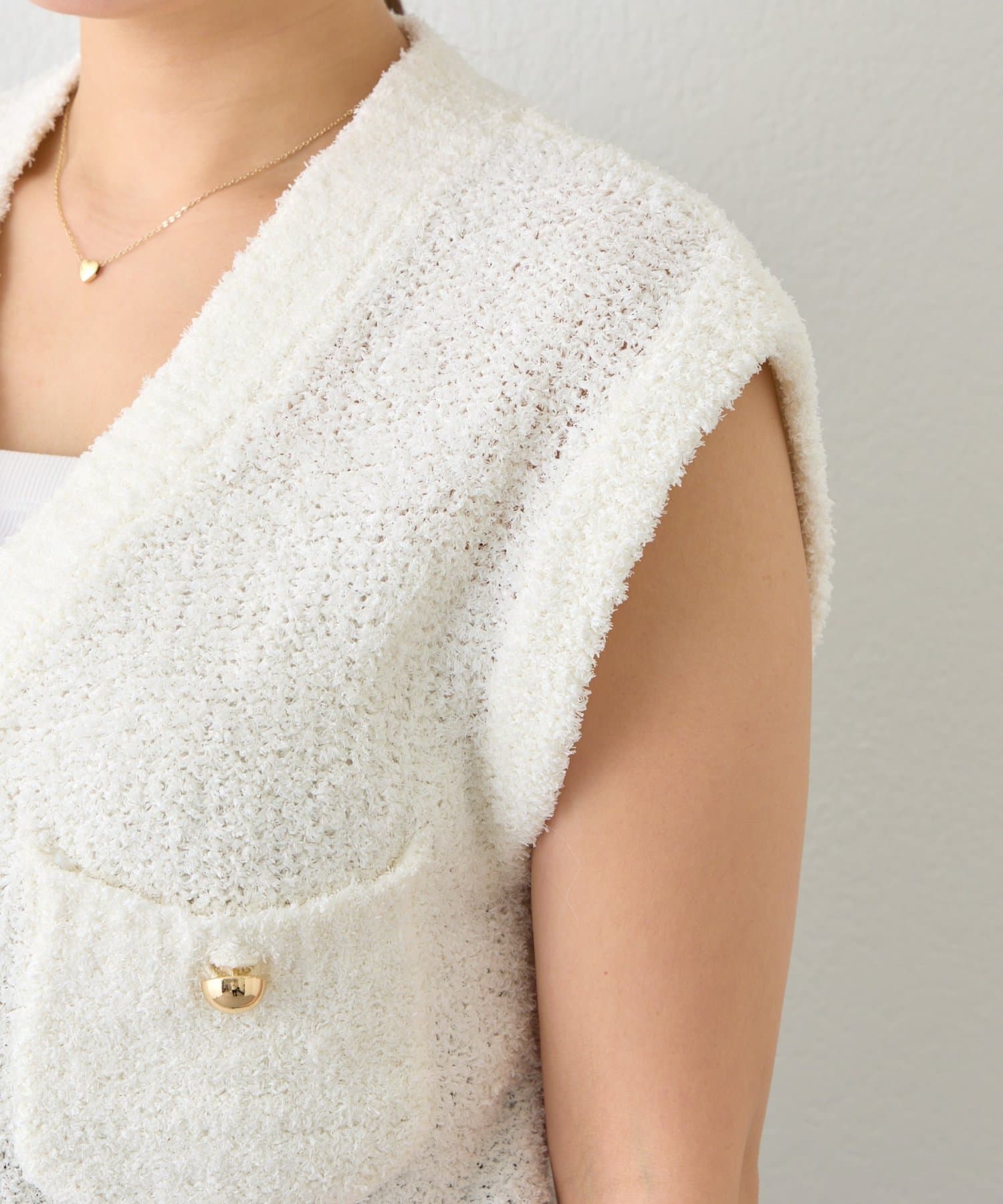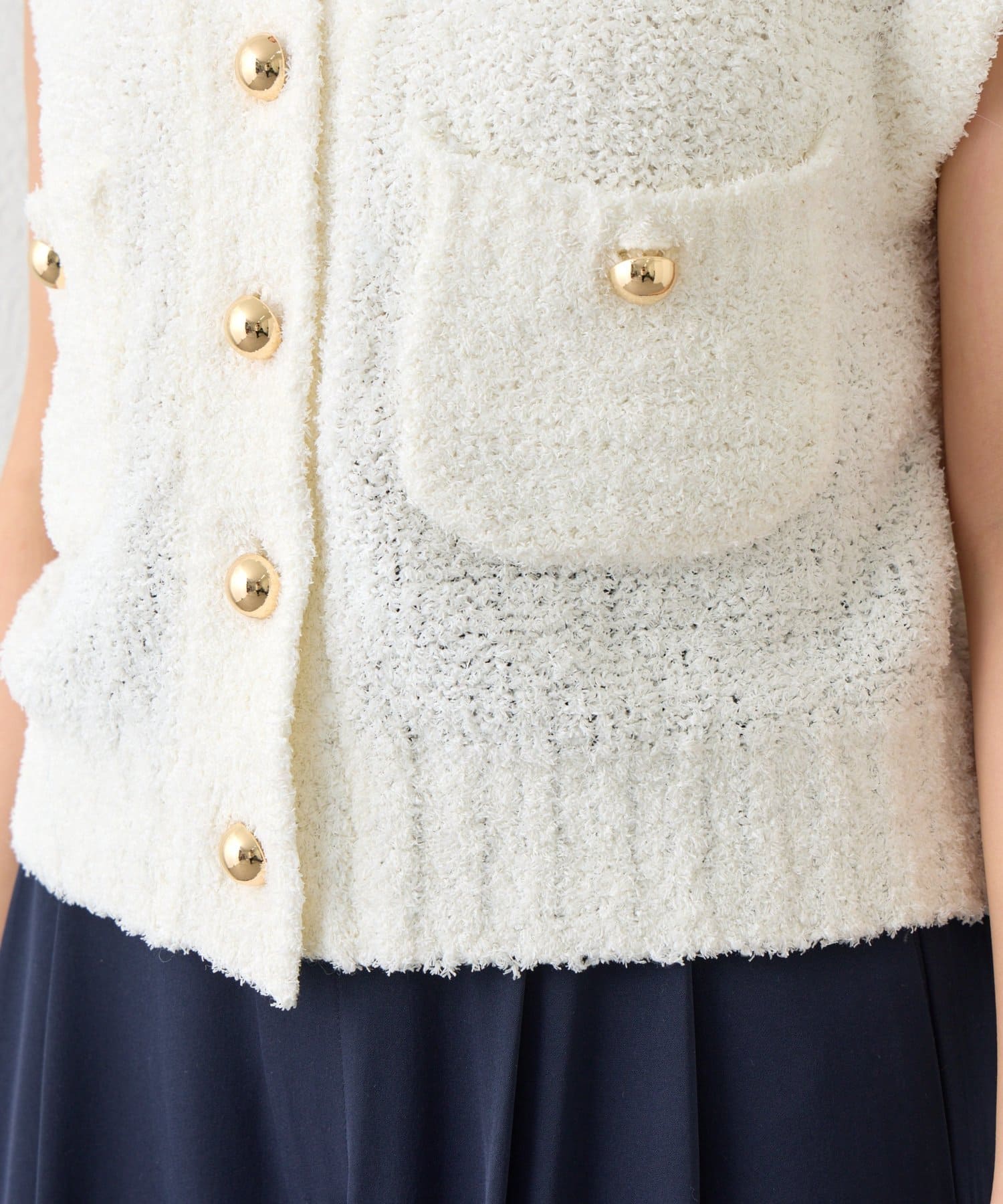 ふんわりした素材にゴールドのころころっとした丸みのある釦アクセントに。