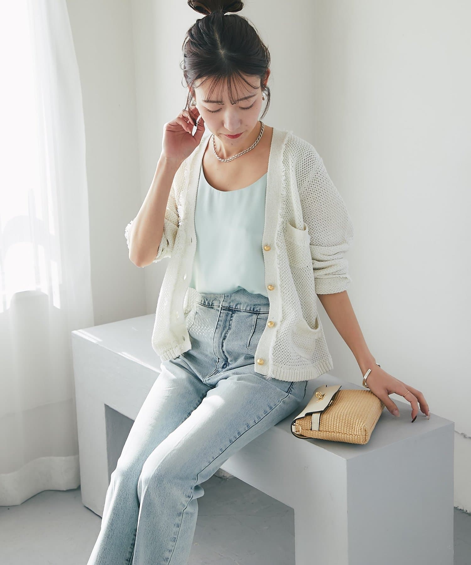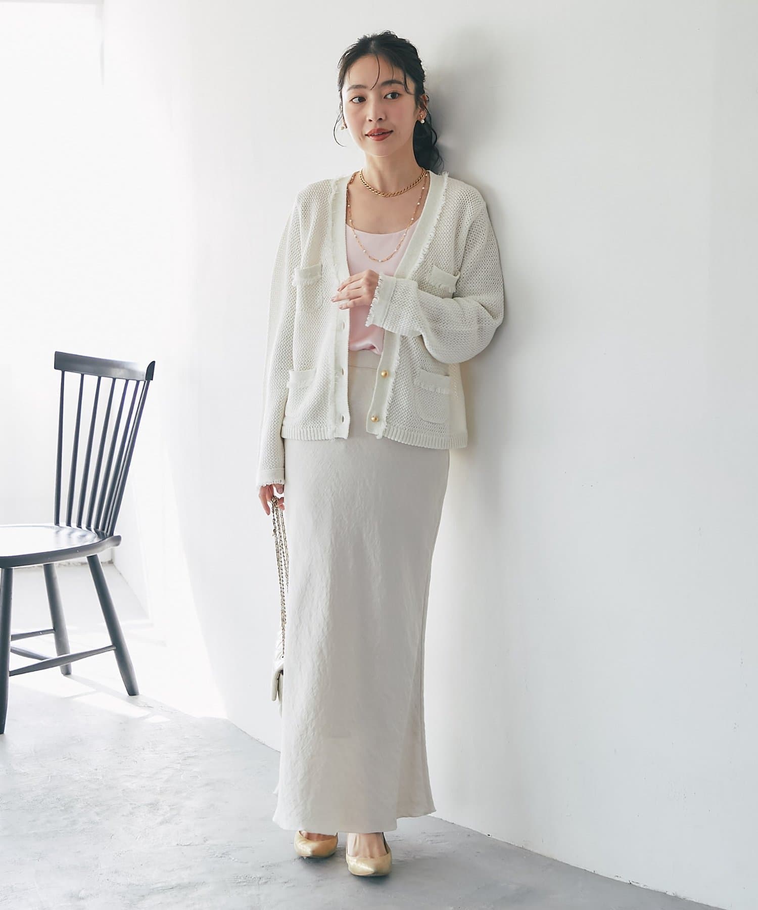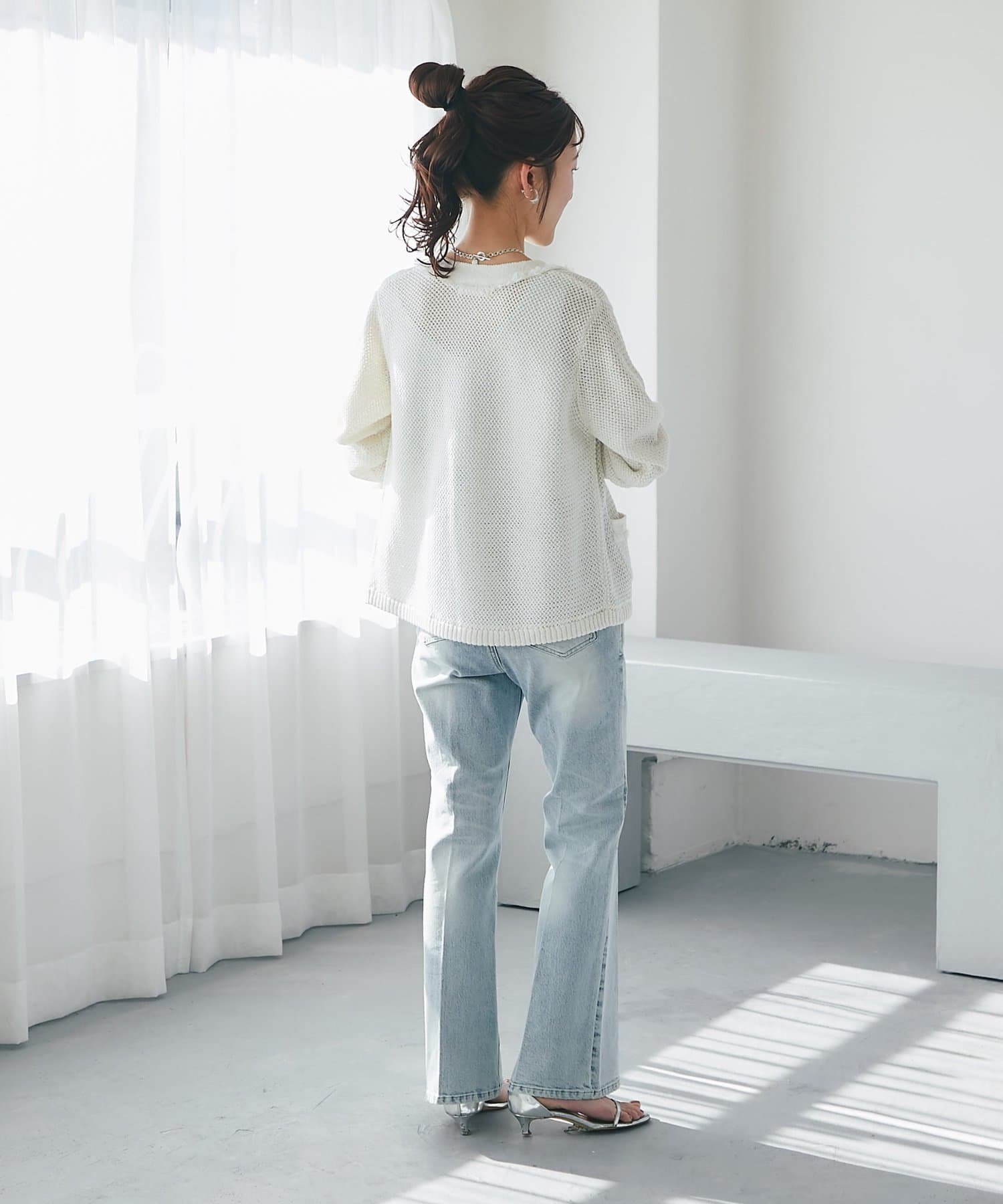 軽やかな透け感と凹凸のある編地が、女性らしく上品な表情を演出します。