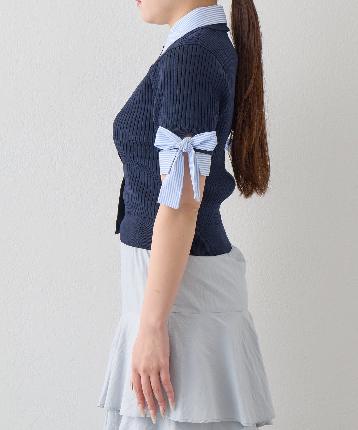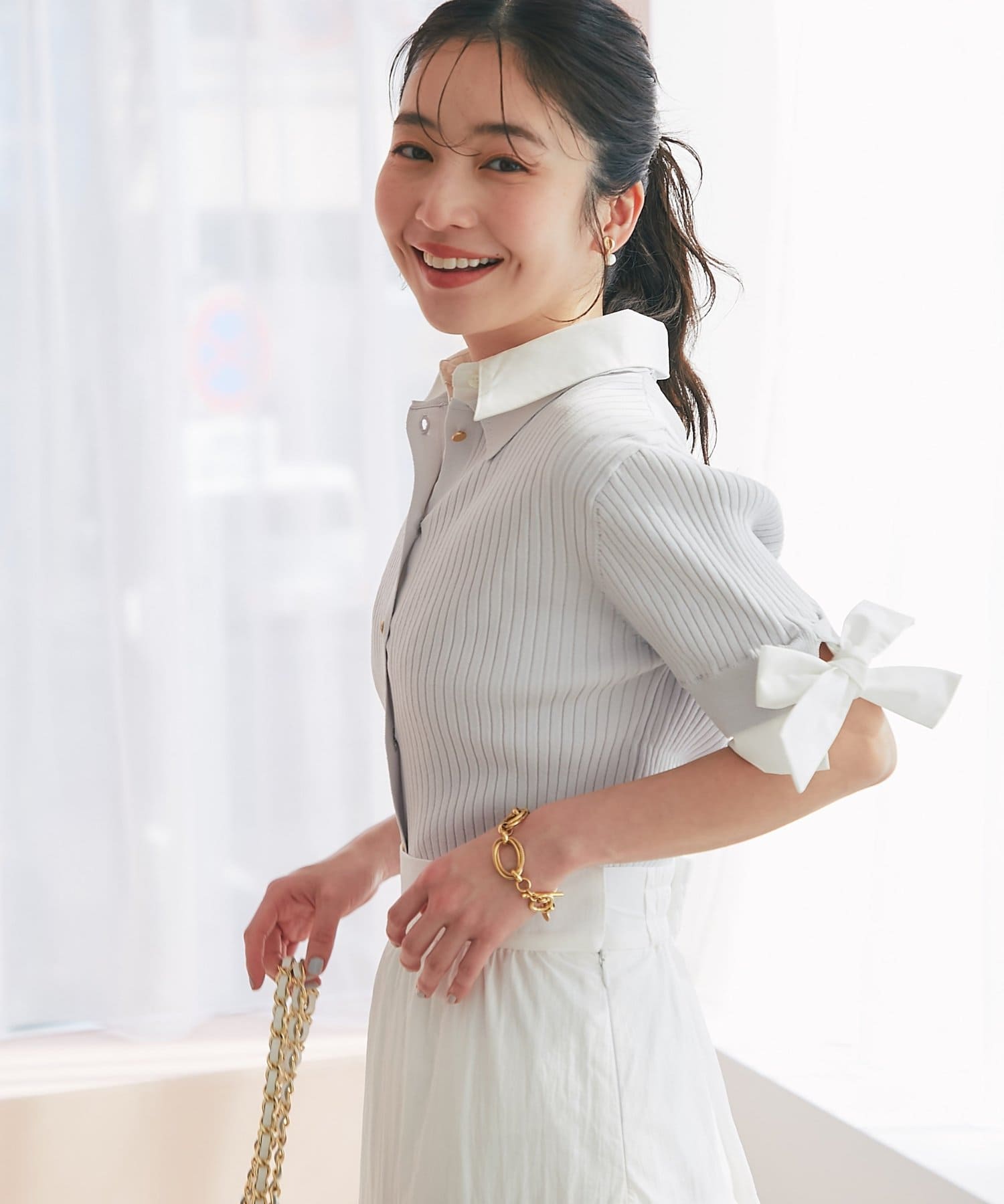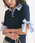 リボンディテールが映える、機能性も抜群の旬顔ニットカーデ