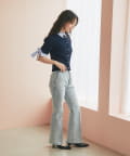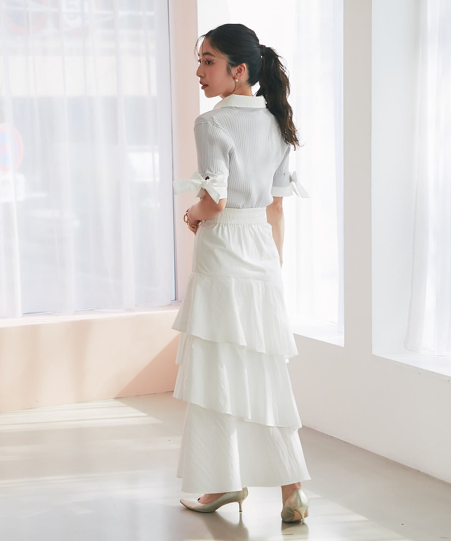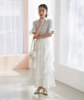 ふんわりとしたフレアスカートを合わせたフェミニンスタイルはもちろん、