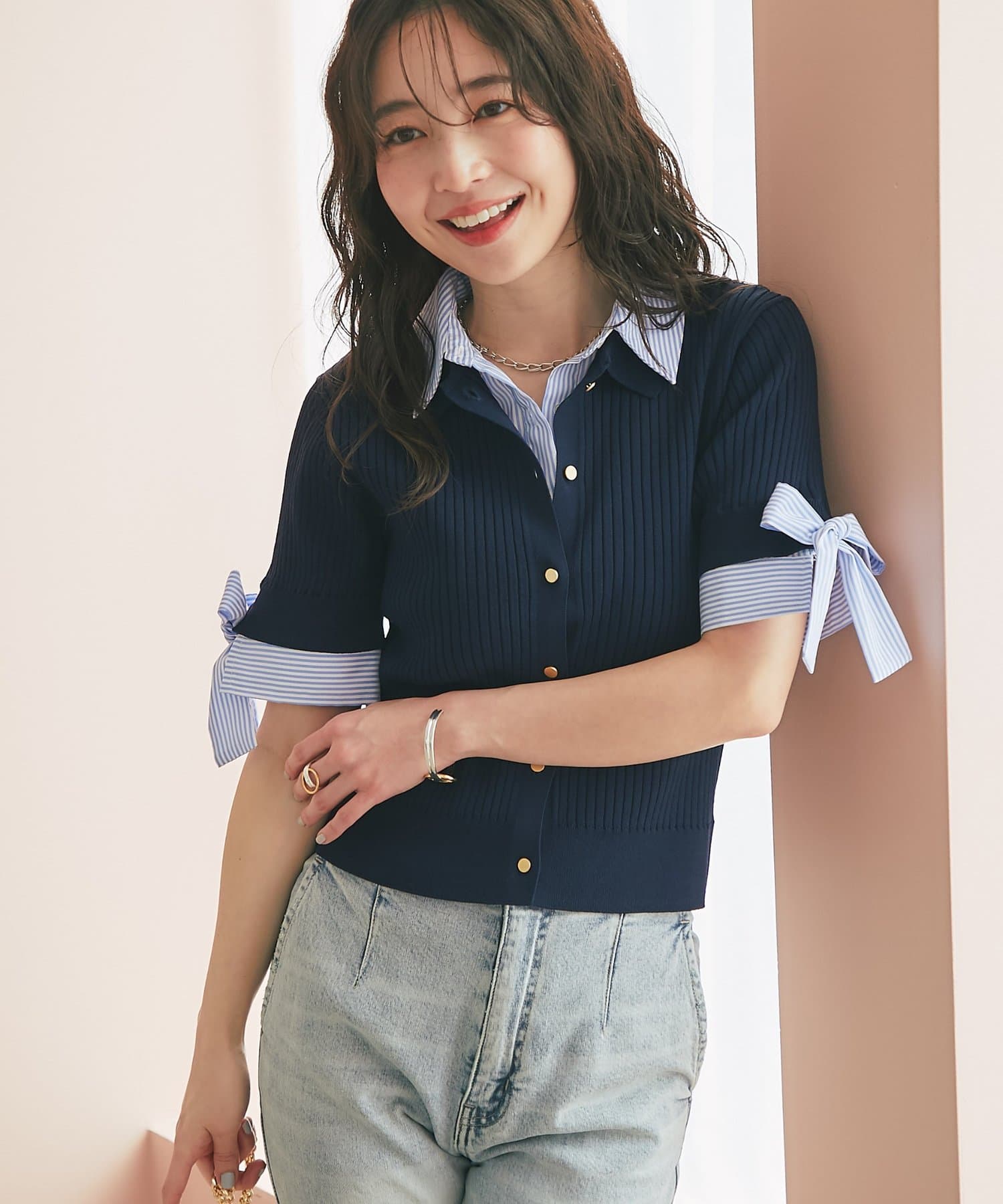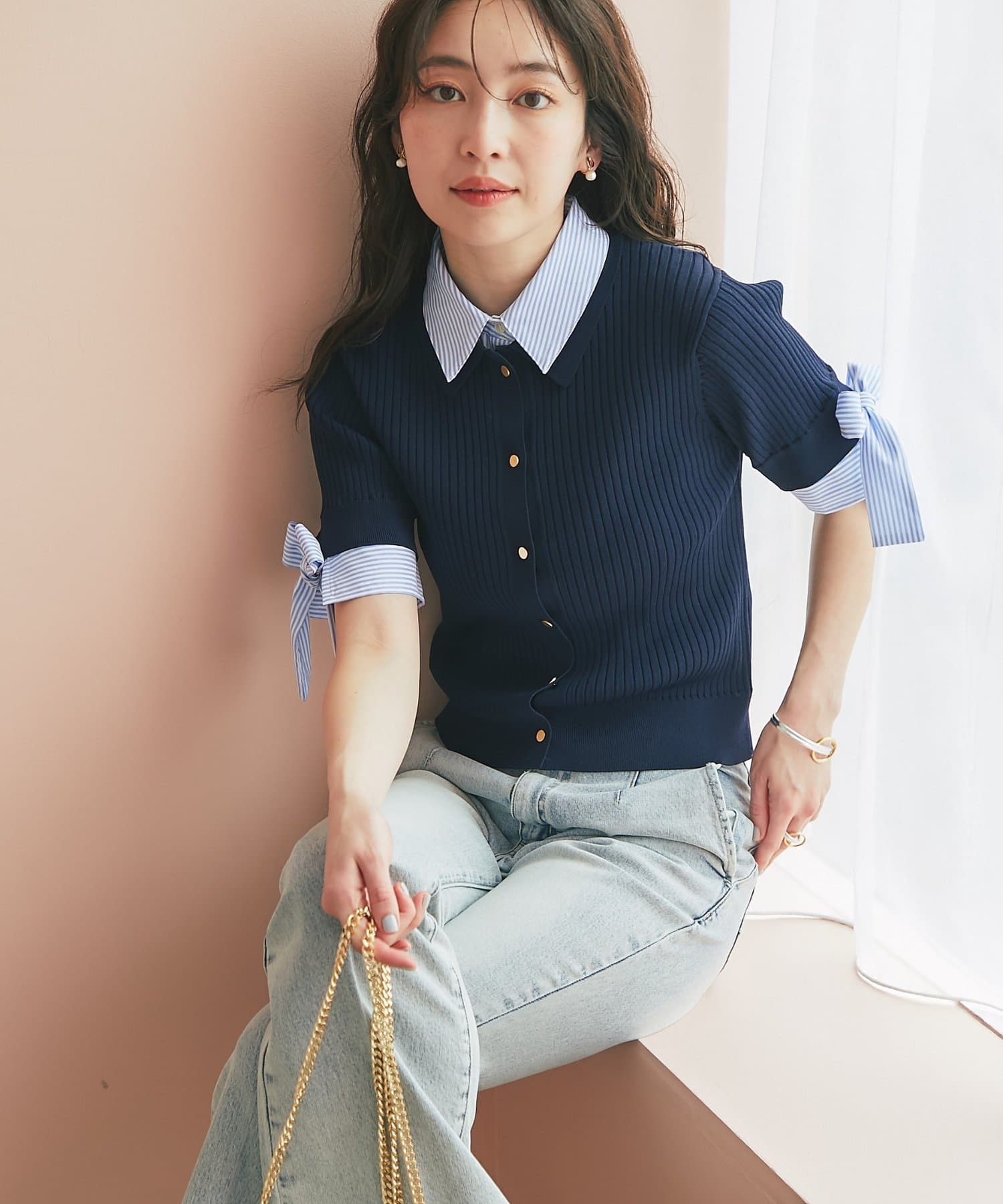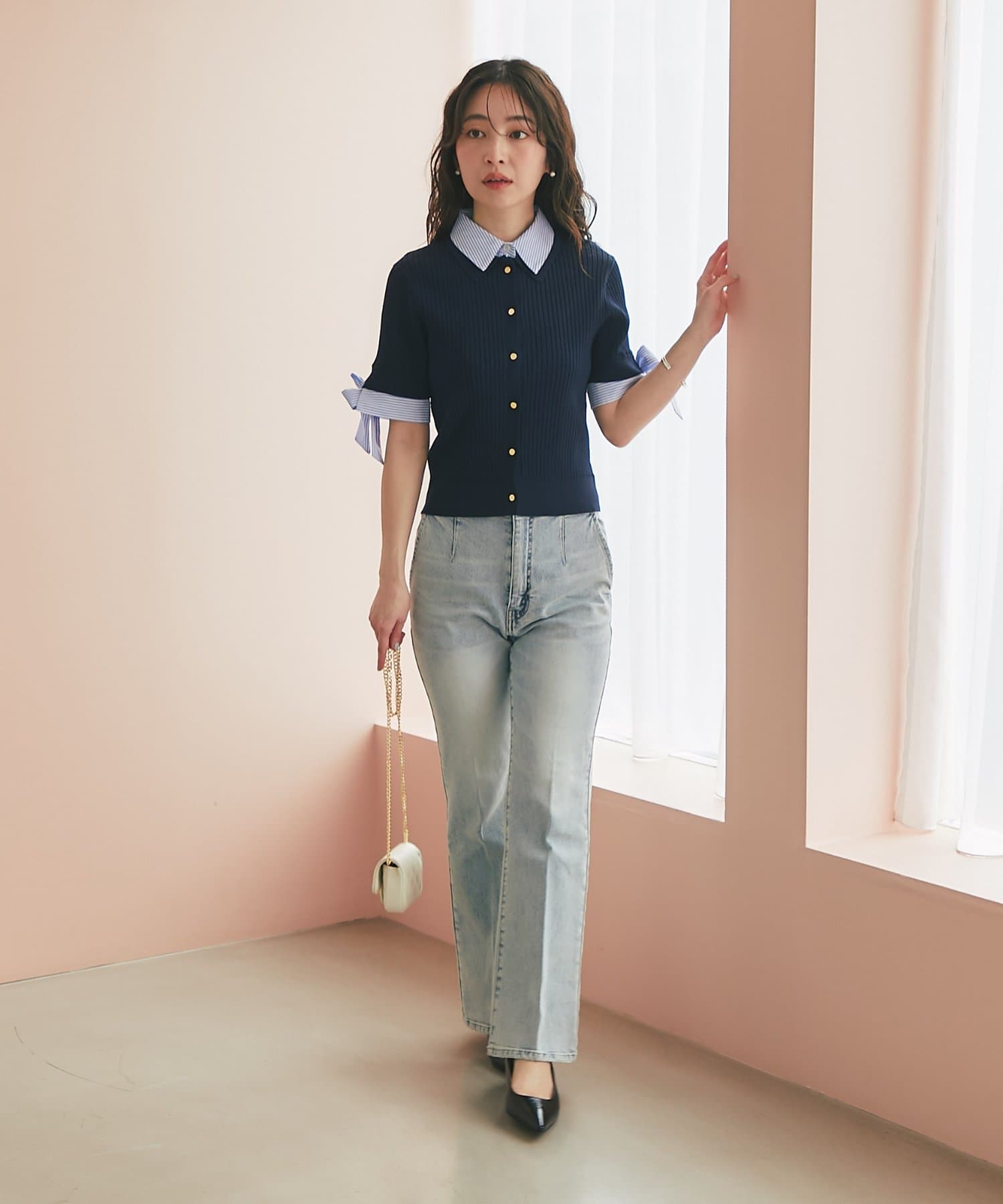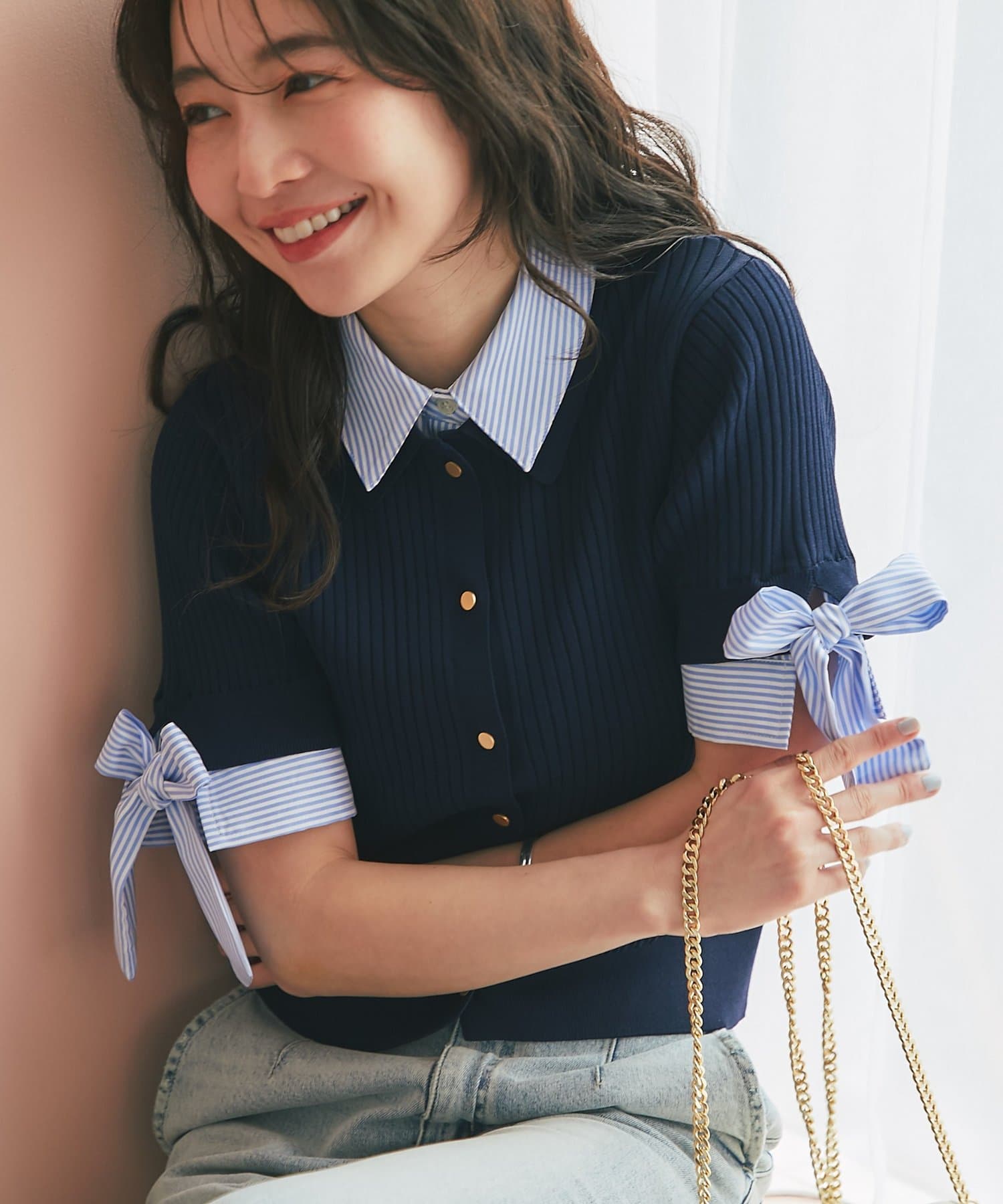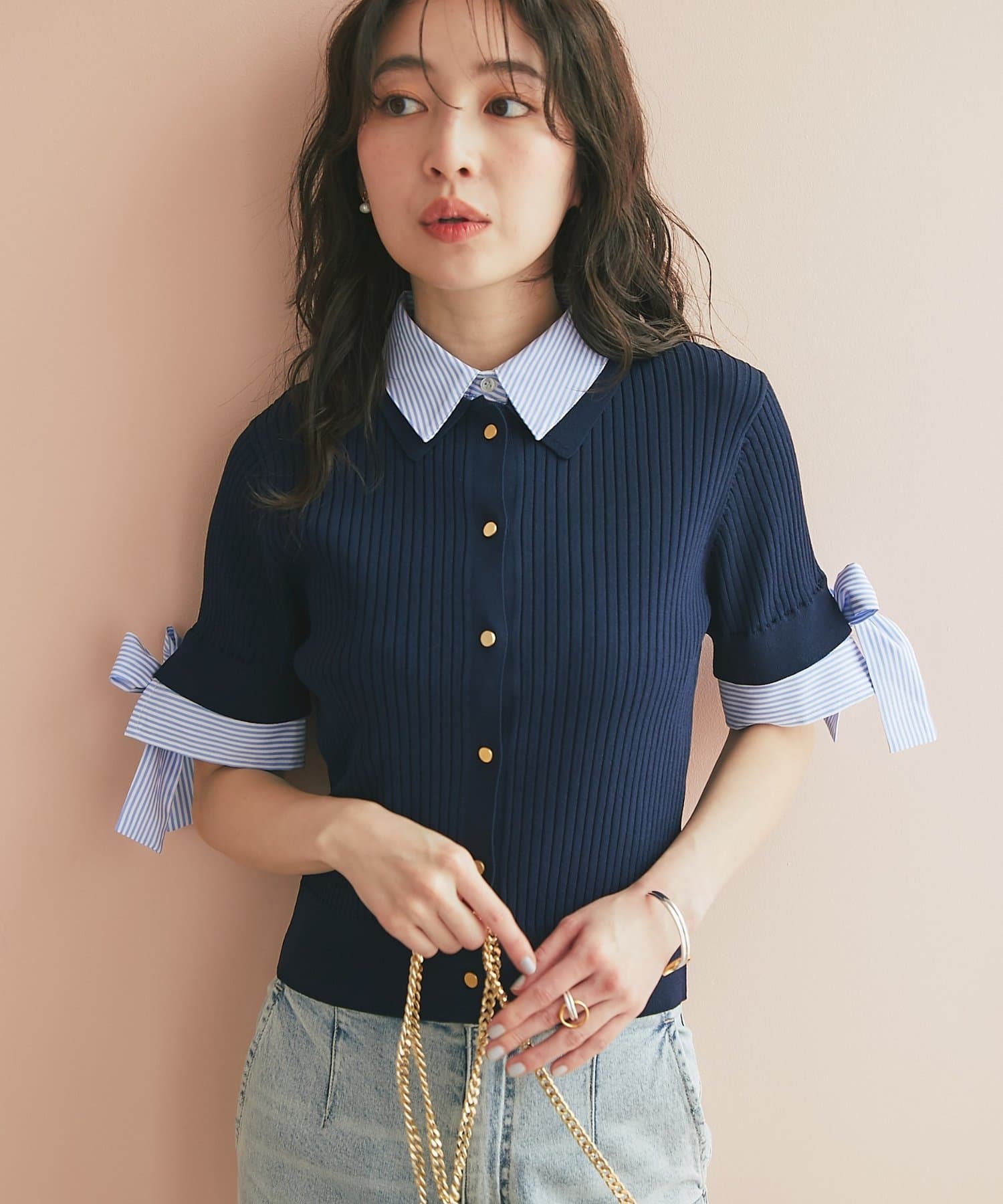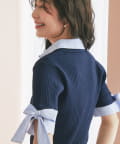 ゴールドボタンと袖のリボンディテールがさりげないアクセントに。