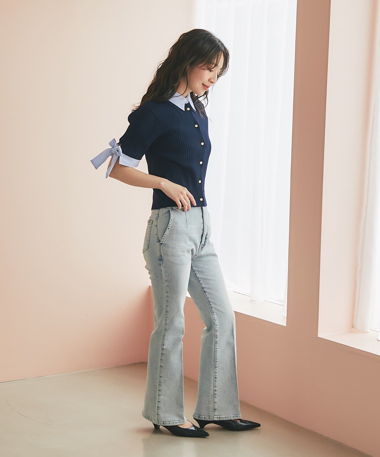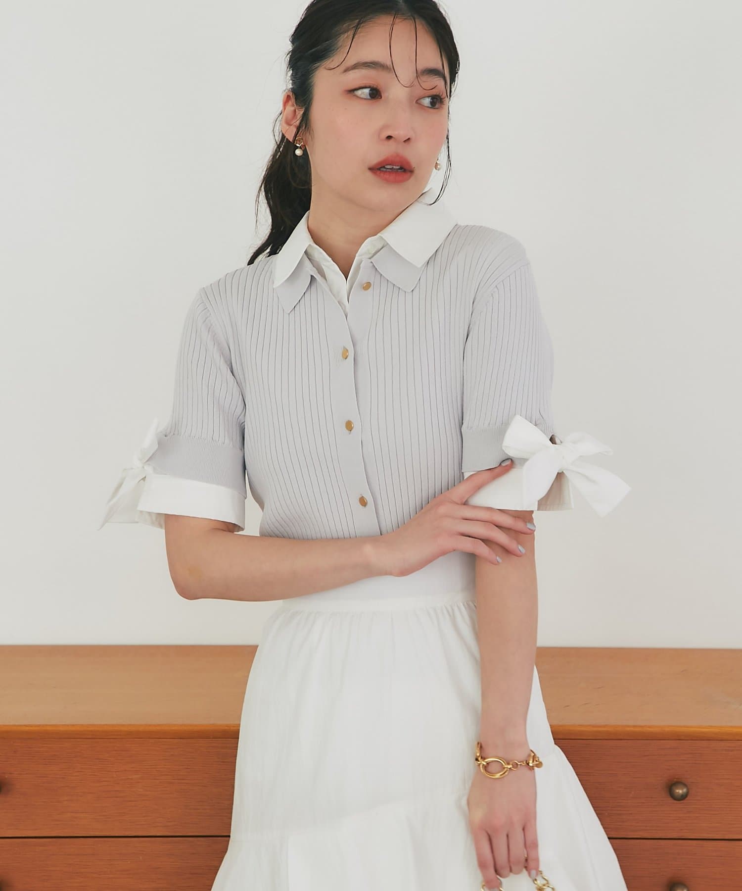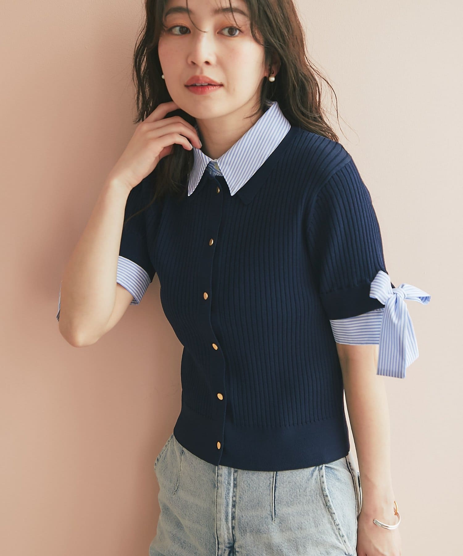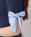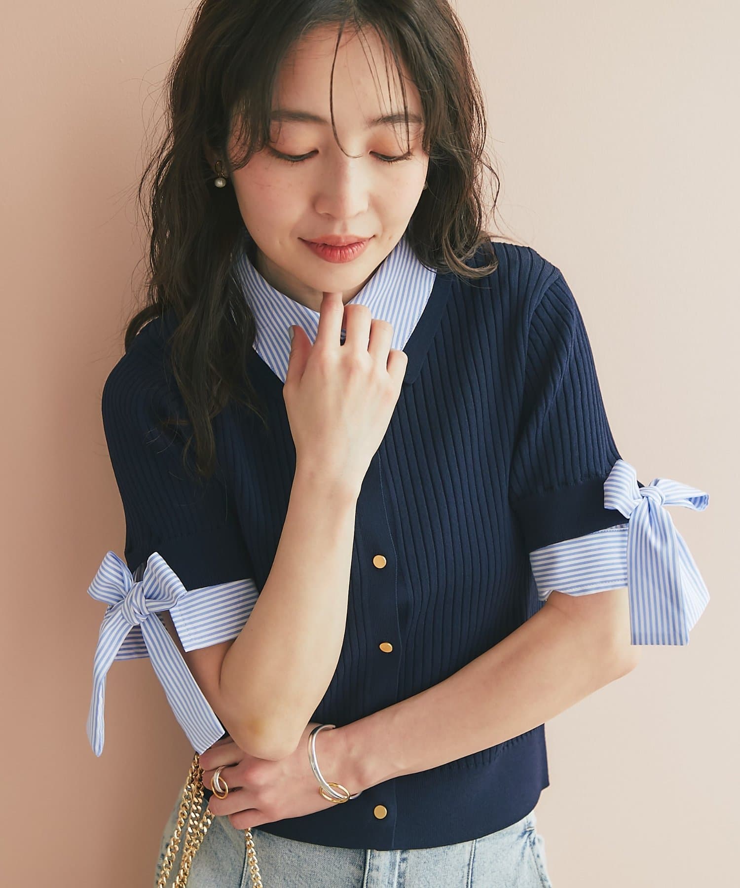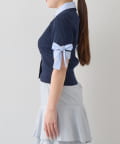 ゴールドボタンと袖のリボンディテールがさりげないアクセントに。