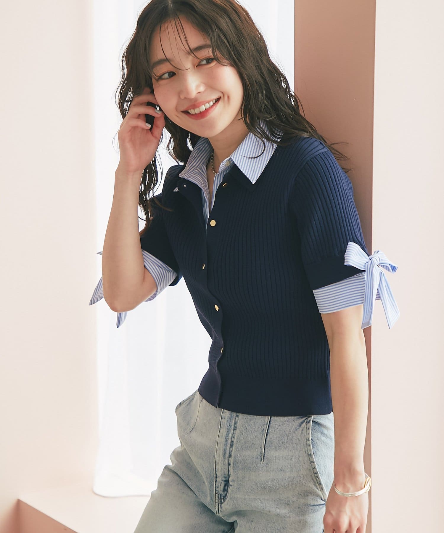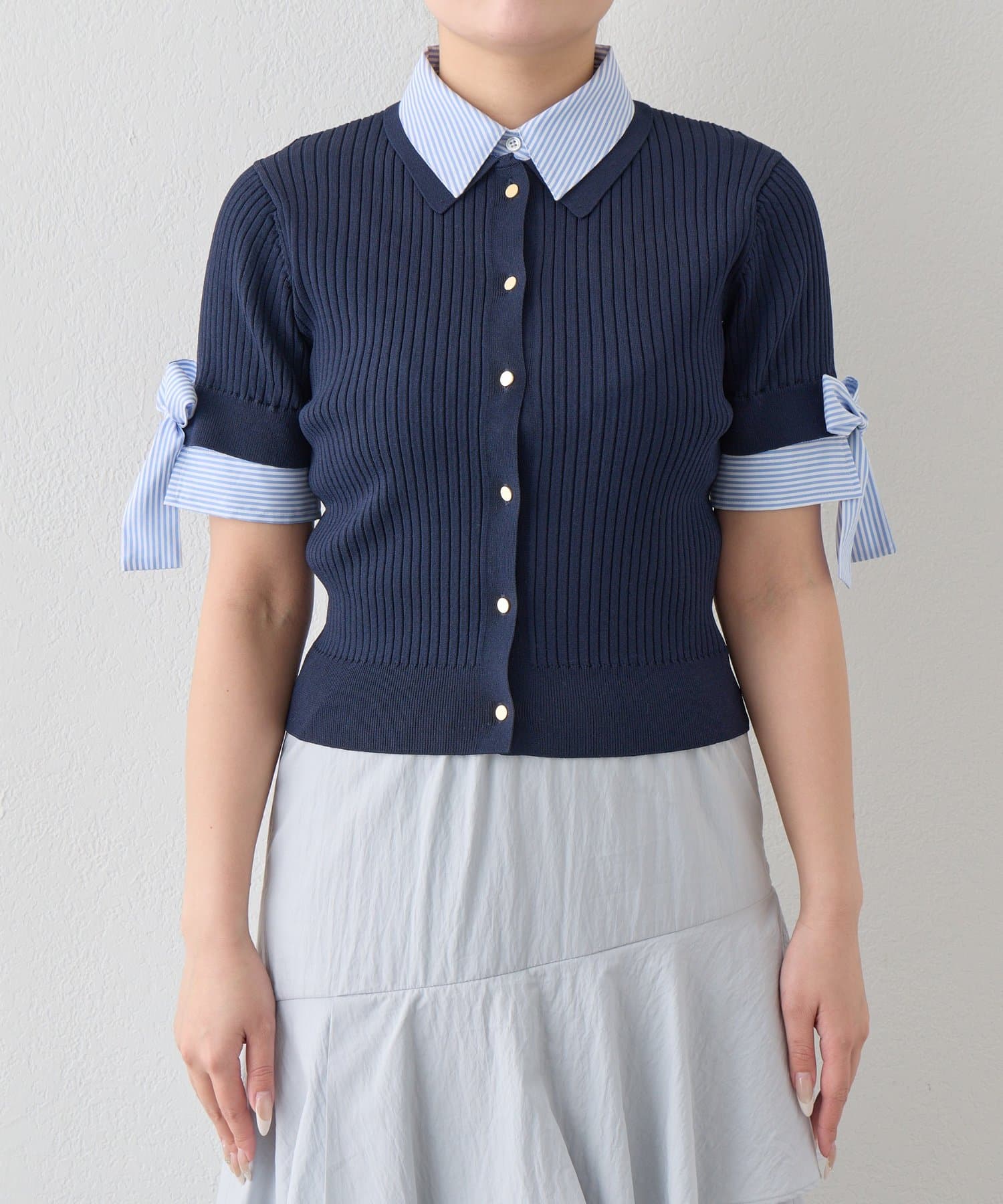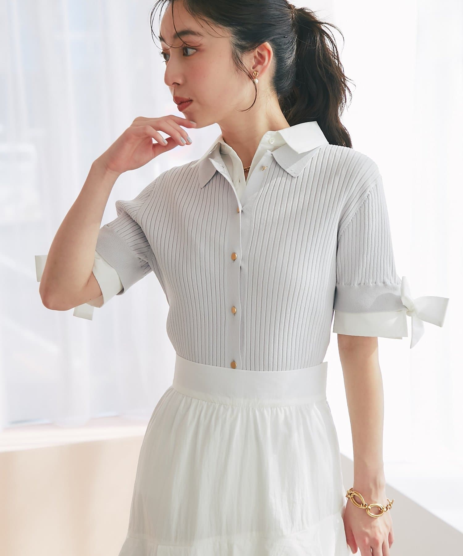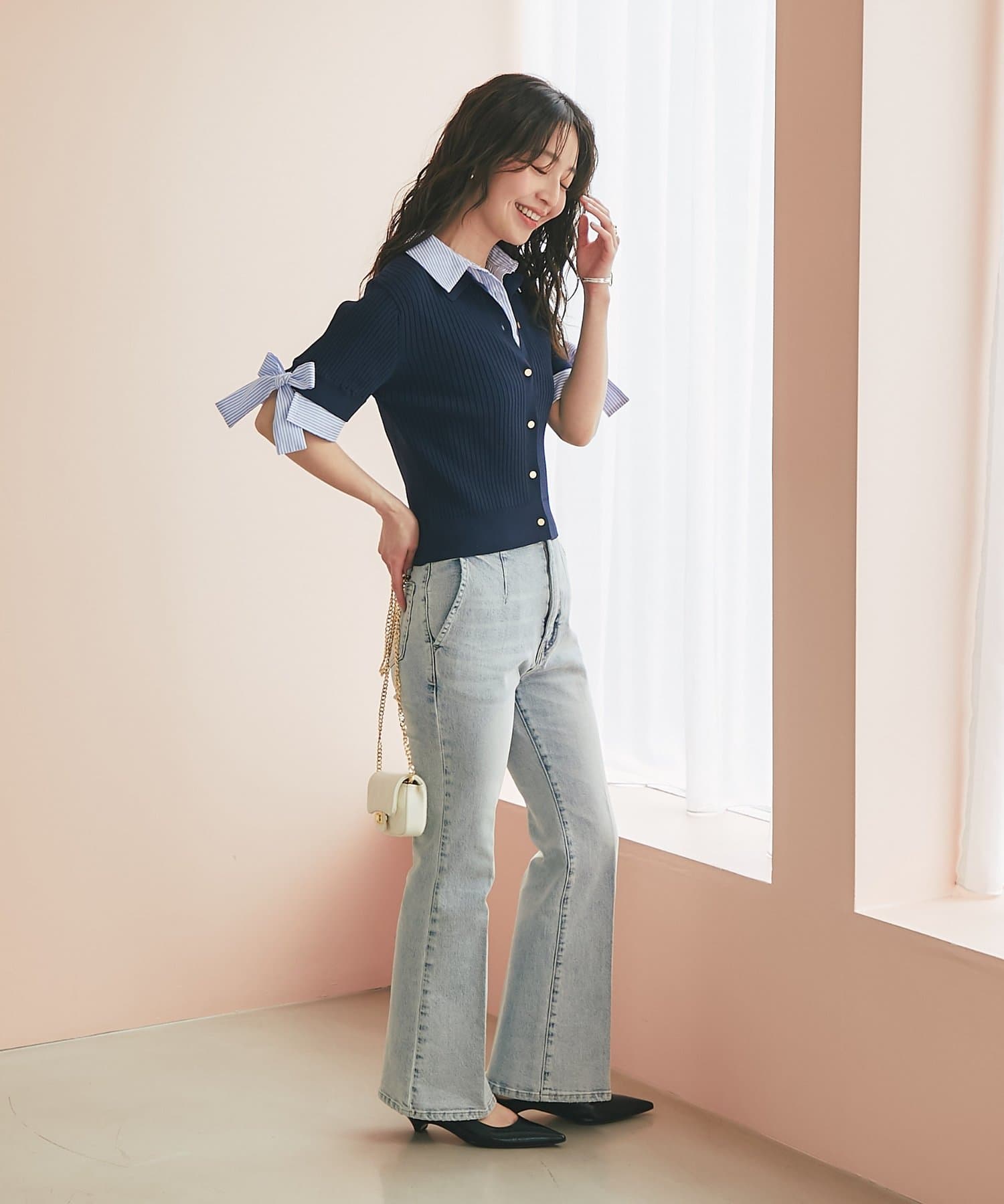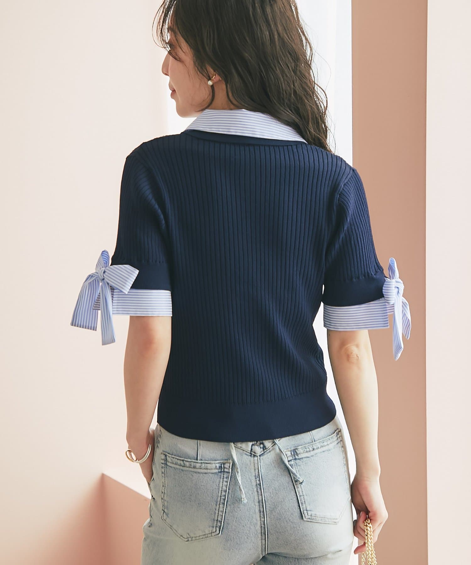 ゴールドボタンと袖のリボンディテールがさりげないアクセントに。