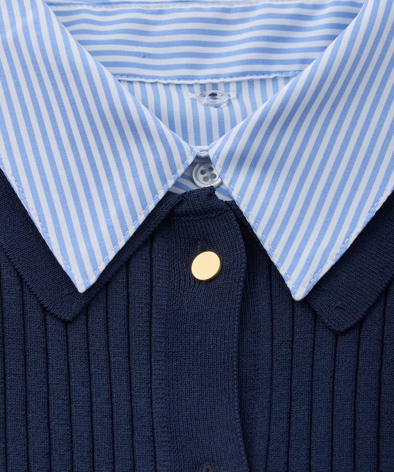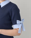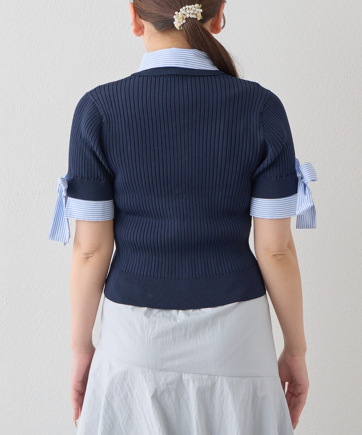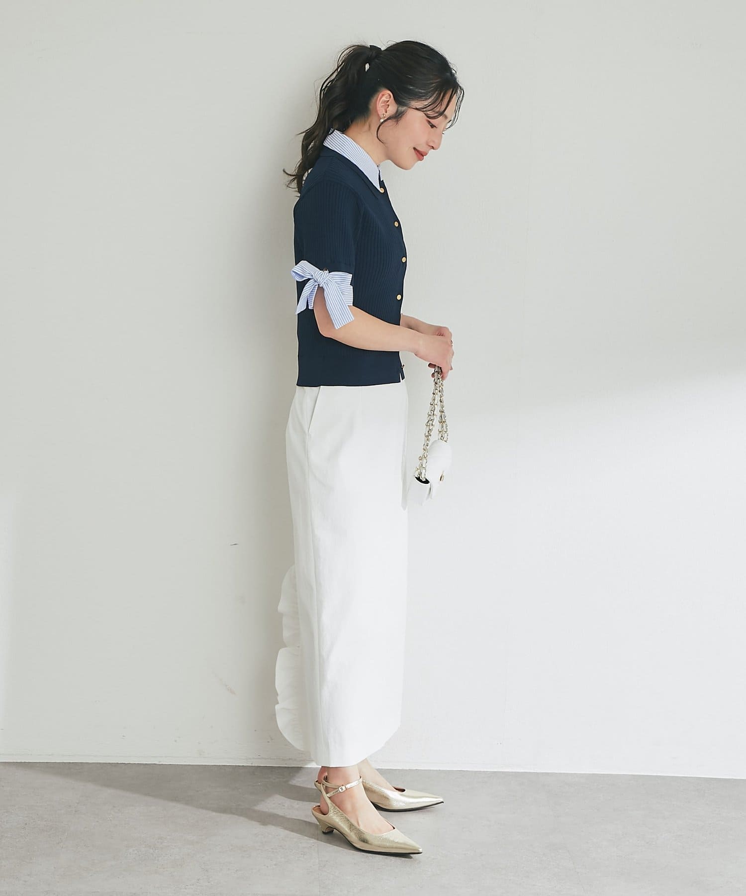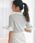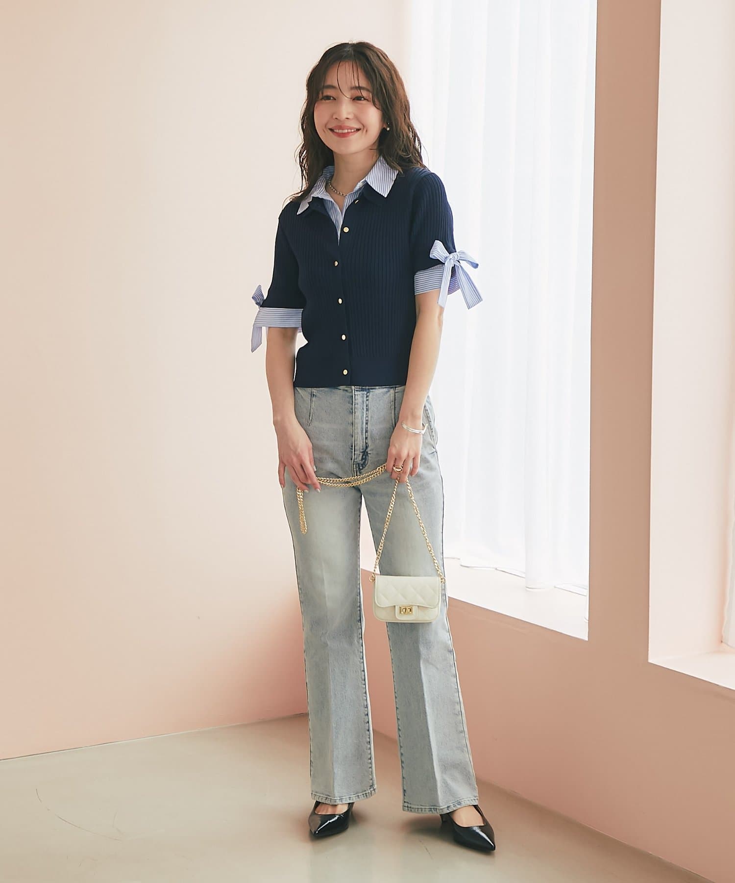 ゴールドボタンと袖のリボンディテールがさりげないアクセントに。