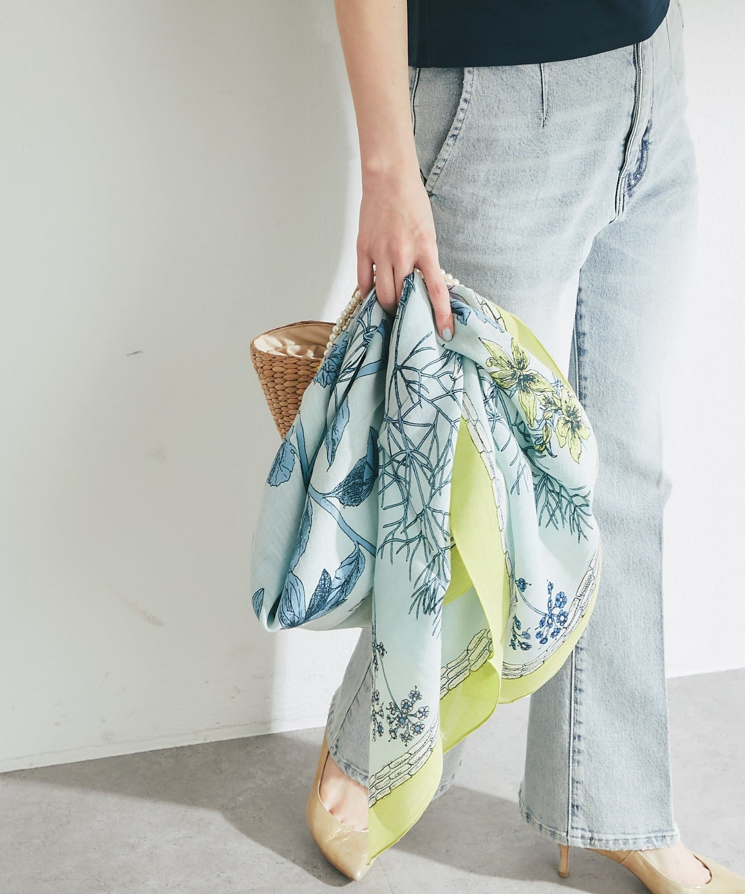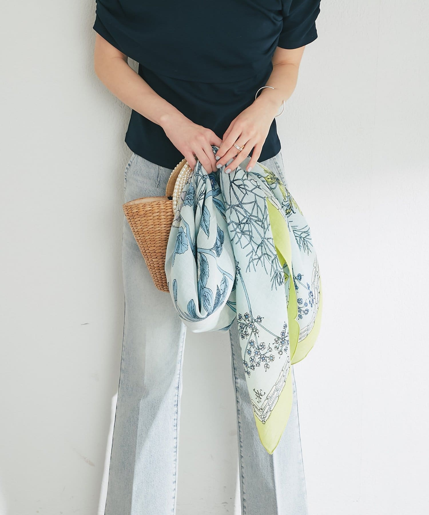 首に巻いたり、肌寒い時は羽織るなど様々な使い方ができるので、一枚は持っていたいアイテム。