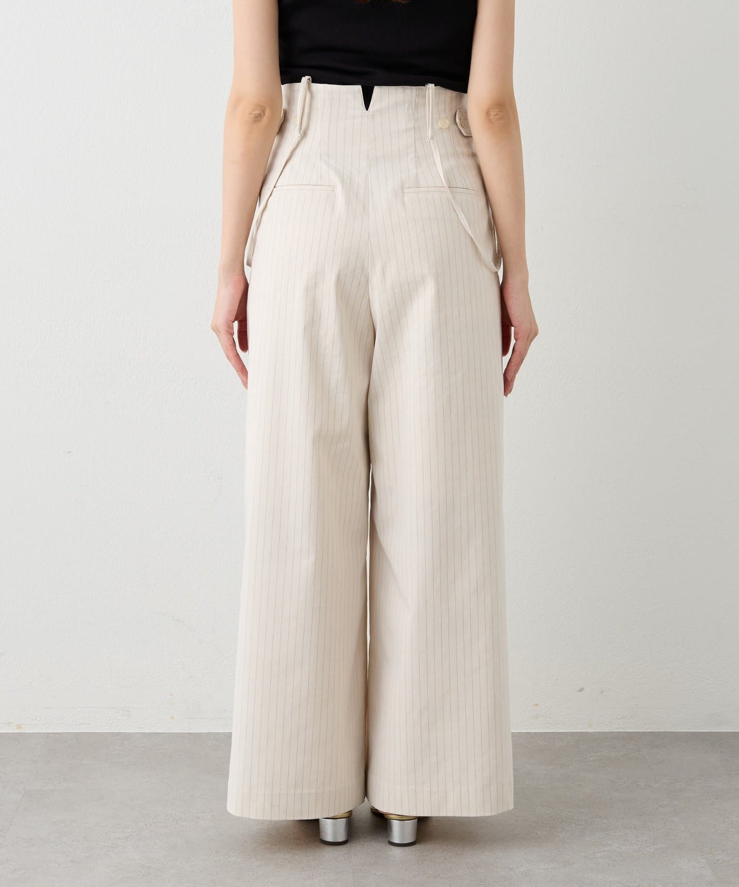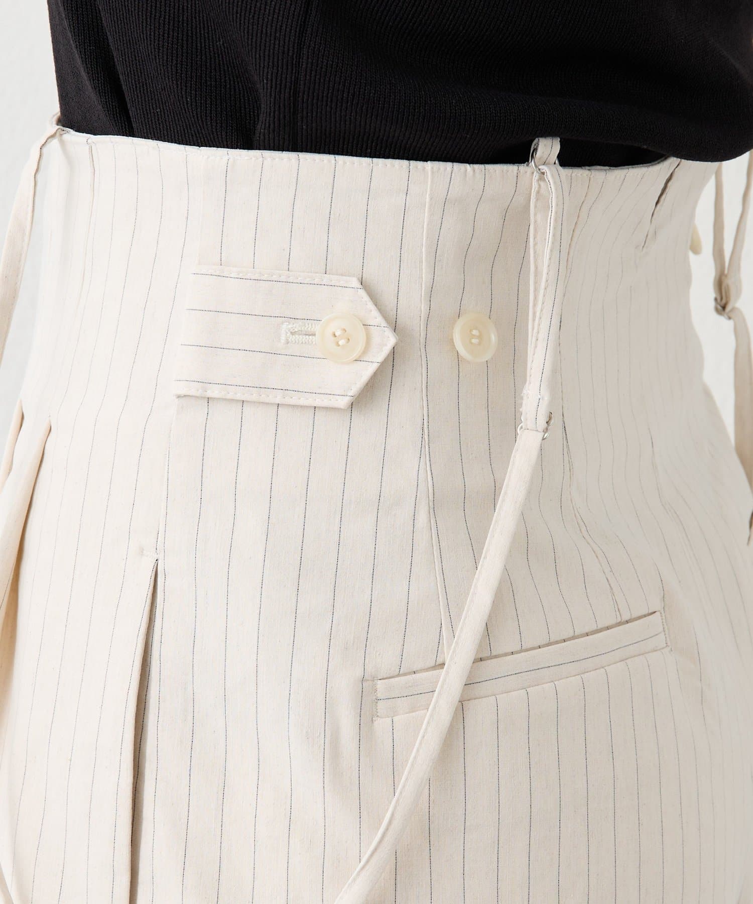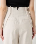 サイドの釦でウエスト寸の調整ができるのでストラップをおろした着こなしも楽しめます。