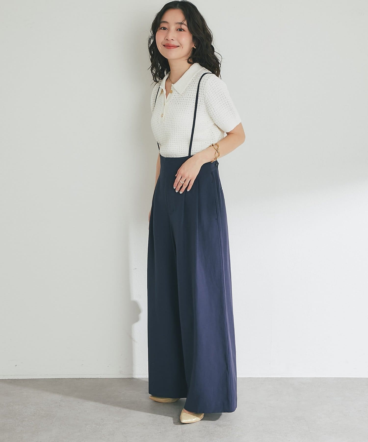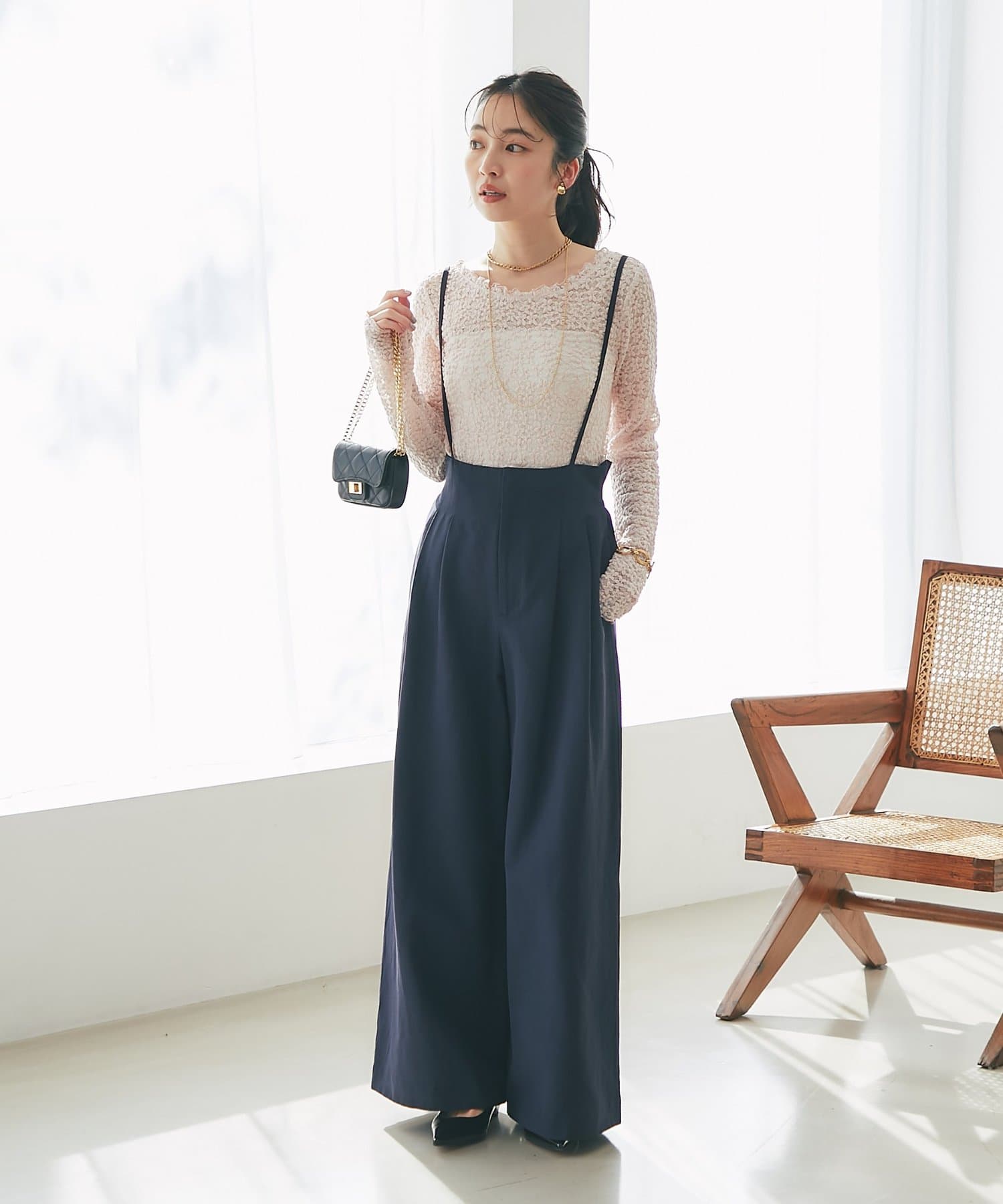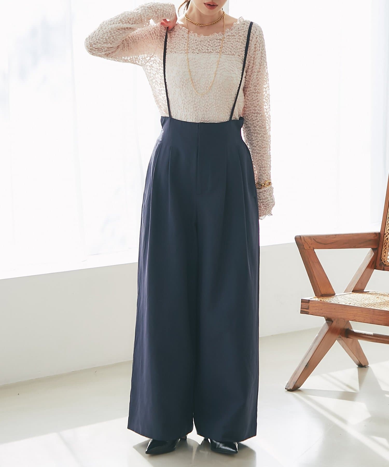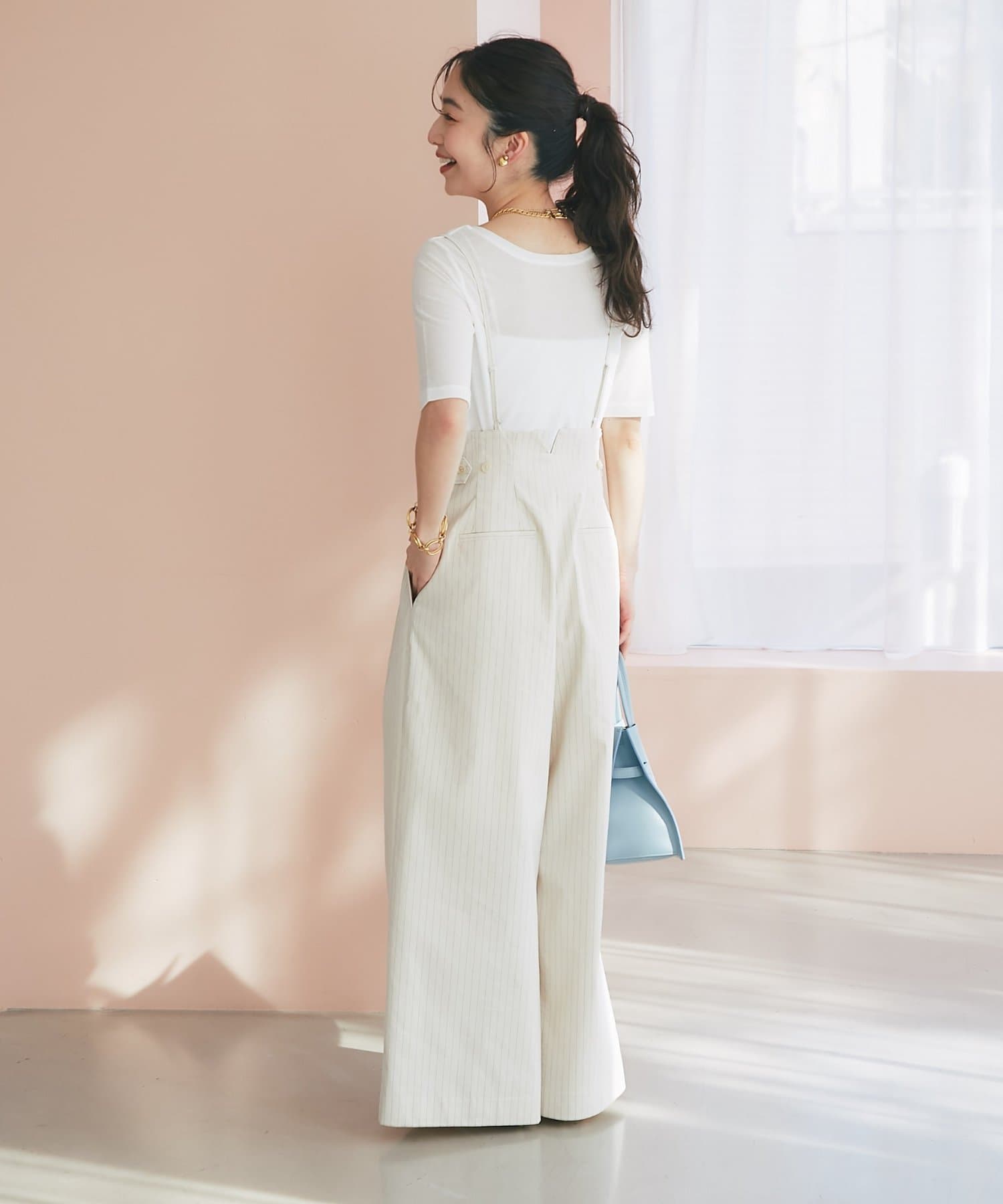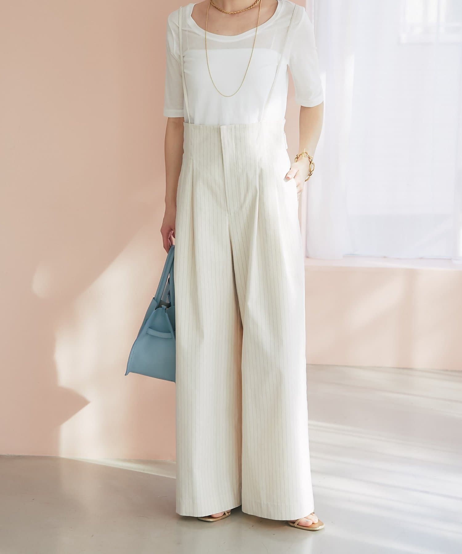 細いストラップが大人のキレイめカジュアルスタイルを作ってくれるバギーパンツ。