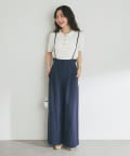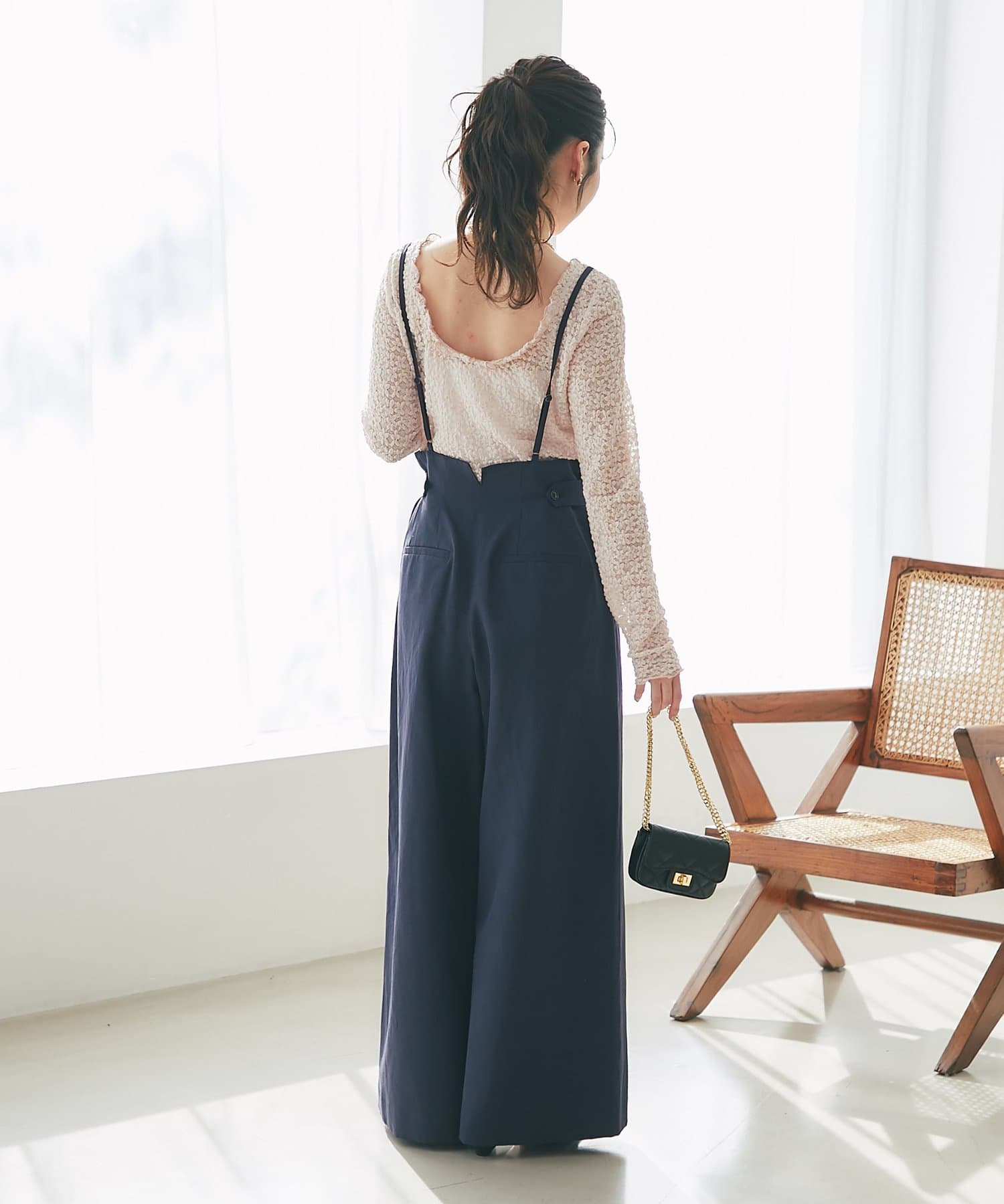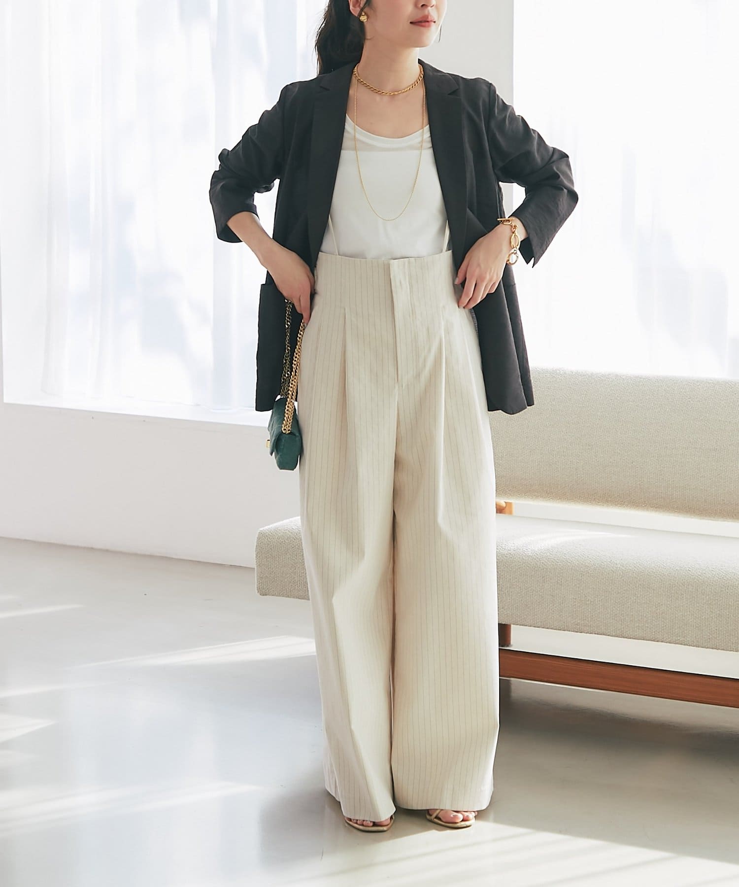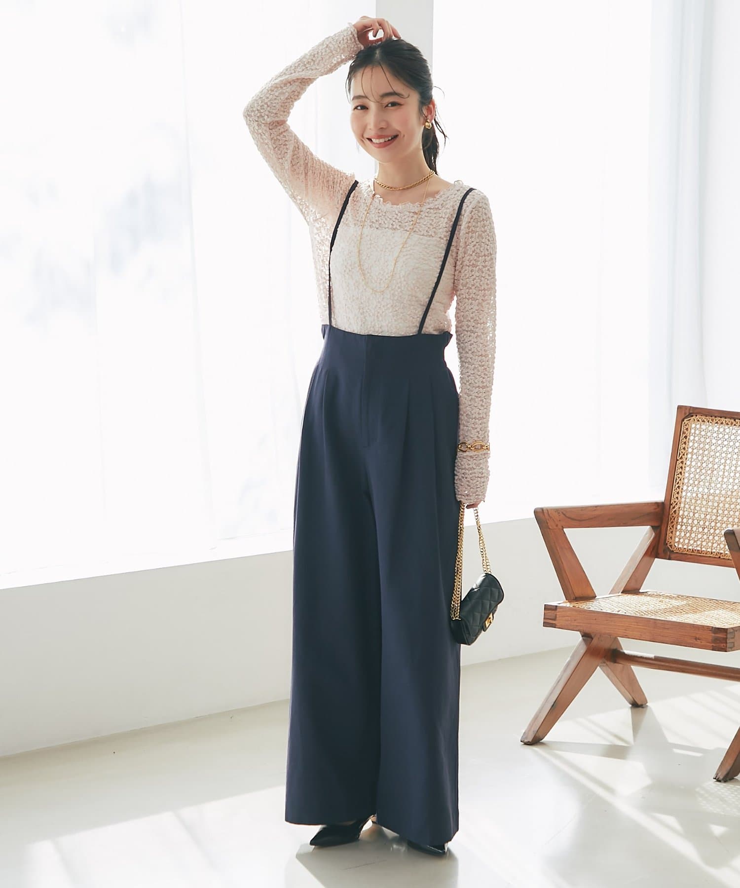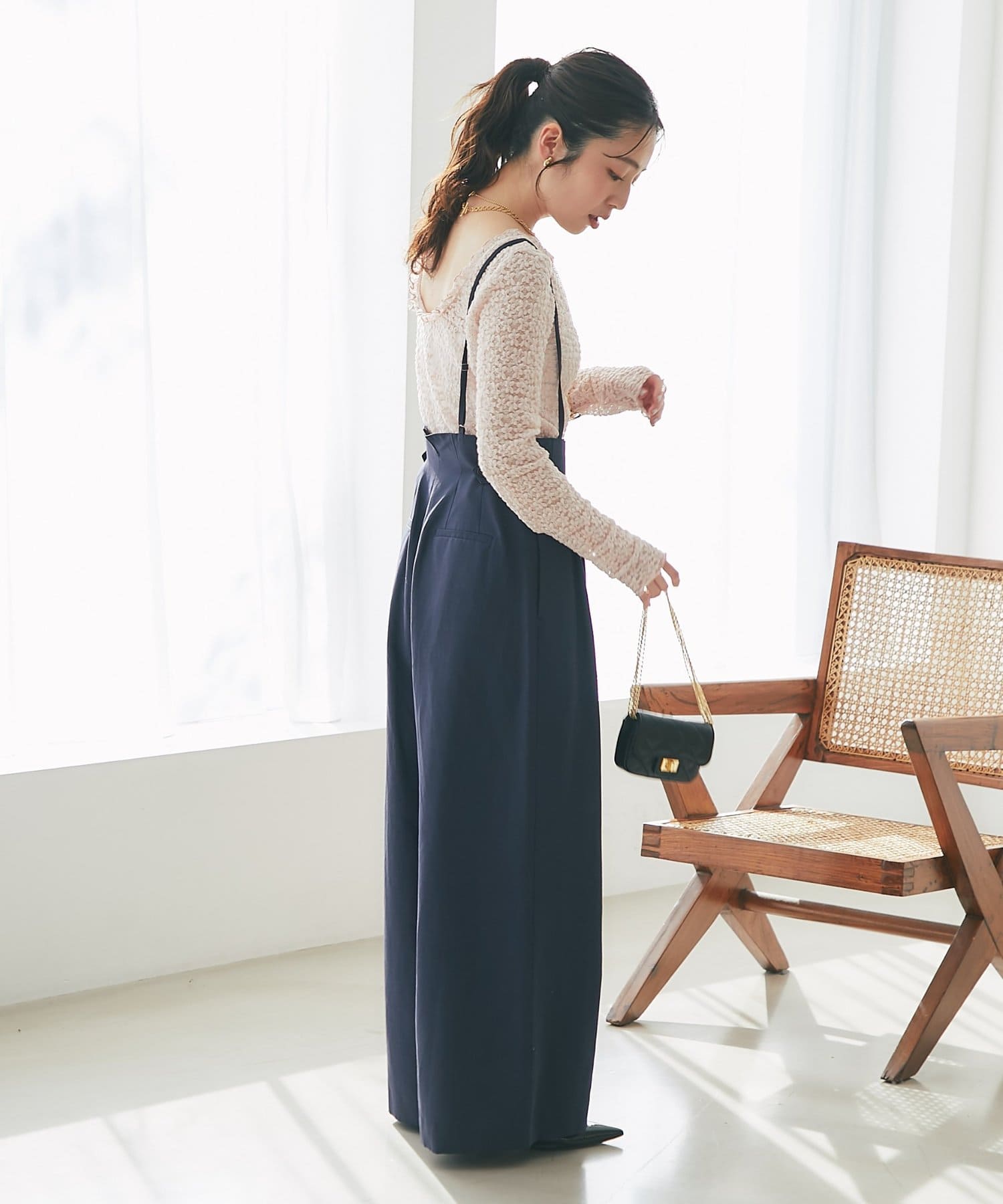 細いストラップが大人のキレイめカジュアルスタイルを作ってくれるバギーパンツ。