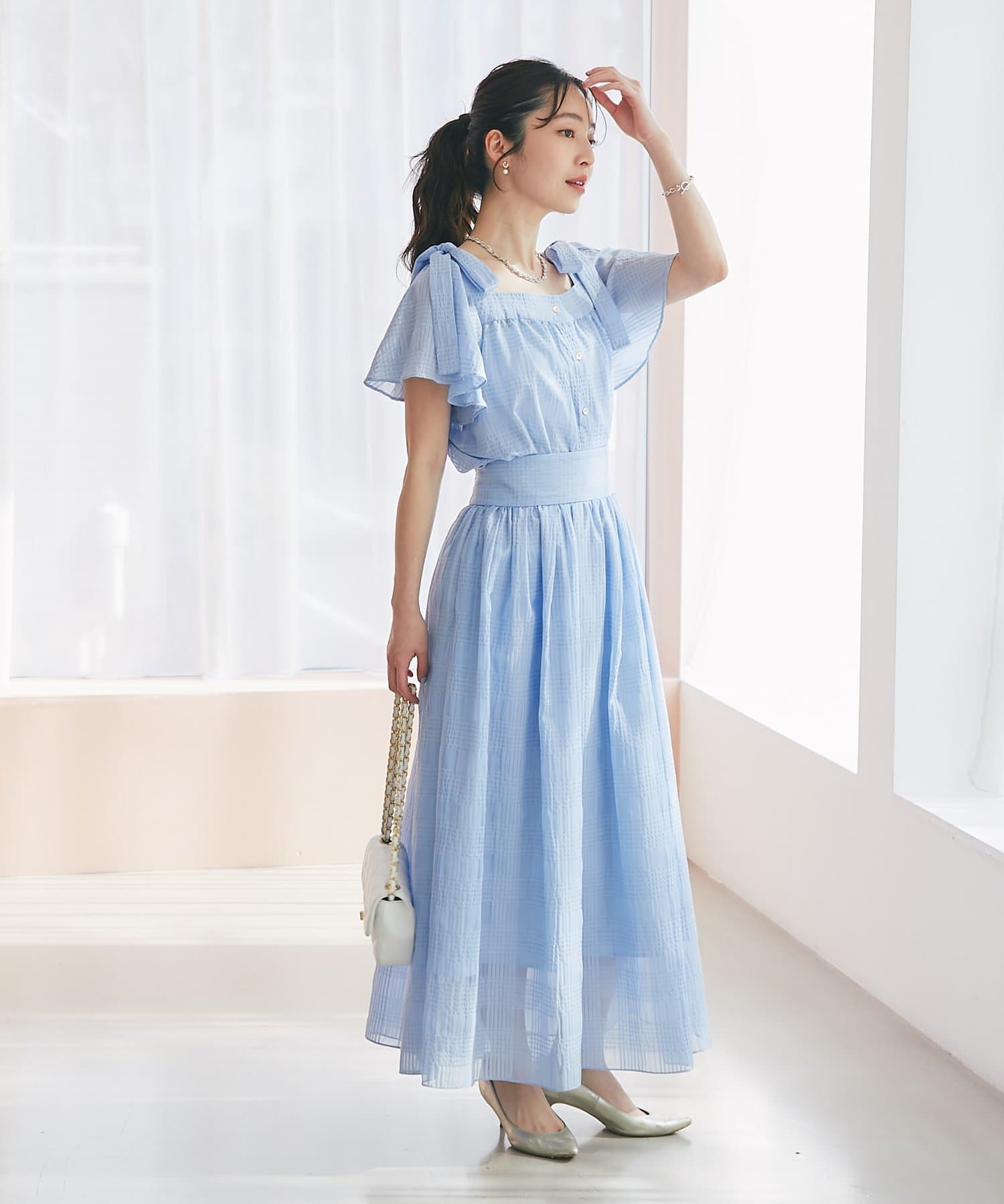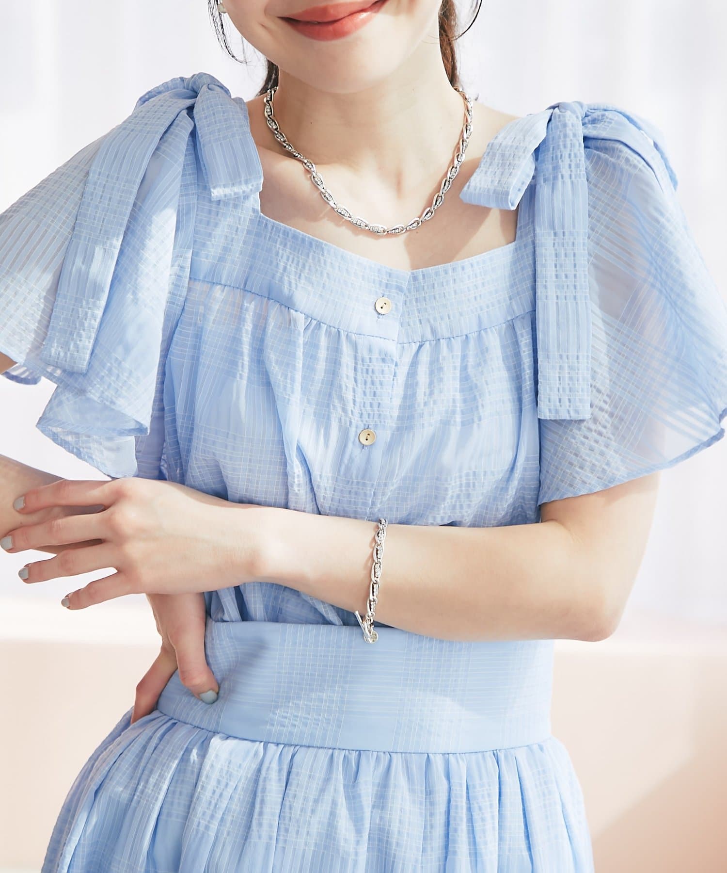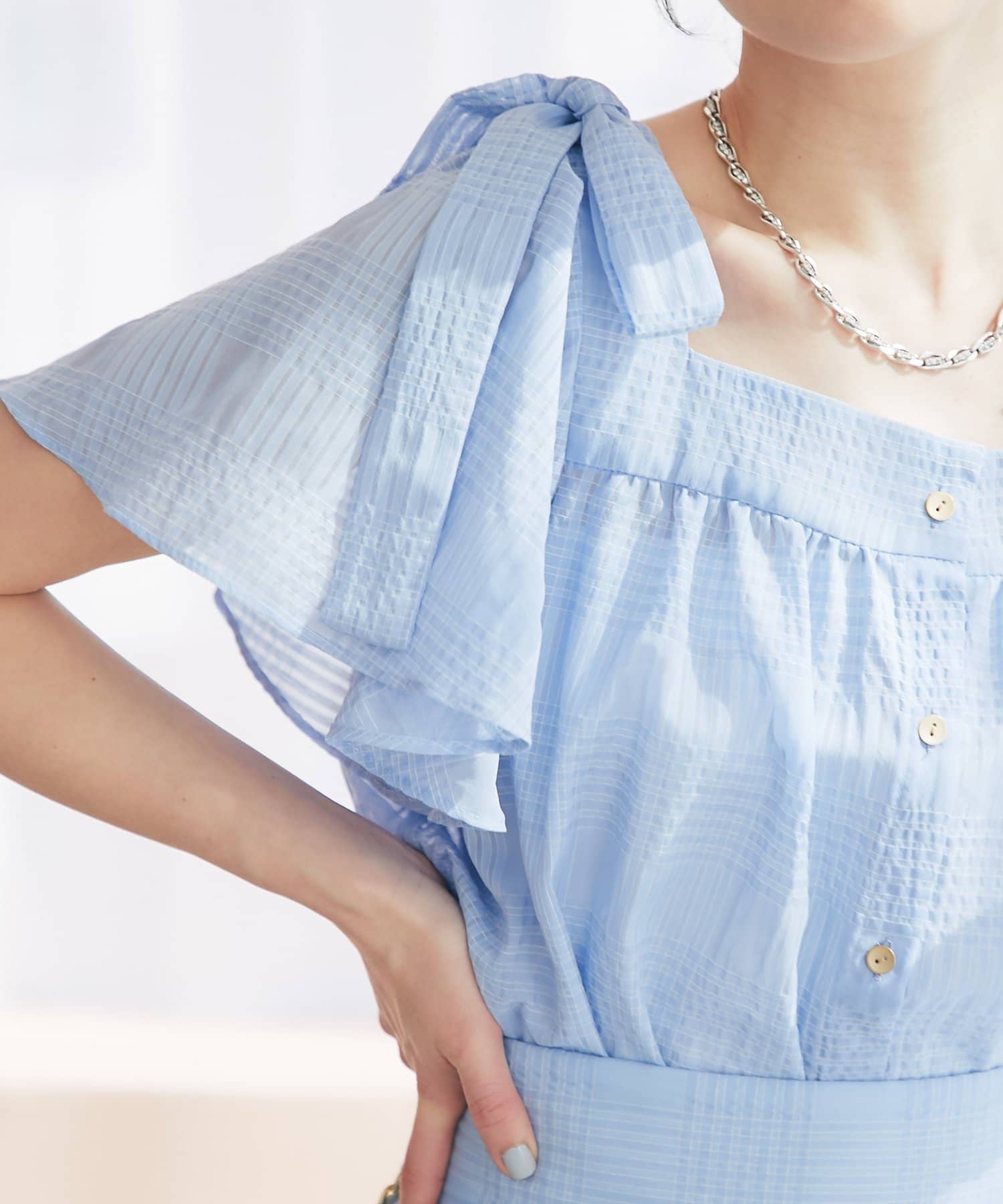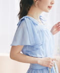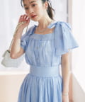 肩に乗った太めリボンと2枚重ねのフレアースリーブが、シンプルなデザインに華やかさをプラスします。