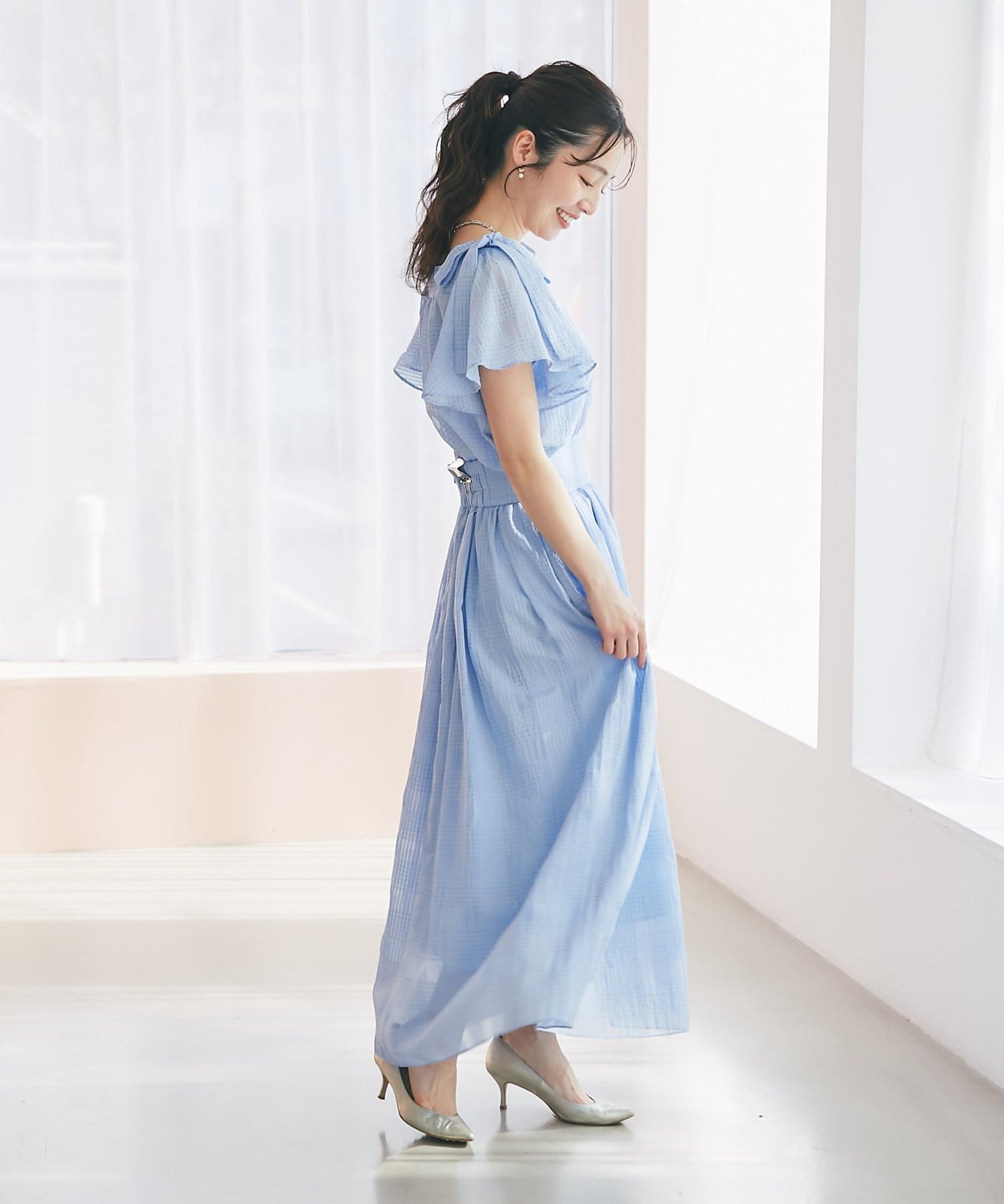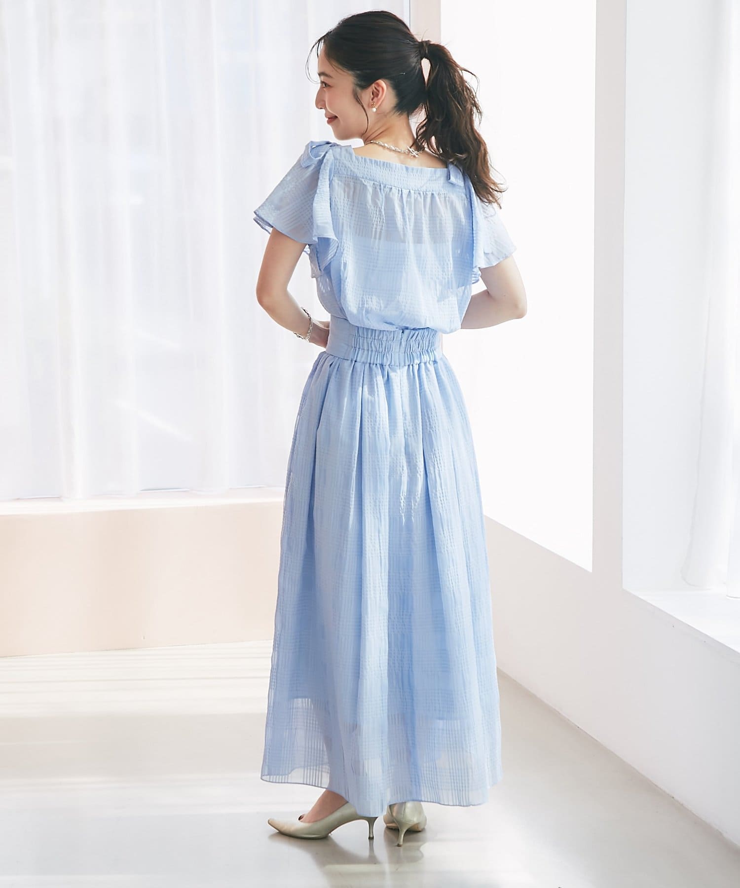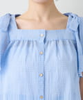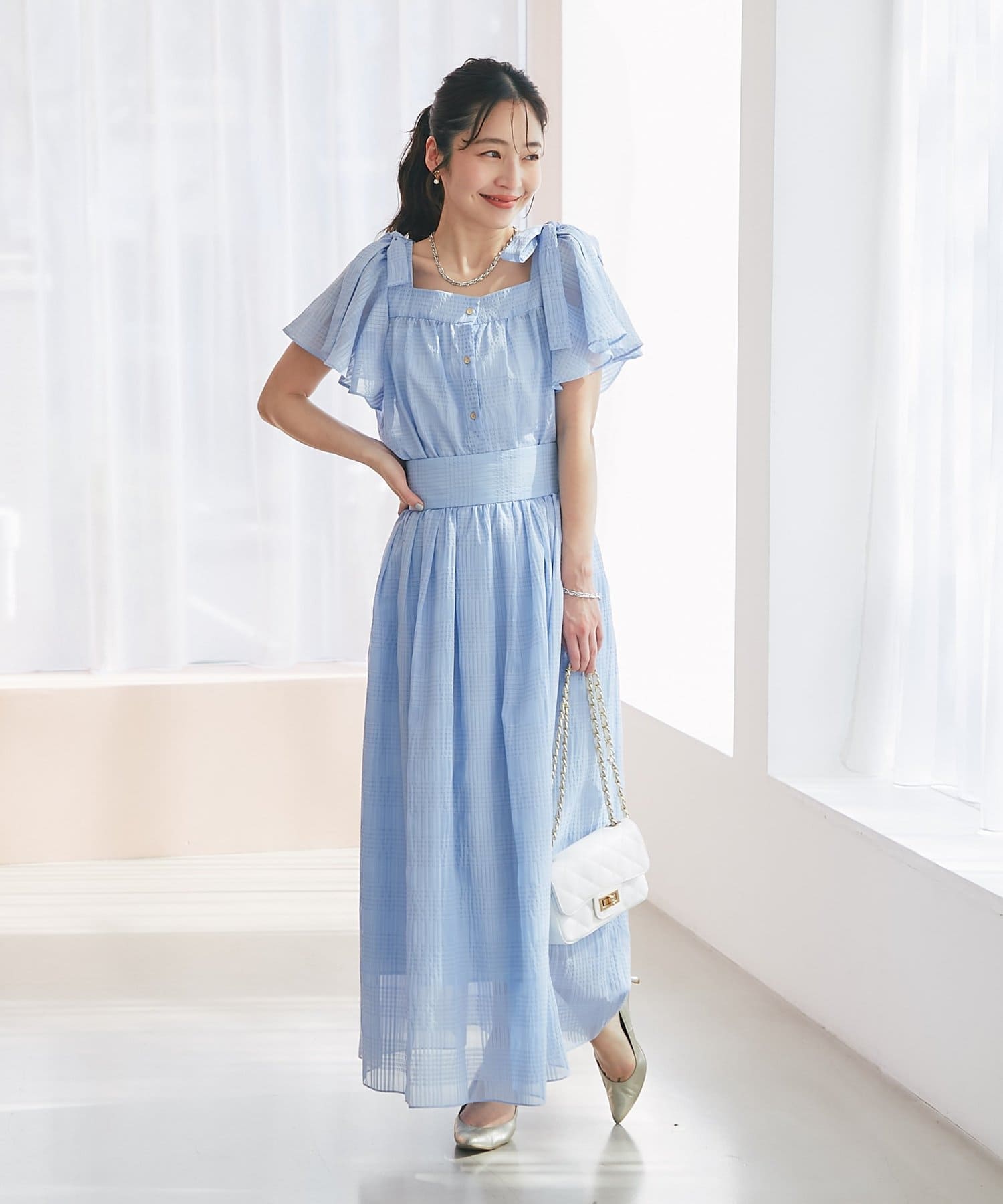 肩に乗った太めリボンと2枚重ねのフレアースリーブが、シンプルなデザインに華やかさをプラスします。