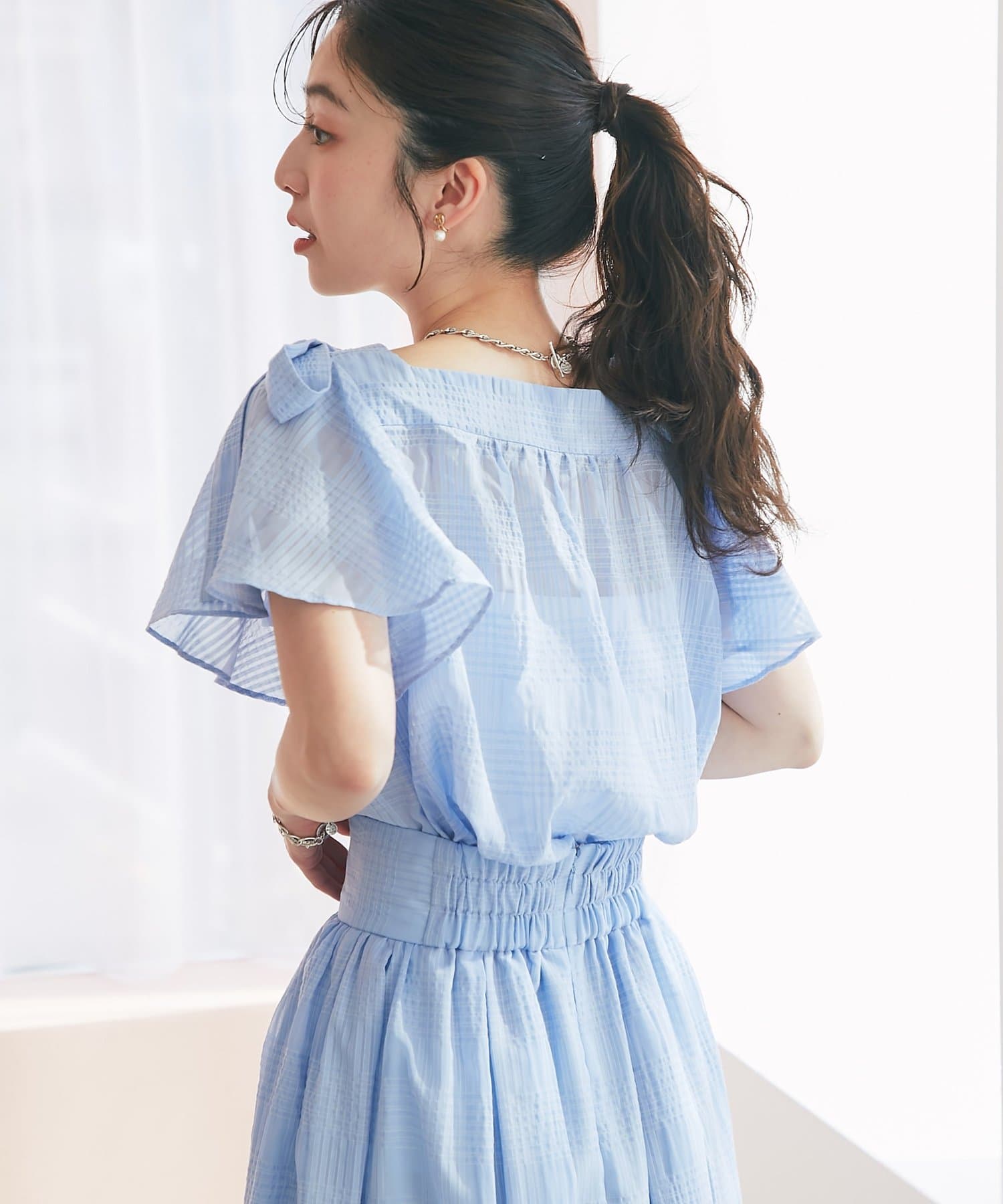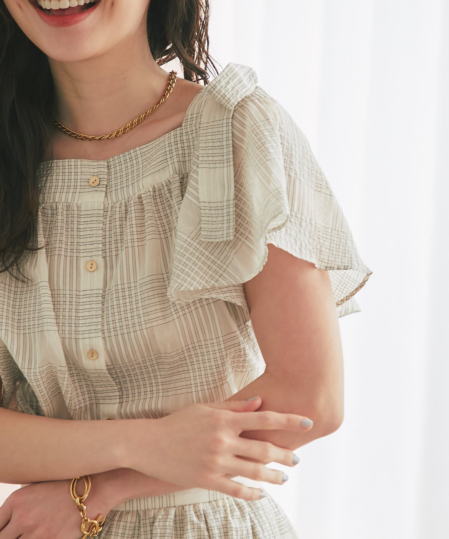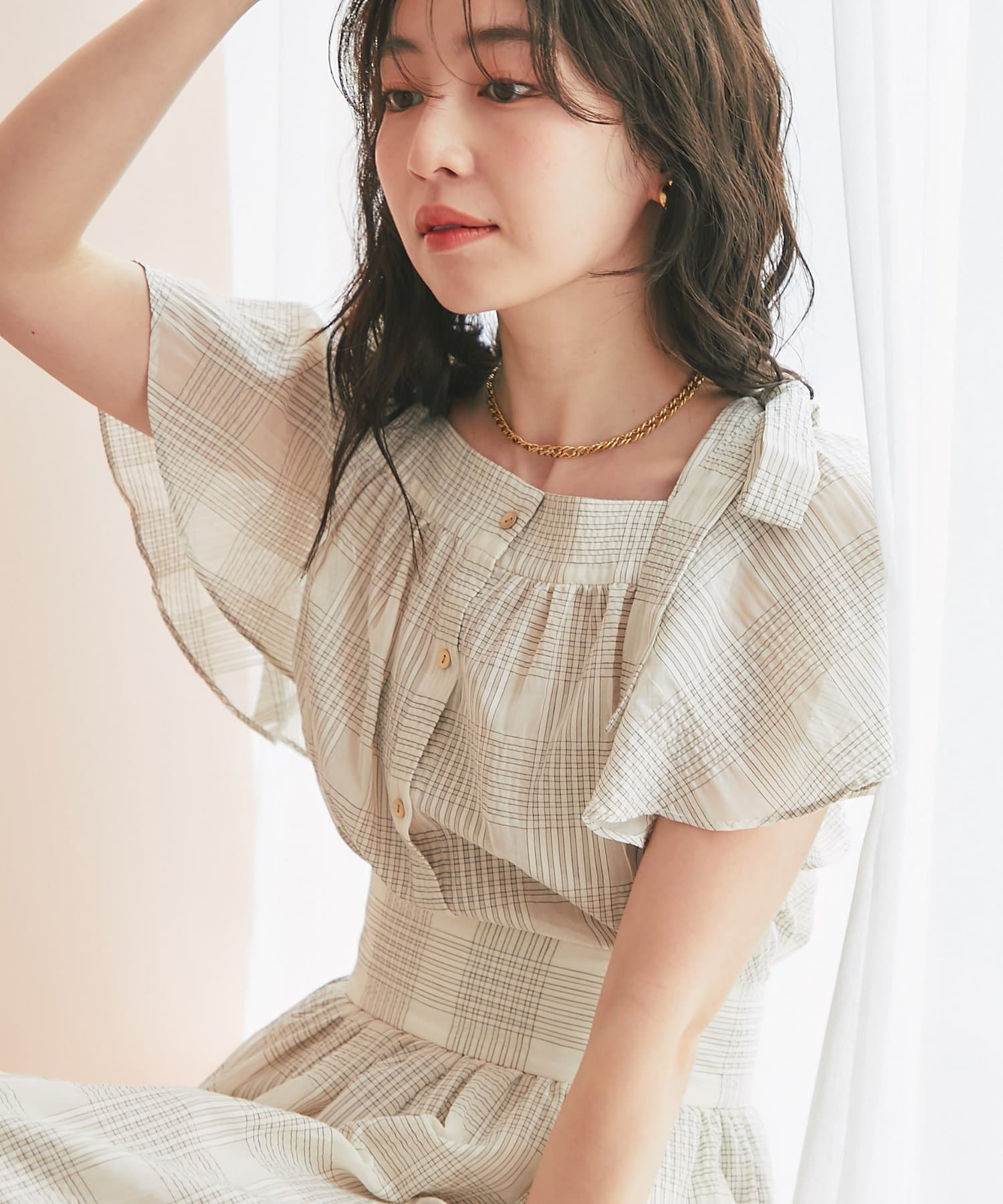 繊細なシアー素材とチェック柄が織りなす、涼しげでフェミニンなブラウス。
