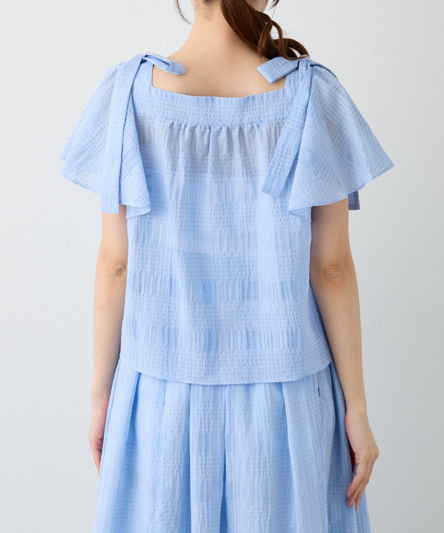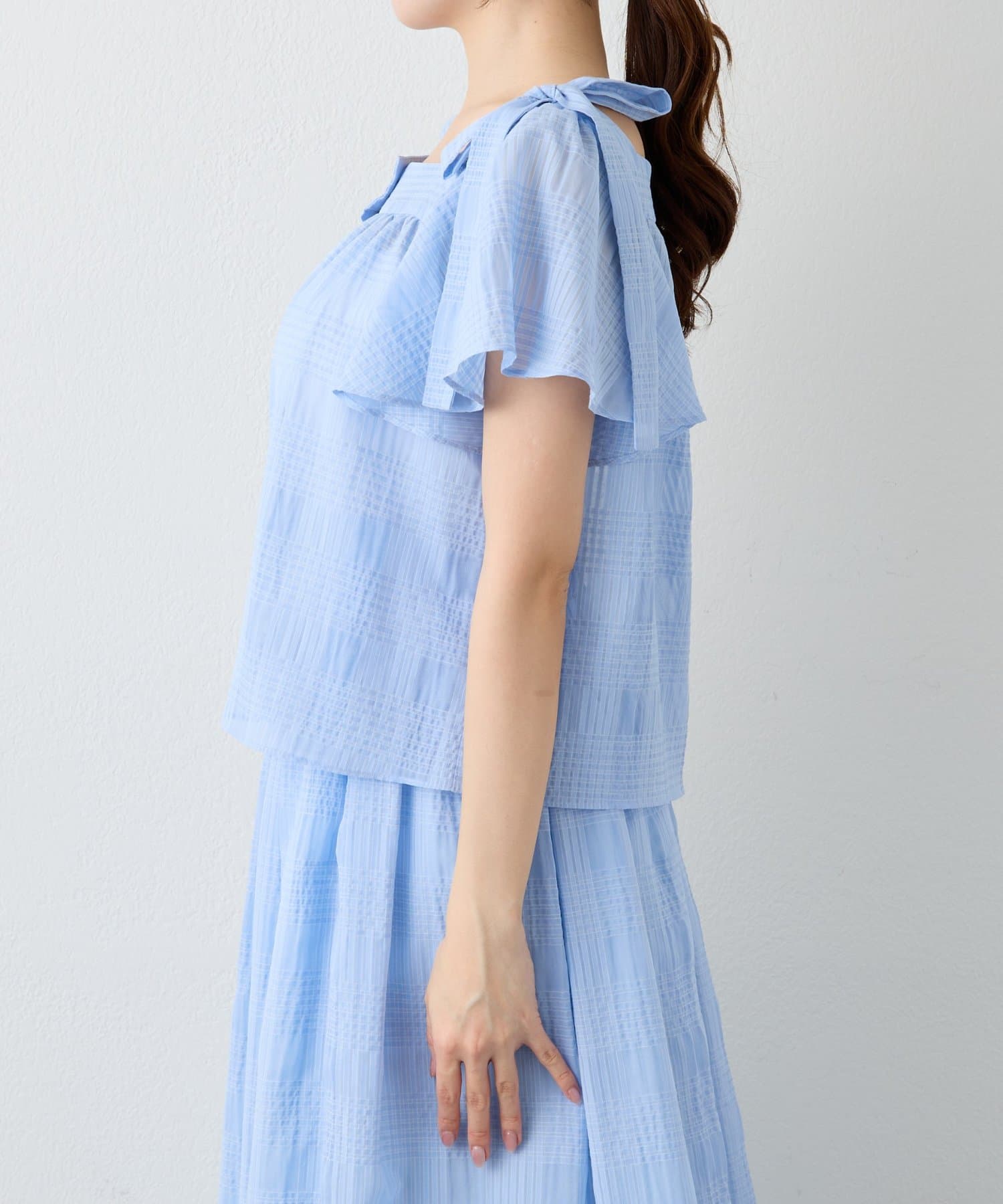 【セットアップ可・お上品愛され】シアーチェックリボンショルダーブラウス