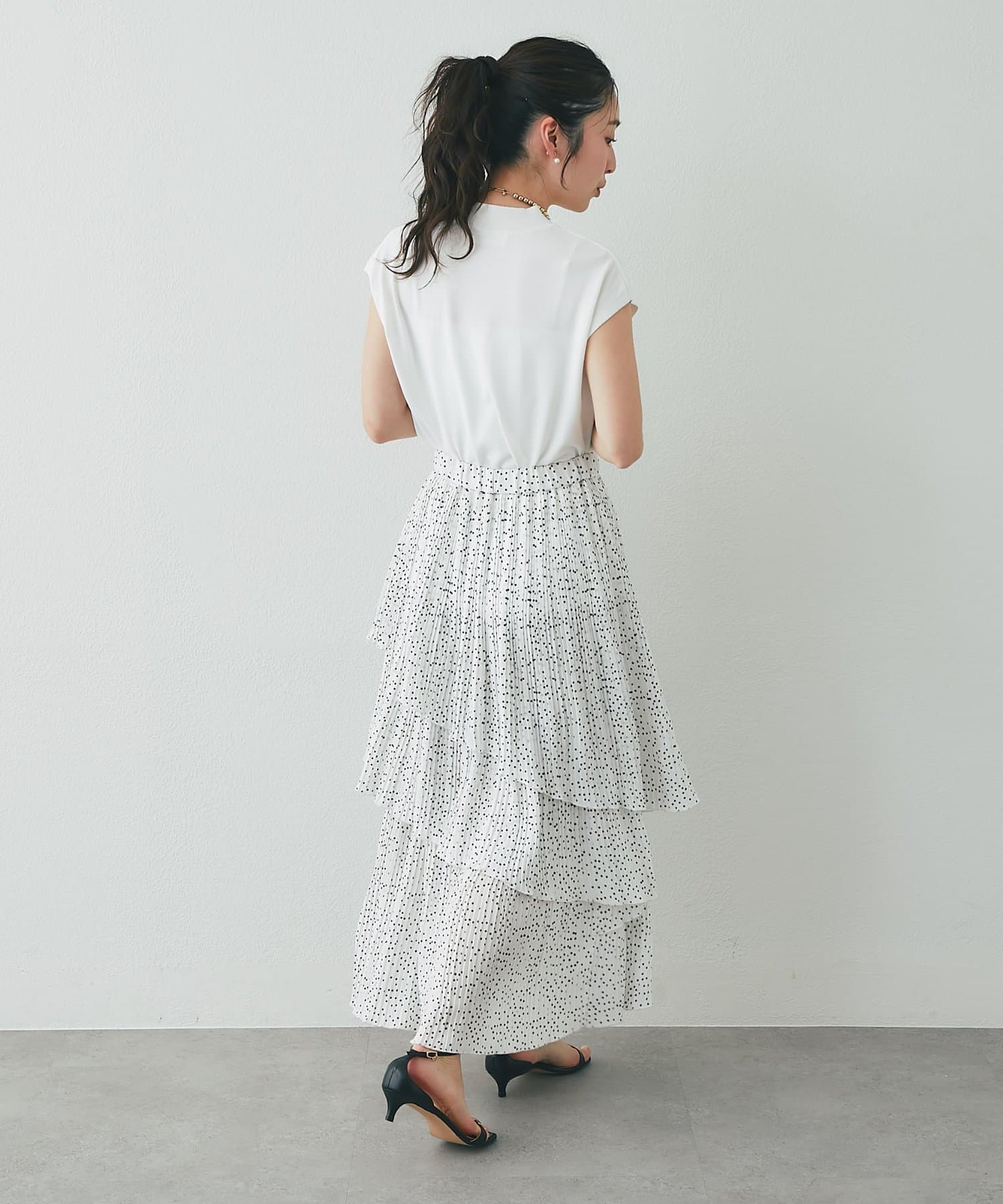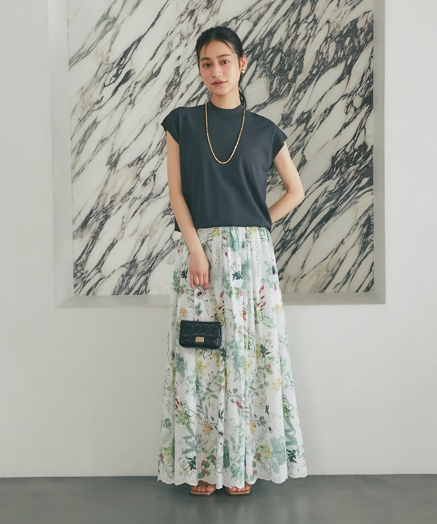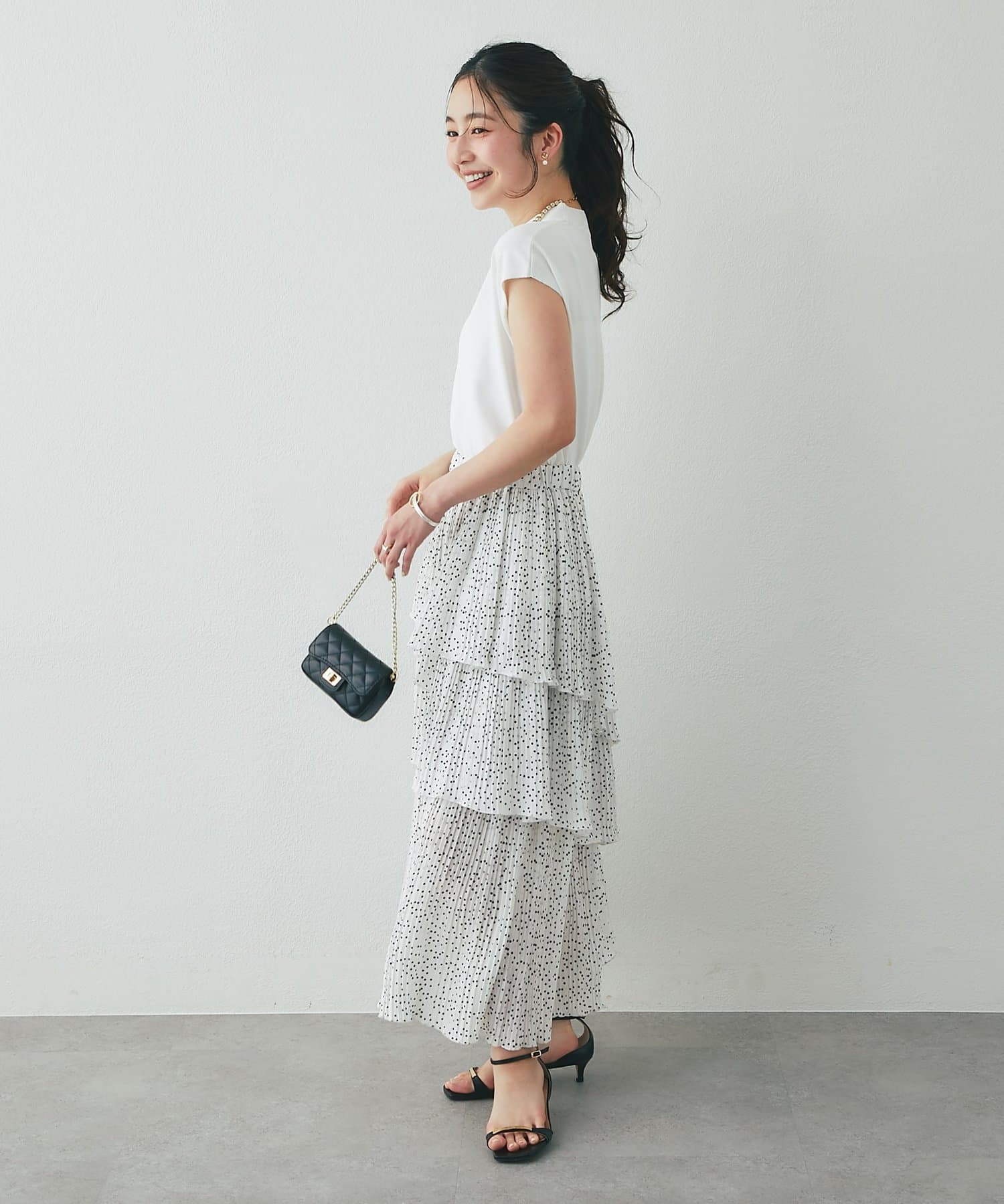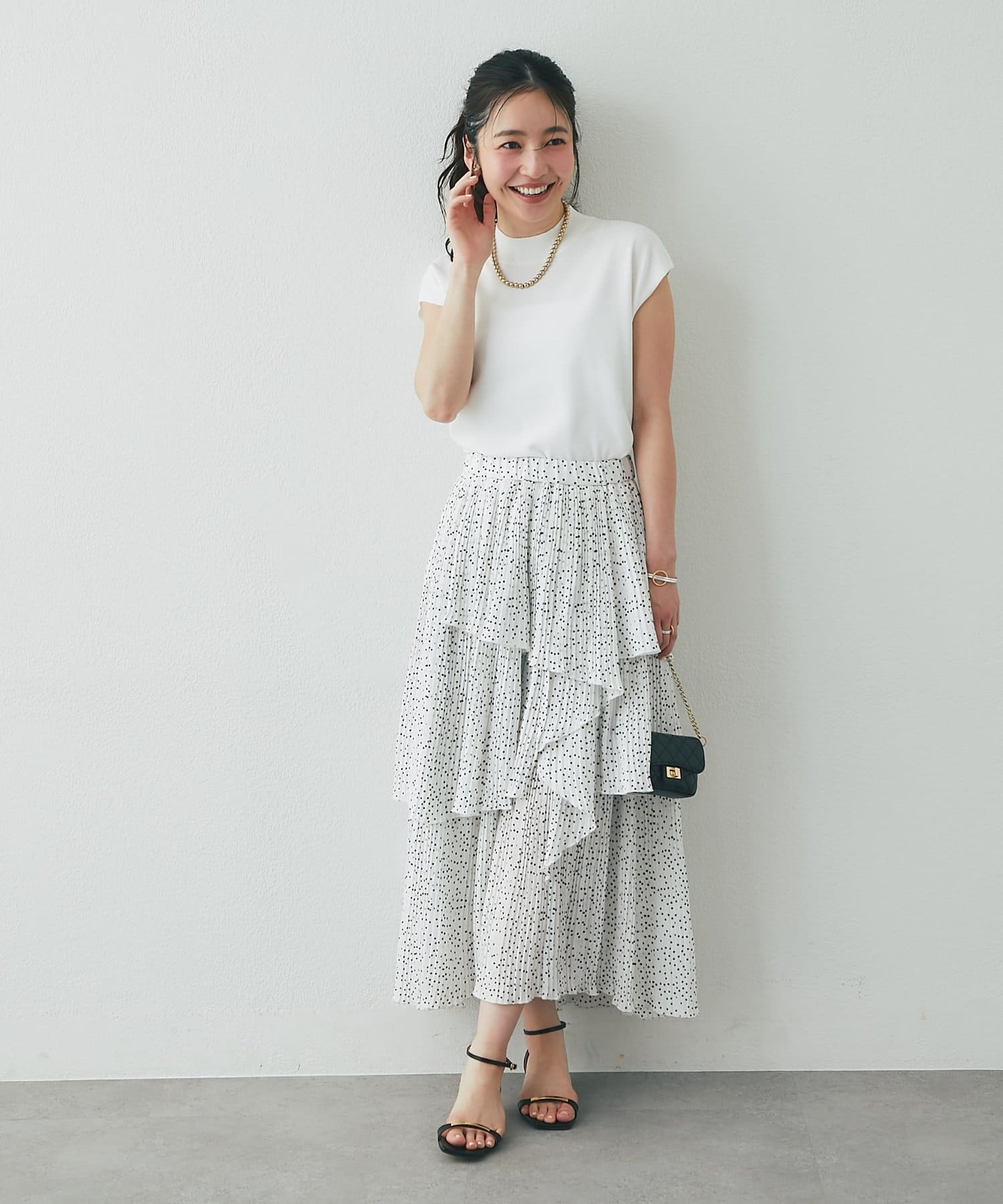 ボリュームのあるスカートに合わせて大人のお出かけスタイルに。